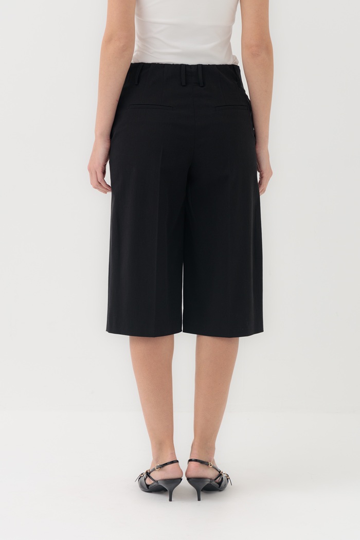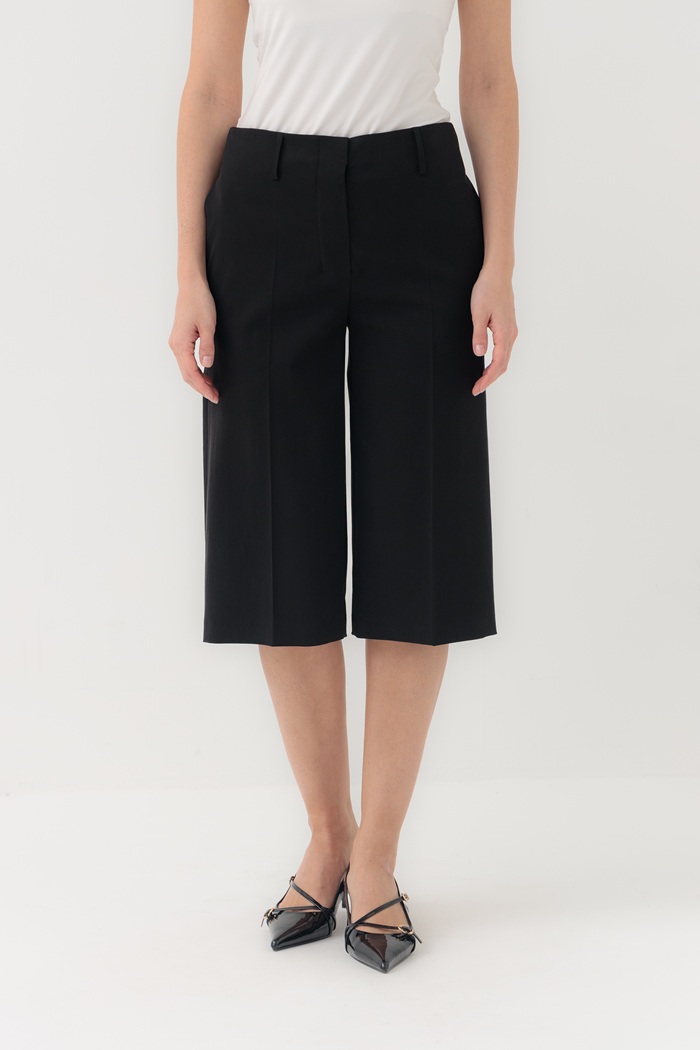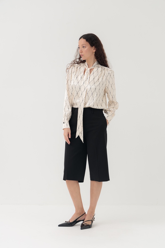 Классические бермуды прямого кроя имеют практичную длину чуть ниже колена и выполнены из уникальной ткани, состоящей из смеси трех натуральных волокон: хлопка, льна и вискозы. Такая комбинация позволяет бермудам мягко прилегать и комфортно сидеть в бедрах. Бермуды можно дополнить блузой или жакетом для классического образа или стилизовать их сольно с футболкой для создания casual образов.