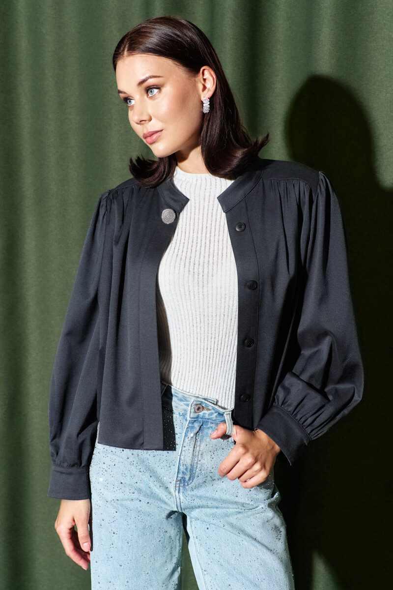 Блузка в стиле city chic выполнена из платьево-блузочного полотна. Модель расширенного силуэта. Горловина стойка. По центру переда — потайная застёжка на петли и декоративные пуговицы. По спинке и переду сборка, направленная от кокетки. Рукава втачные длинные со сборкой вдоль застёгивающейся манжеты. В качестве декора к изделию прилагается съёмная брошь.