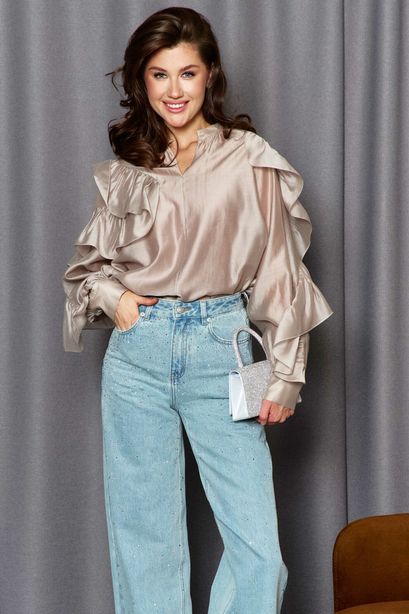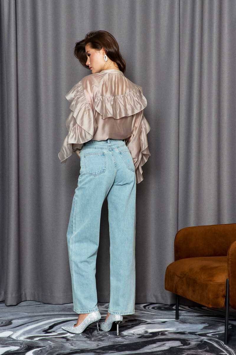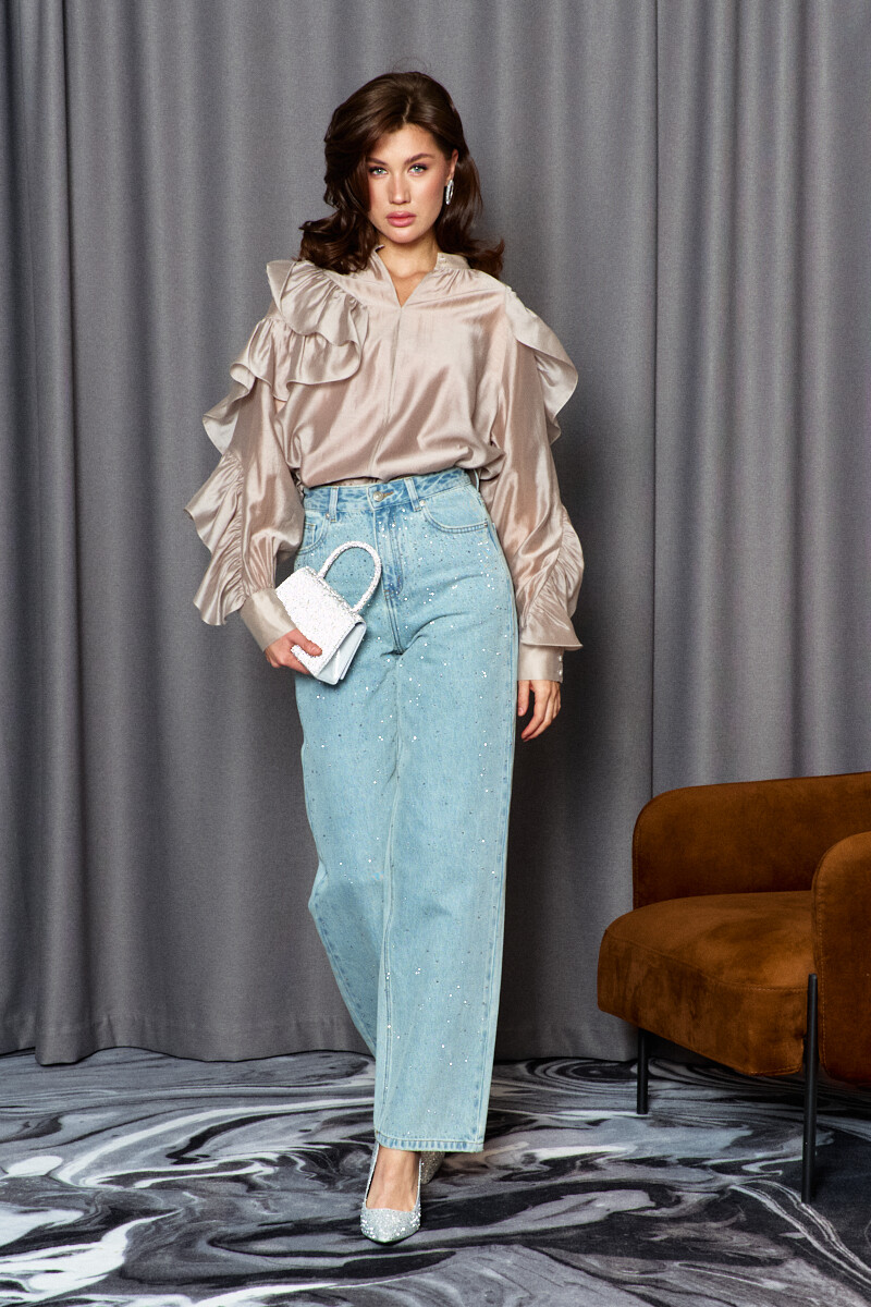 Блузка в стиле city chic выполнена из платьево-блузочного полотна. Модель расширенного силуэта. Горловина – стойка. Перед блузки со средним швом, в котором от горловины выполнен вертикальный разрез. На левом рукаве блузки выполнен фигурный рельеф от плеча до низа, в который вставлена присборенная рюша. Правая часть переда и правый рукав блузки также с фигурными рельефами, в которые вставляется присборенная рюша, переходящая в подрез на спинке блузки. Рукава — длинные реглан со сборкой вдоль застегивающейся манжеты. Модель комплектуется топом из вискозного полотна на регулируемых по длине бретелях.
