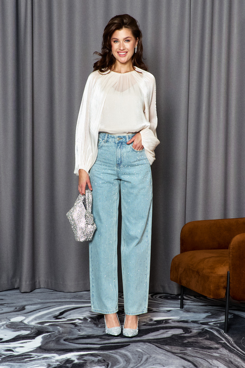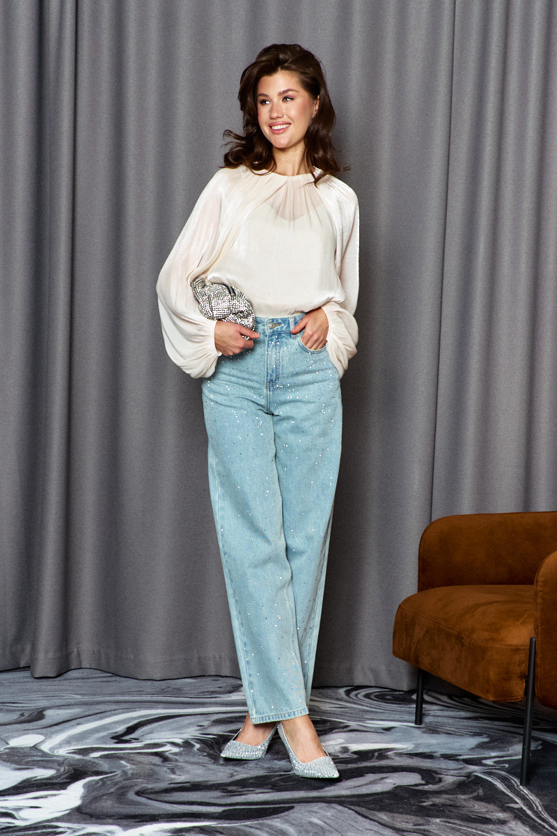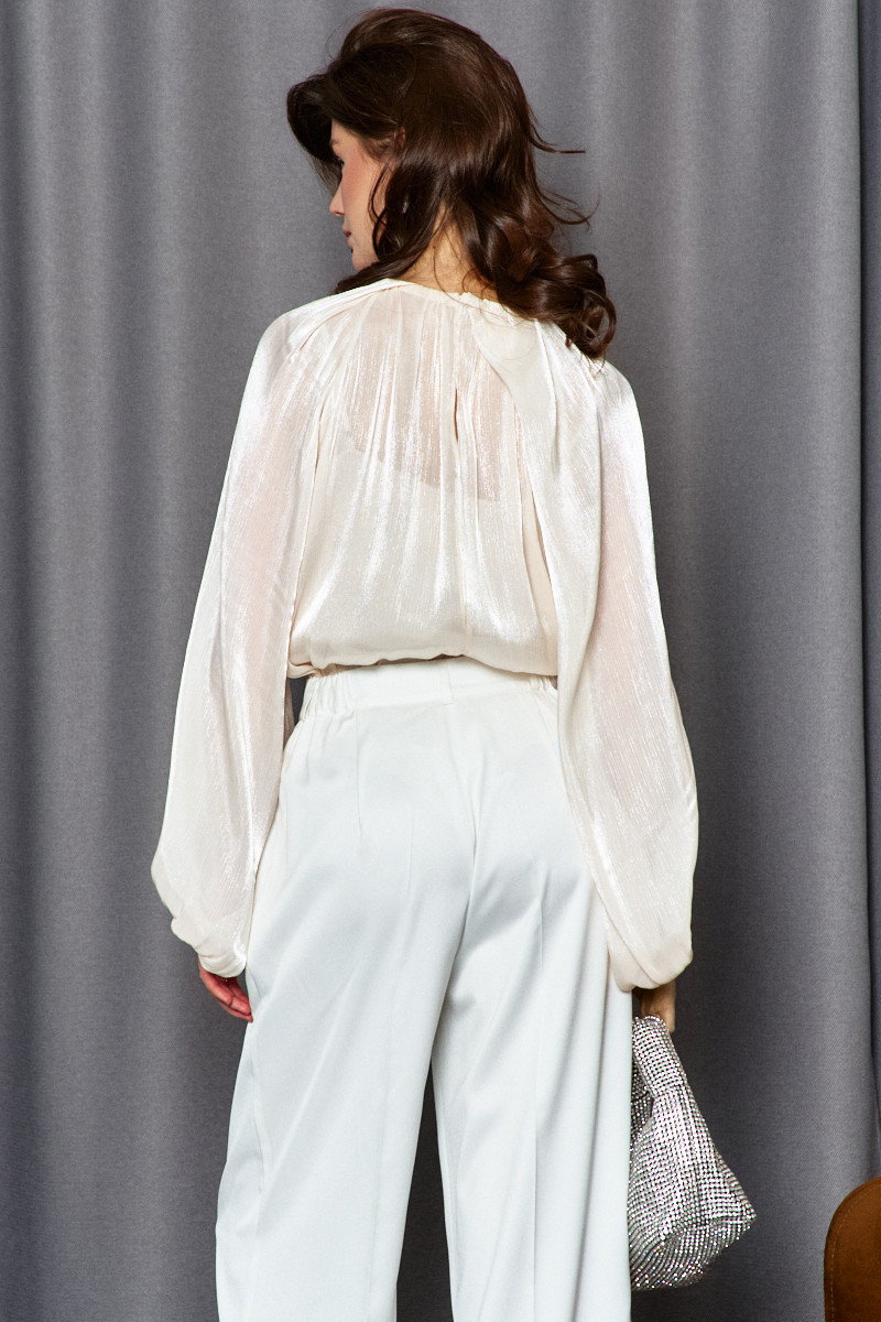 Блузка в стиле City Chic выполнена из полупрозрачного крэш-шифона с благородным блеском. Модель свободного силуэта. Горловина круглой формы с изящной сборкой. Для удобства в носке в среднем шве спинке обработан разрез на навесную петлю и пуговицу. Длинные объемные рукава покроя реглан по верху глубокими складками, переходящими на перед и спинку, и с эластичной тесьмой внизу. Модель комплектуется топом из вискозного полотна на регулируемых по длине бретелях.