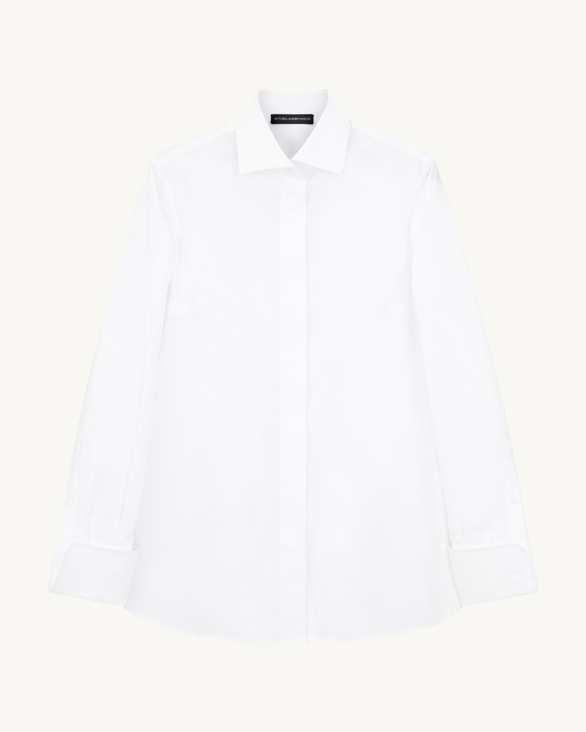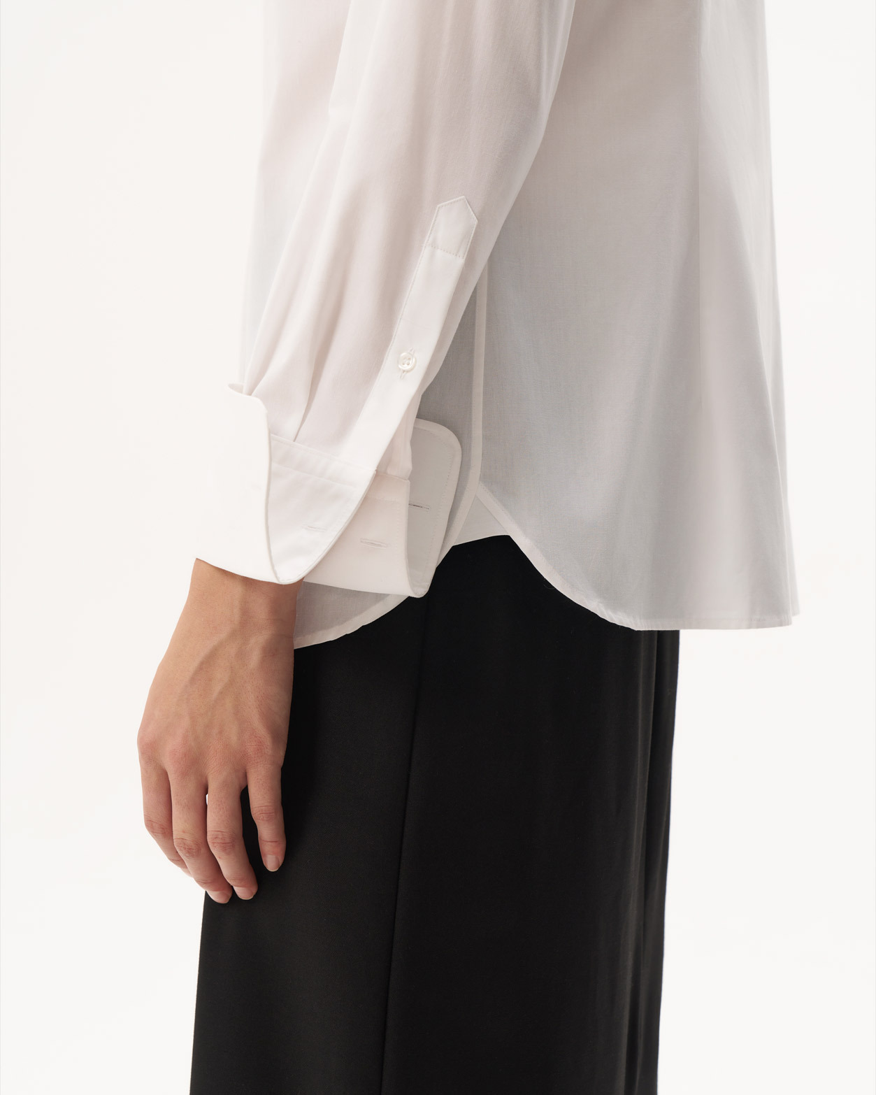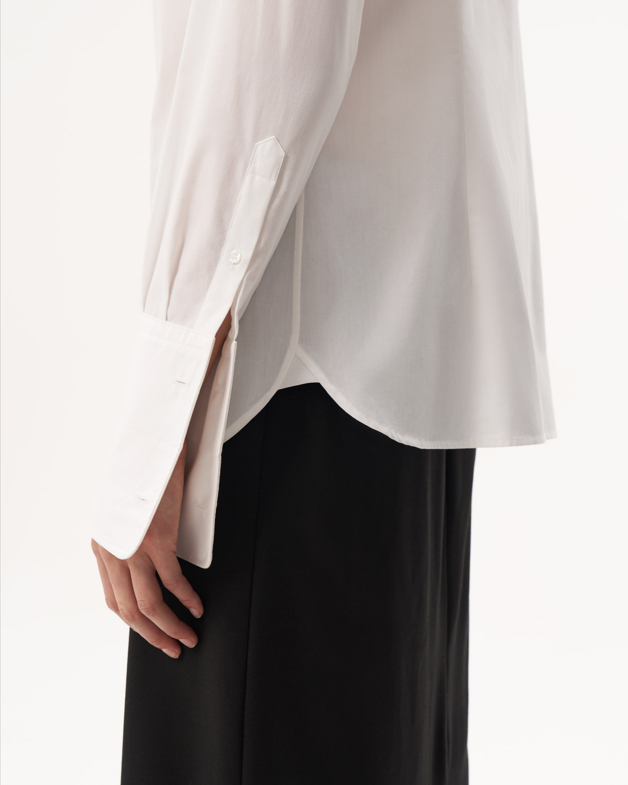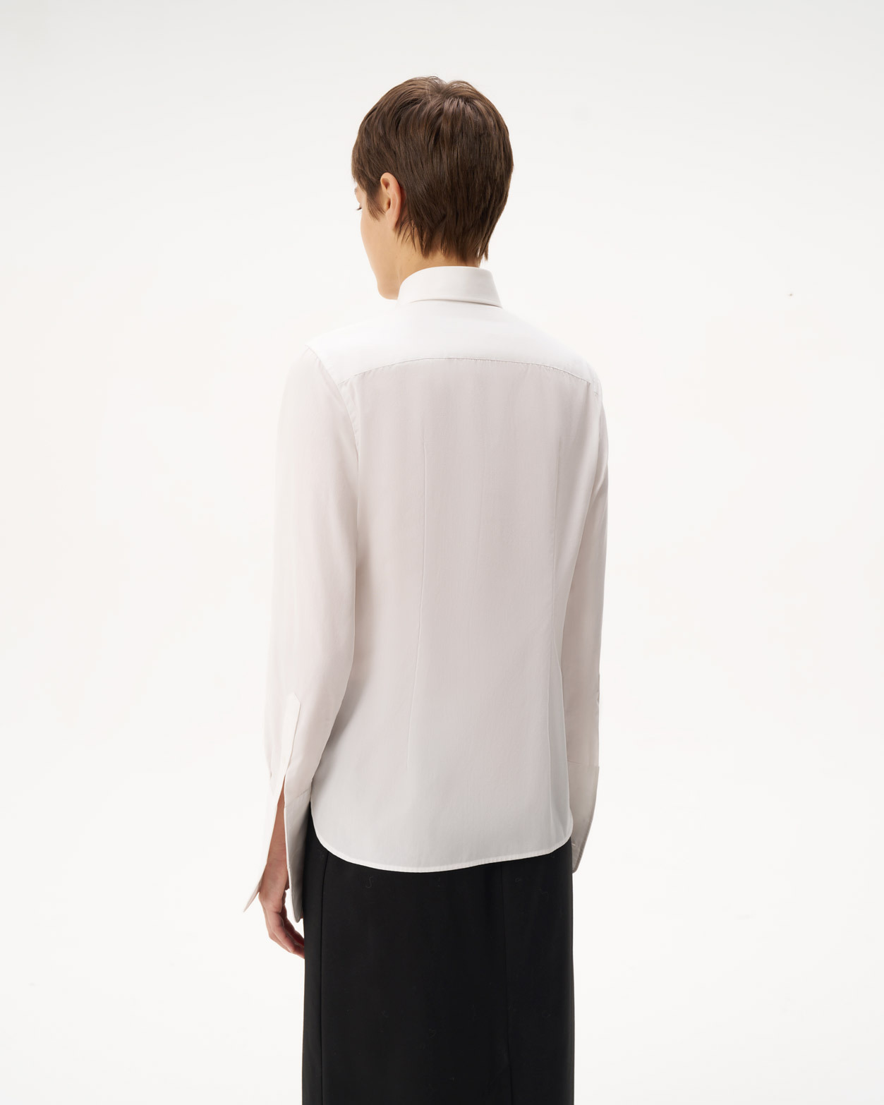 Рубашка полуприлегающего силуэта с нагрудными и талевыми вытачками. Материал – хлопок с небольшим процентом полиэстера – оптимален для рубашек, за ним легко ухаживать. Отложной воротник и жёсткий манжет на запонки, как на мужских рубашках – в лучших традициях делового и вечернего гардероба.