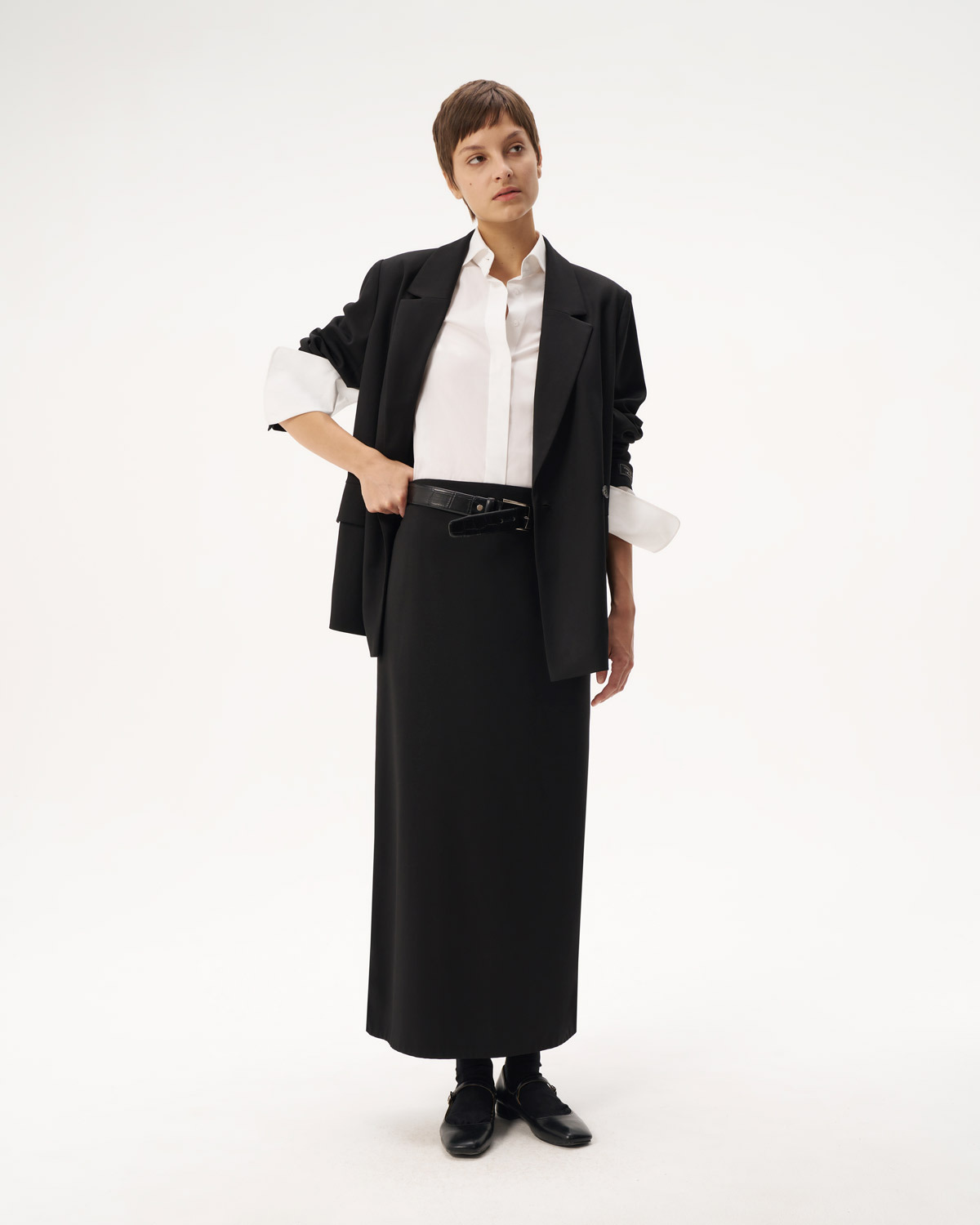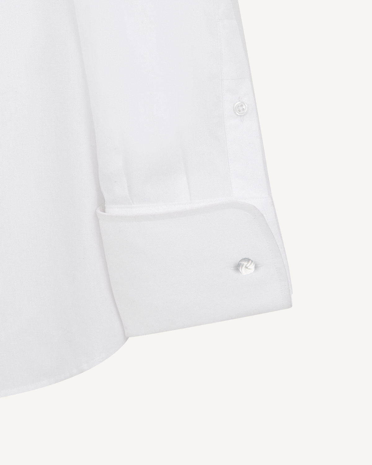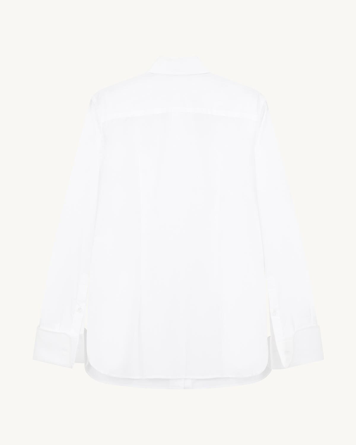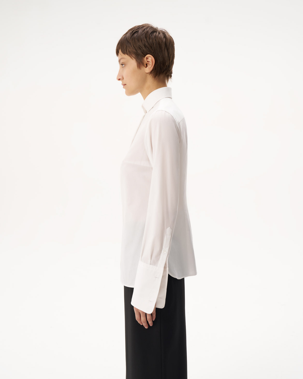 Рубашка полуприлегающего силуэта с нагрудными и талевыми вытачками. Материал – хлопок с небольшим процентом полиэстера – оптимален для рубашек, за ним легко ухаживать. Отложной воротник и жёсткий манжет на запонки, как на мужских рубашках – в лучших традициях делового и вечернего гардероба.