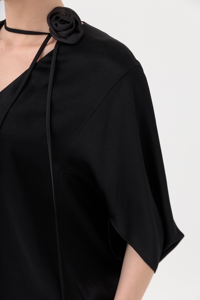 Блуза Алькамо из черного шелковистого атласа интересного (экстравагантного) мягкого силуэта. Акцентная деталь в виде завязки с розочкой создает запоминающий образ.