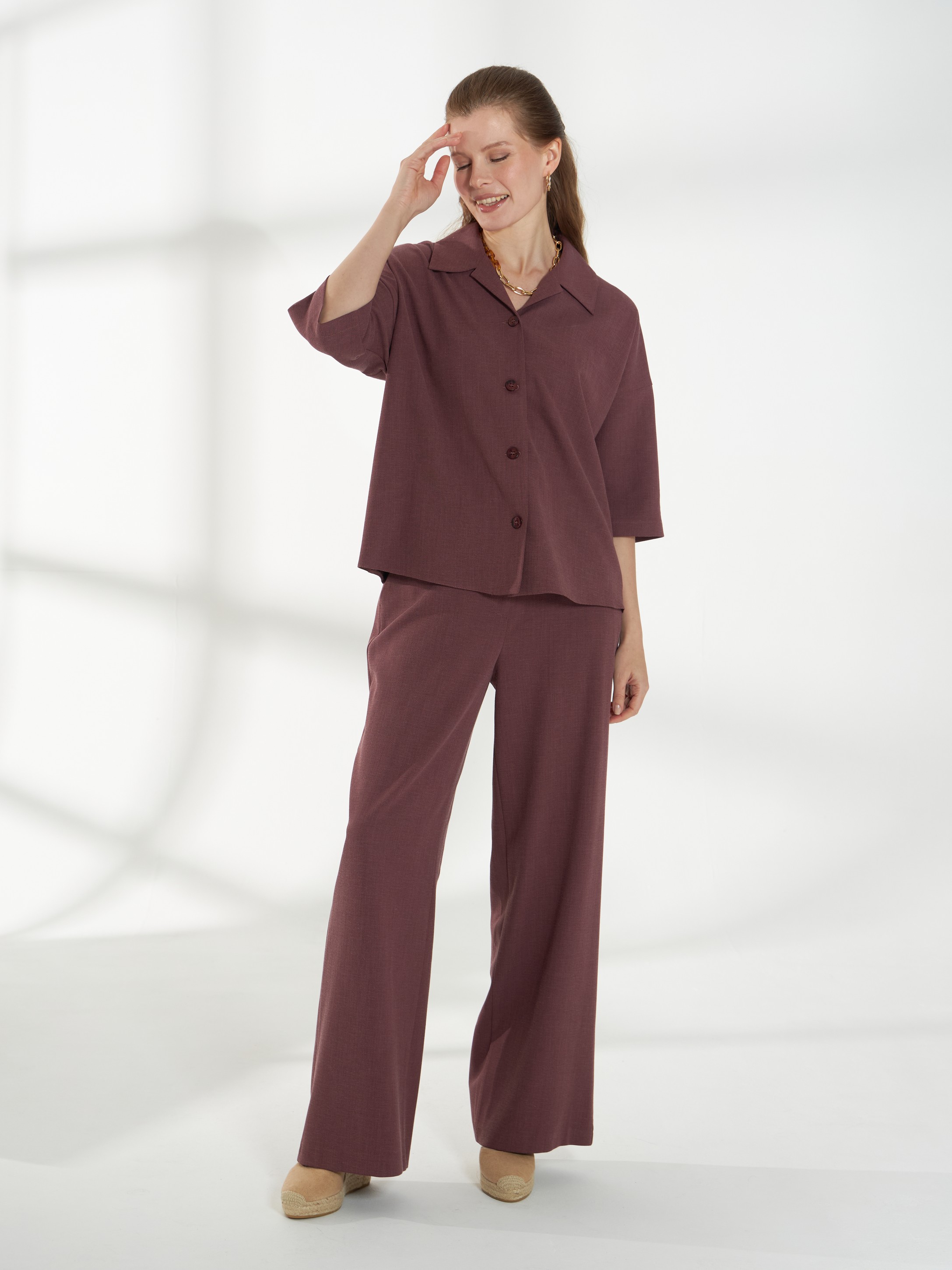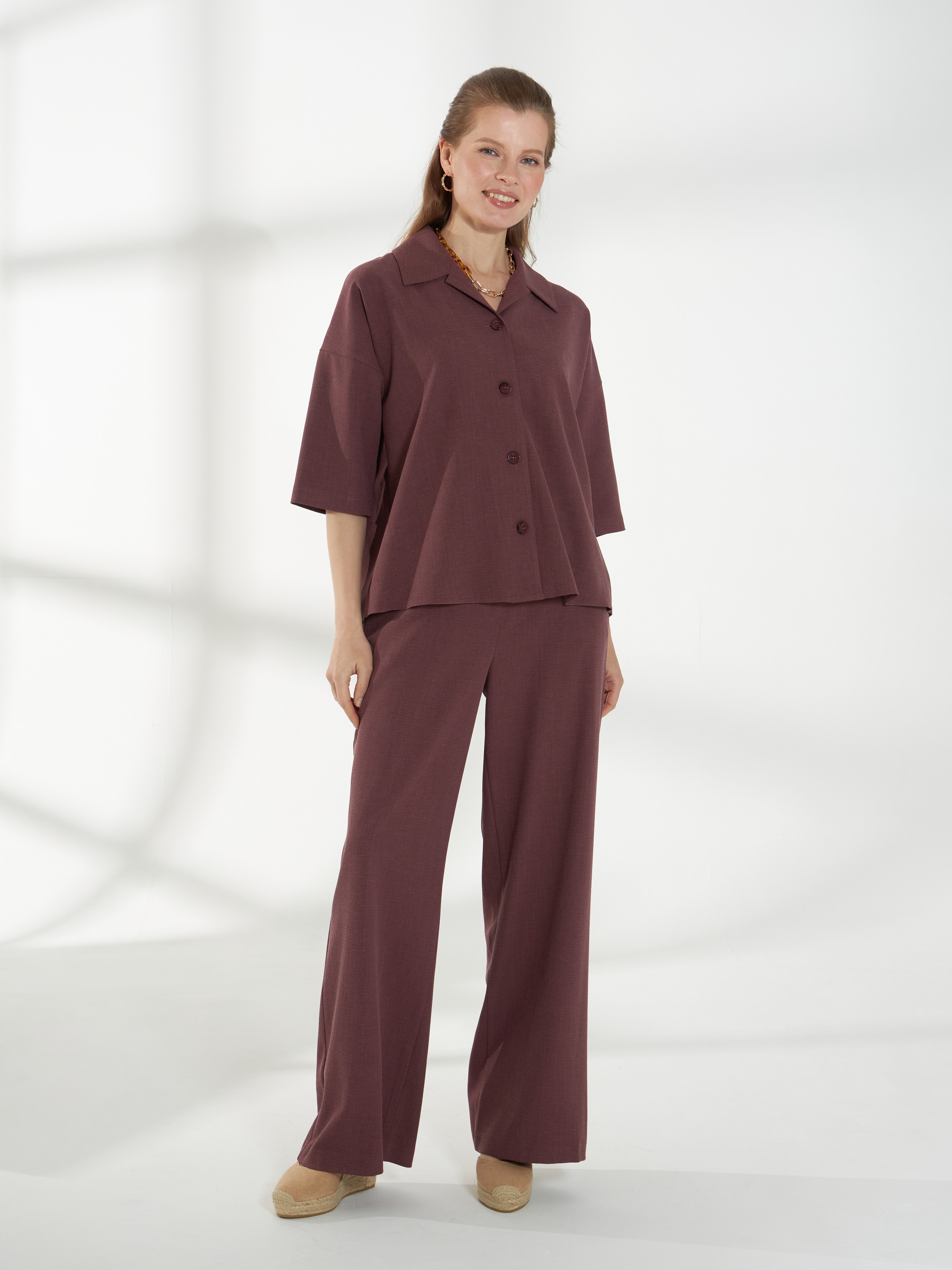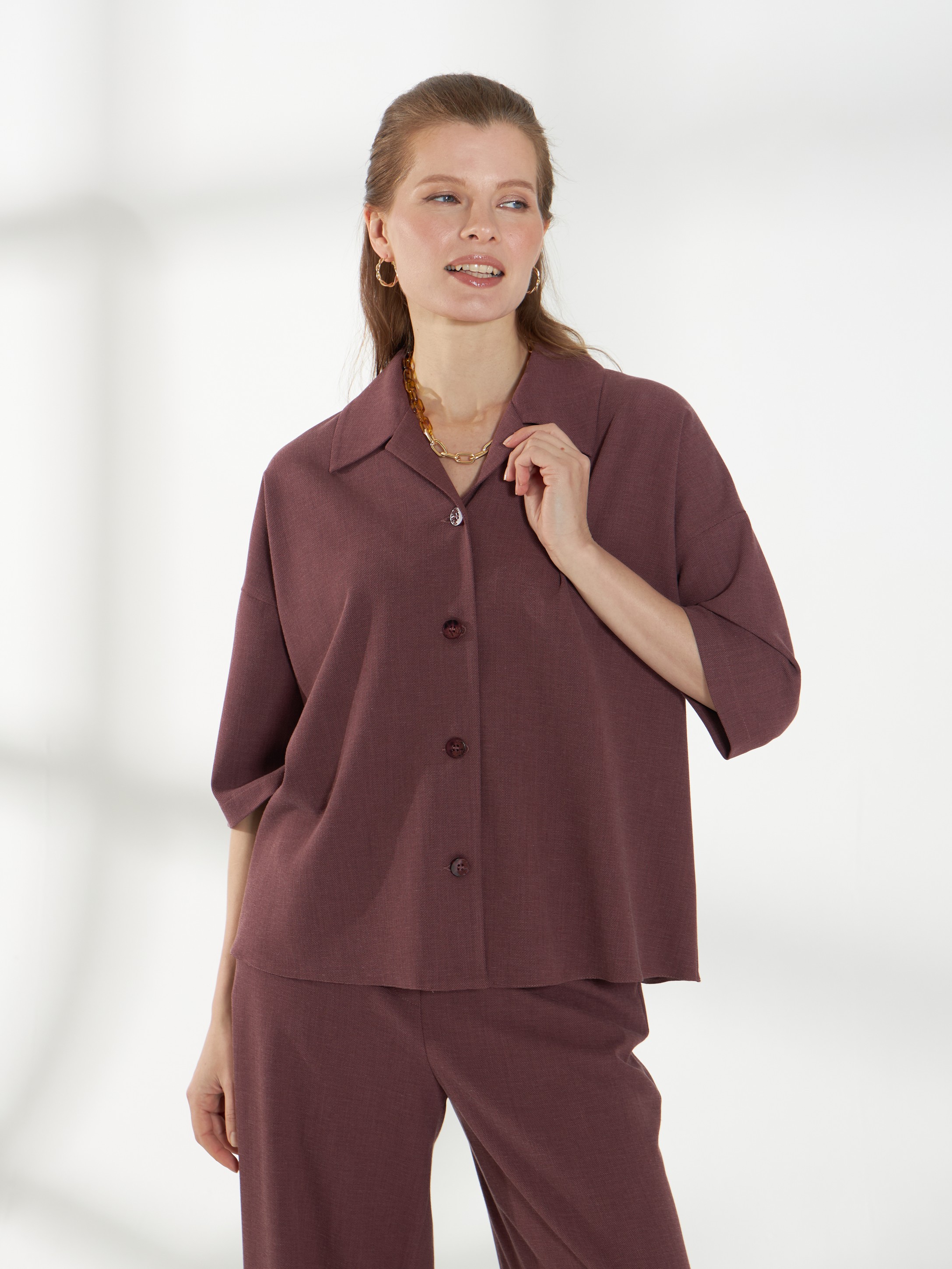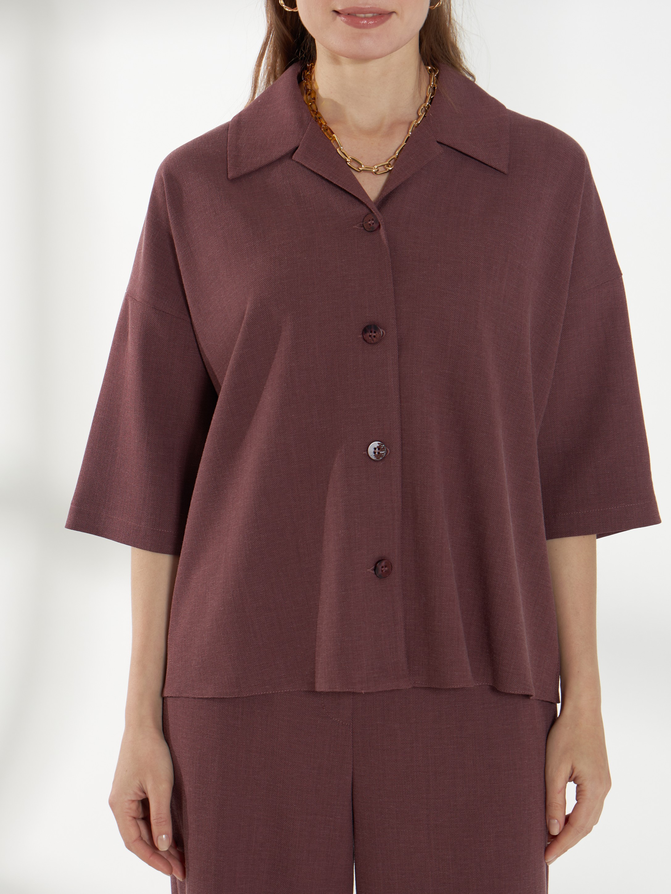 Свободная блуза, со спущенной линией плеча и короткими рукавами, из дышащей и пластичной ткани. Классический воротник и застежка на пуговицы сохраняют аккуратность силуэта. Винный оттенок добавляет глубины и элегантности образу, а свободный крой обеспечивает комфорт в течение дня.