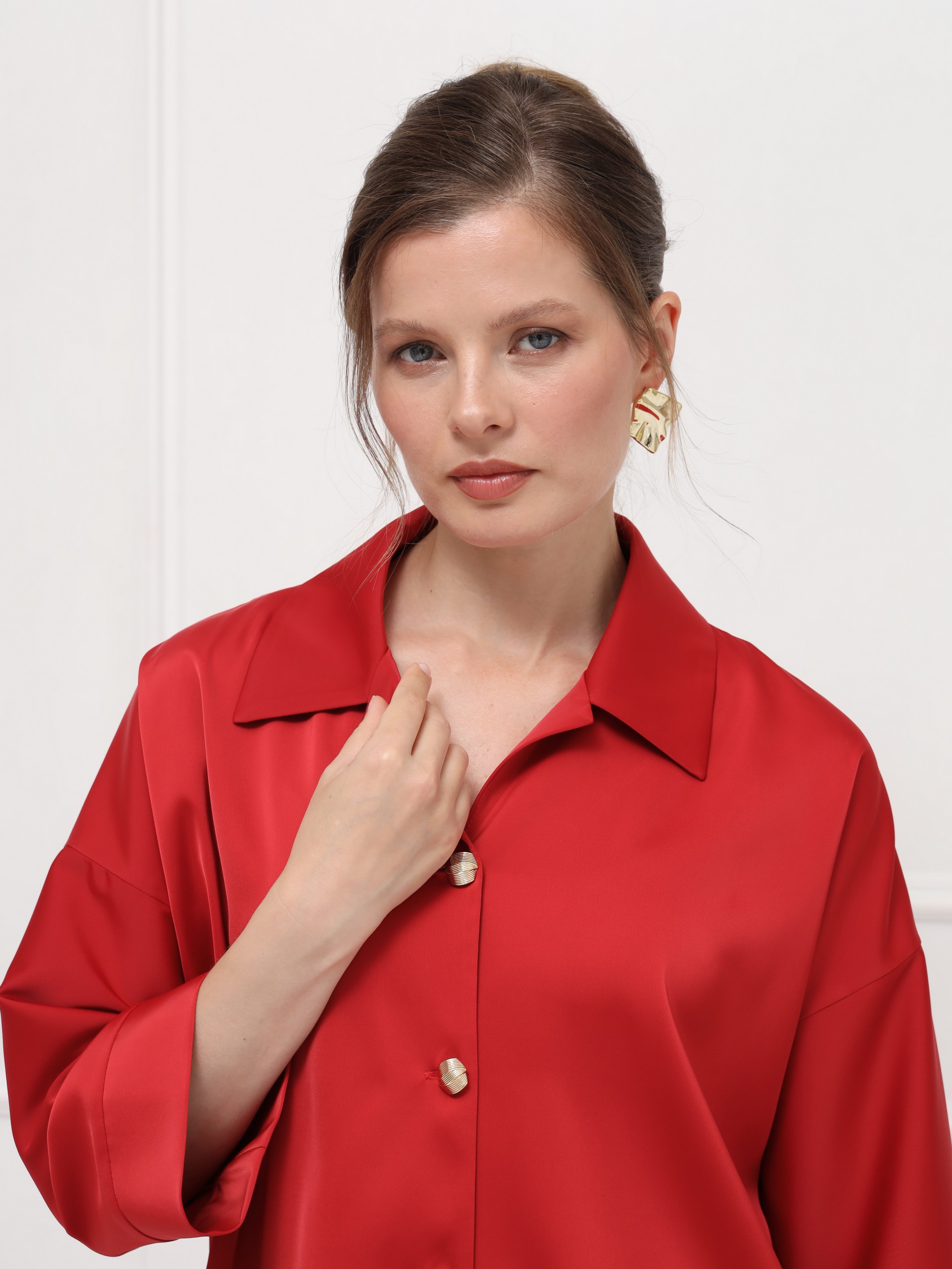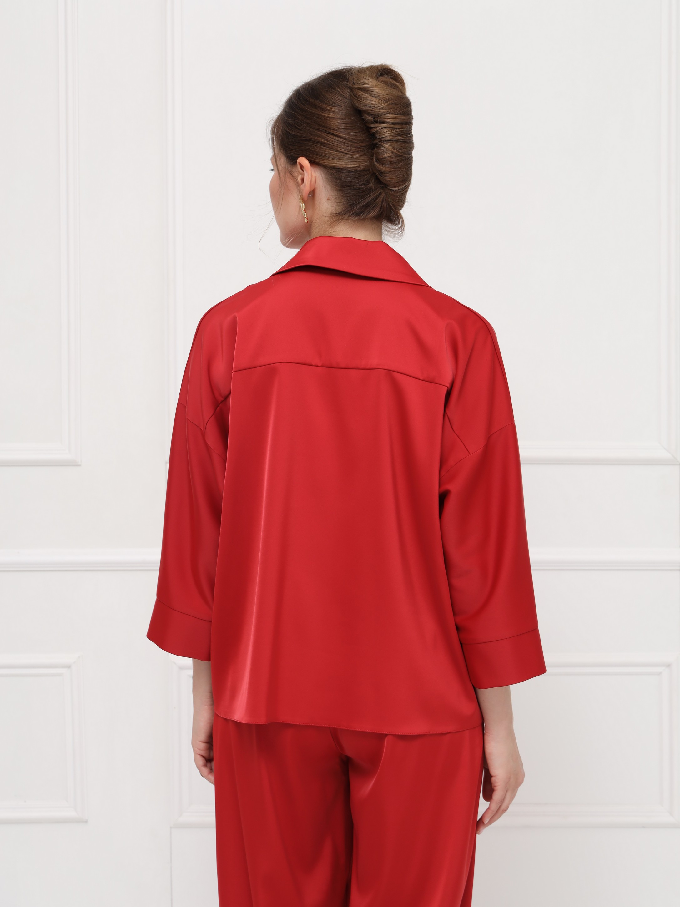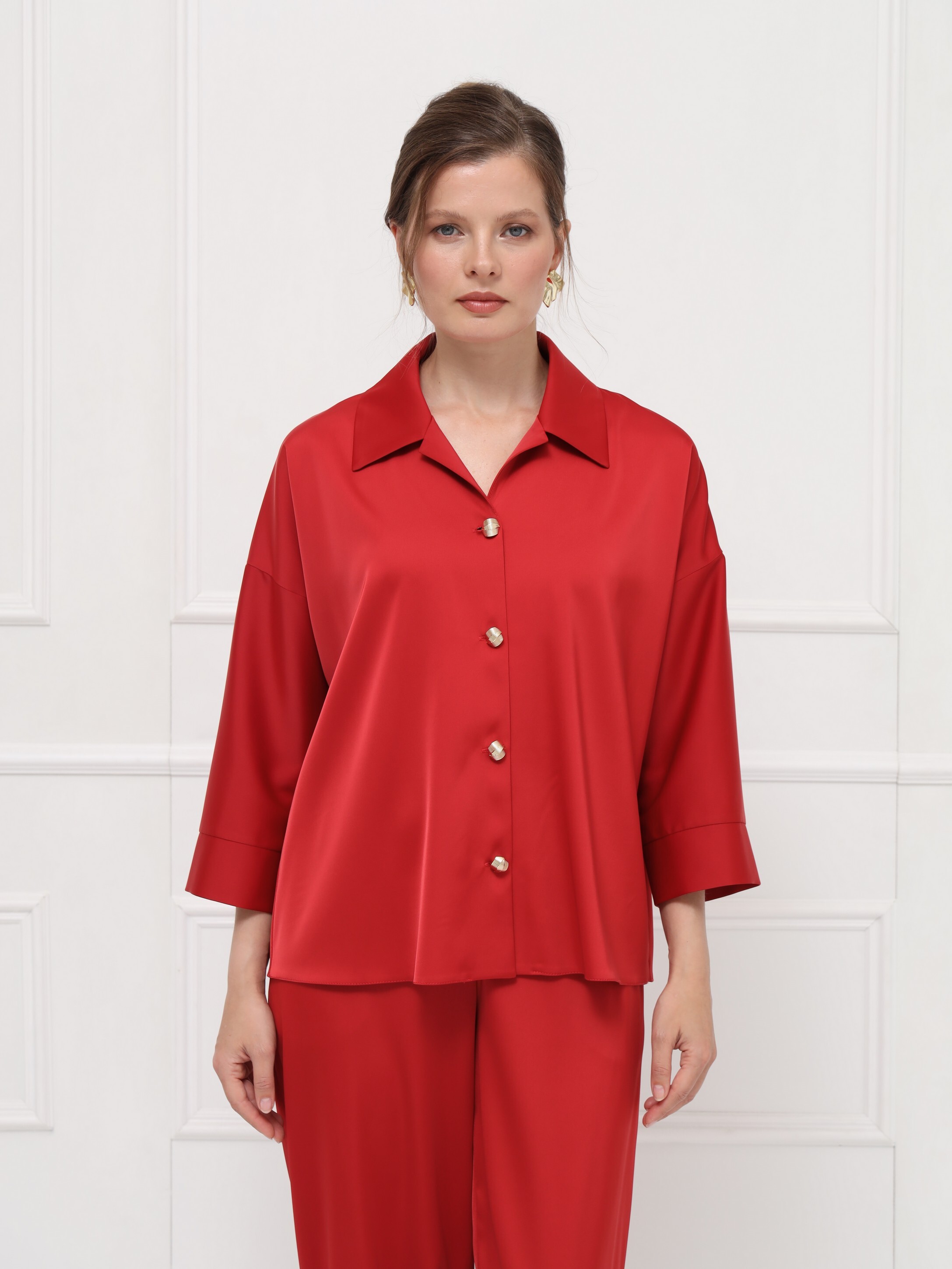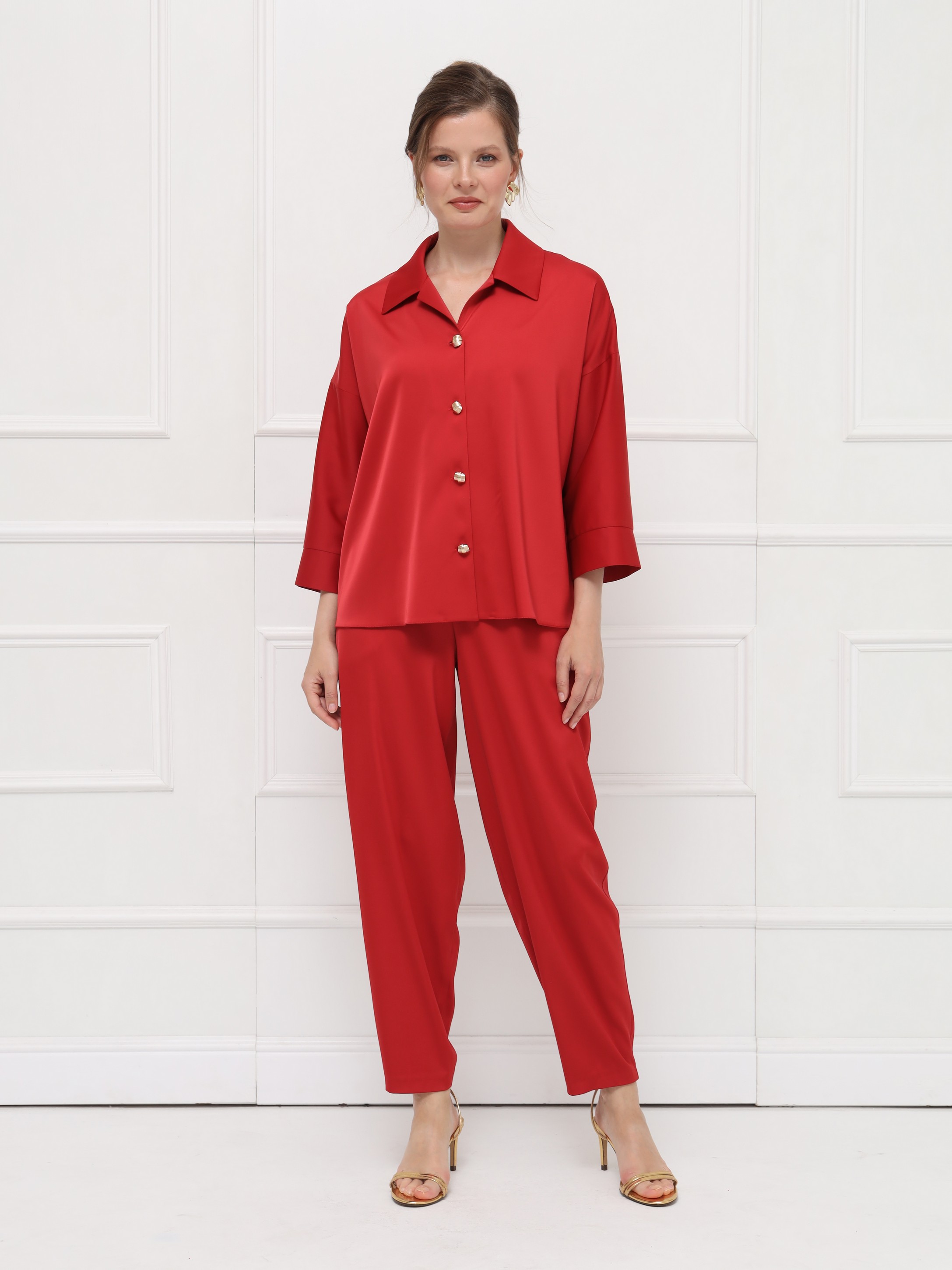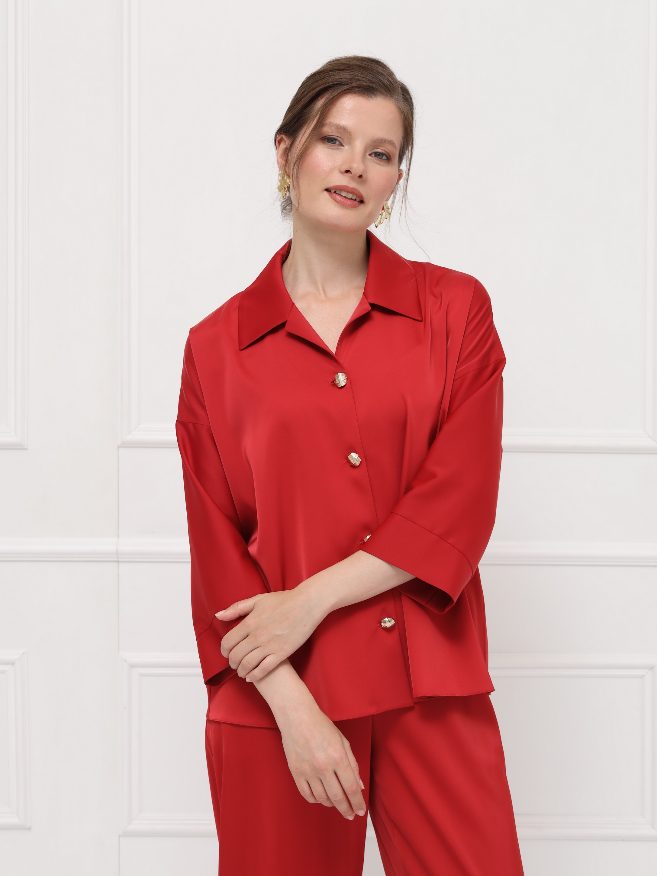 Эффектная блуза из атласа станет ярким акцентом вашего образа. Глубокий оттенок «ретро красный» придаёт образу выразительность и делает его по-настоящему запоминающимся. Отложной воротник с маленькими лацканами и мягкая линия плеча создают женственный силуэт, а рукава на широких манжетах и изящные пуговицы добавляют утончённости.