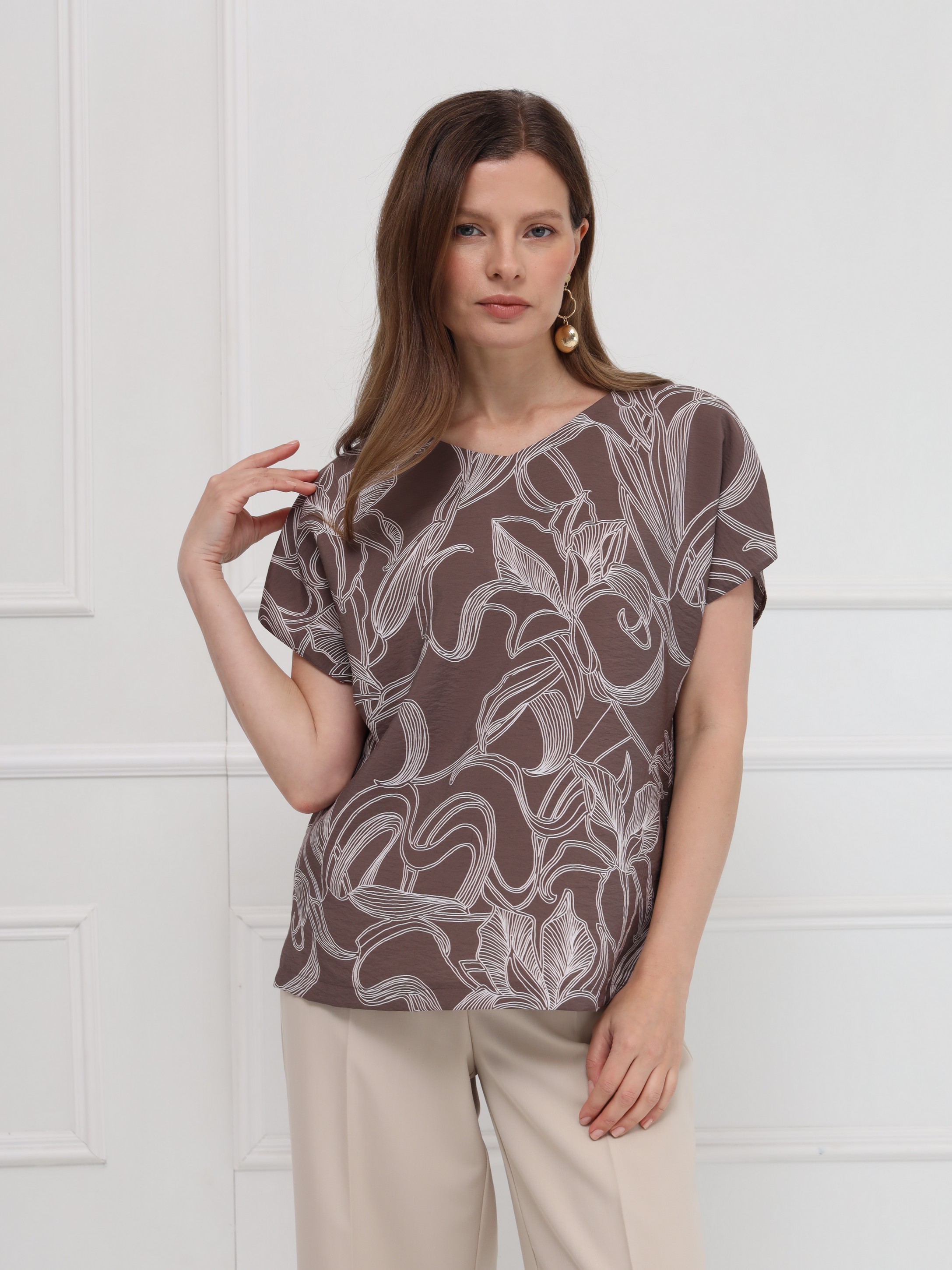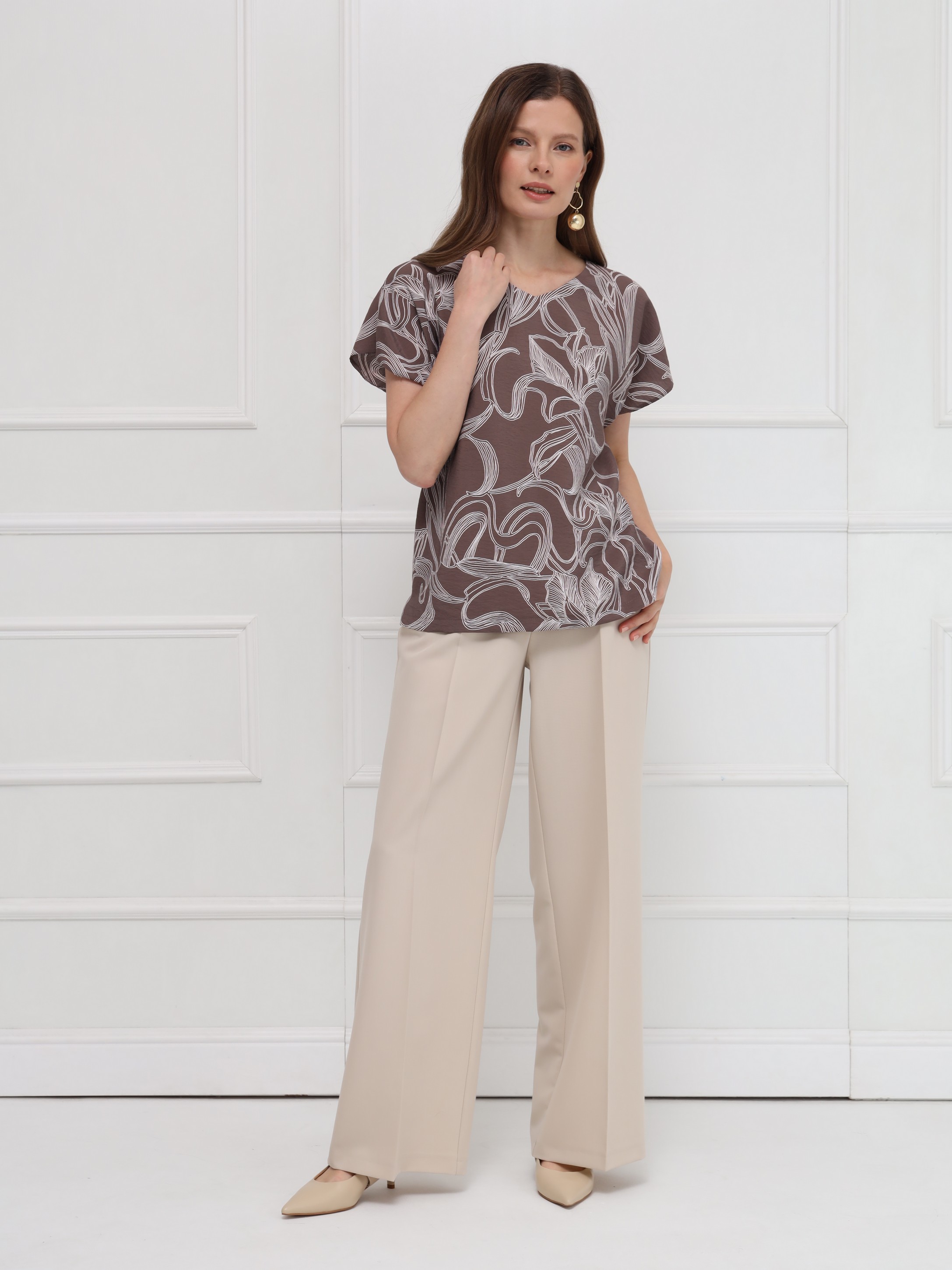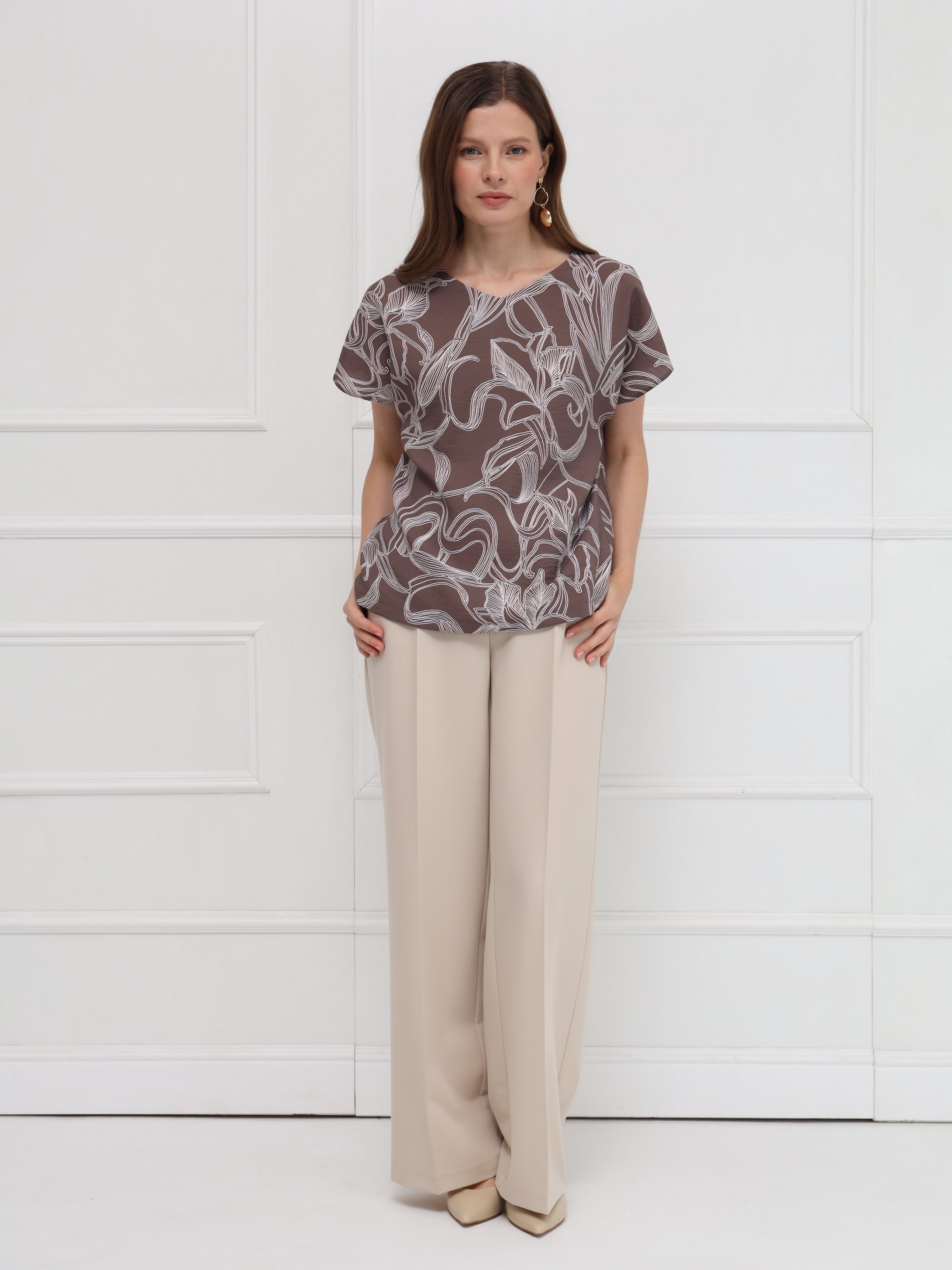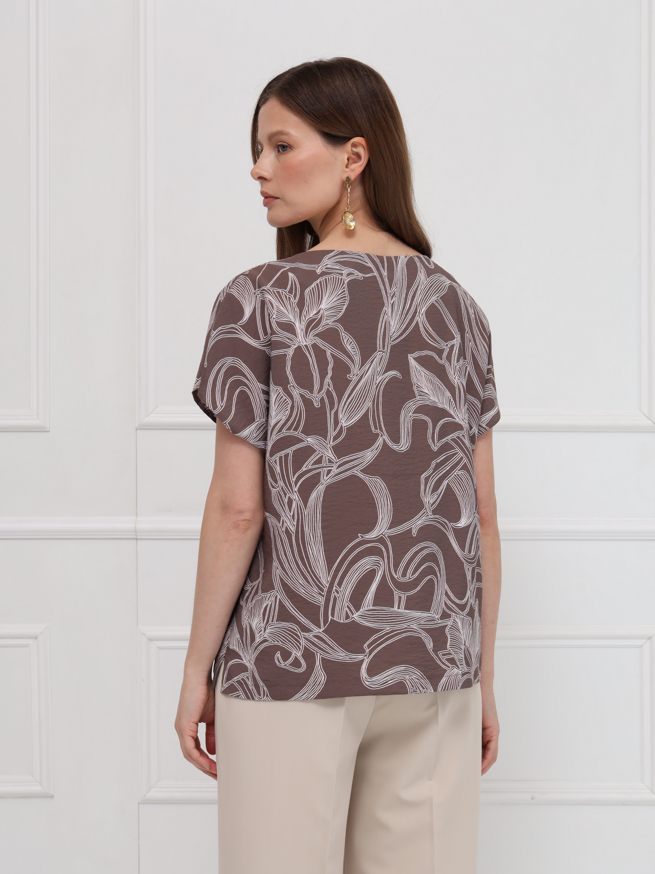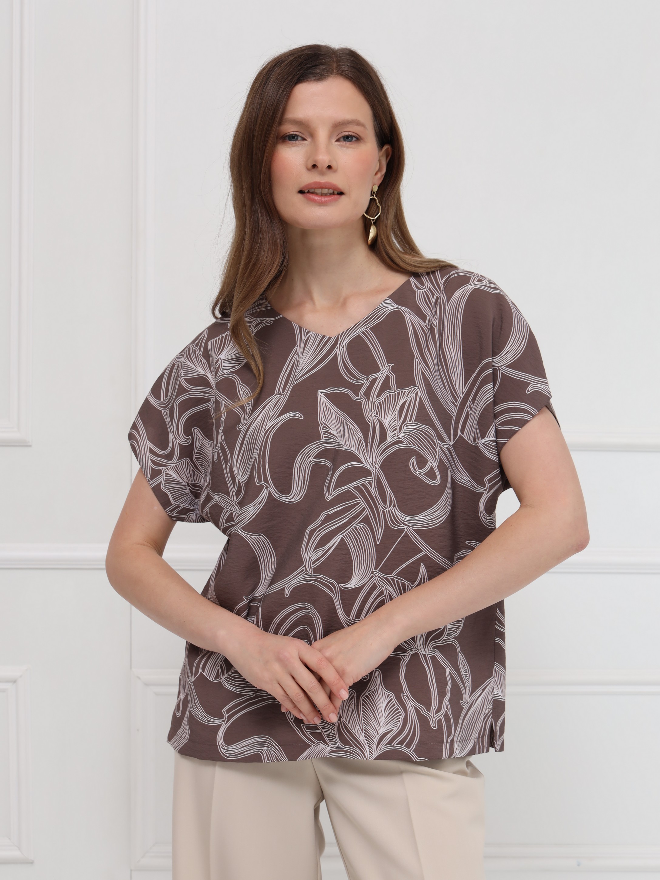 Блузка выполнена из лёгкой вискозной ткани, украшенной тонким изысканным цветочным принтом. Прямой силуэт обеспечивает свободную посадку и подчёркивает чистоту линий. Вырез в форме сердечка мягко оформляет зону декольте, добавляя образу аккуратную женственность. Короткие цельнокроеные рукава создают плавный, цельный контур, а небольшие разрезы по бокам внизу делают модель более подвижной и комфортной. Блузка выглядит сдержанно и элегантно.