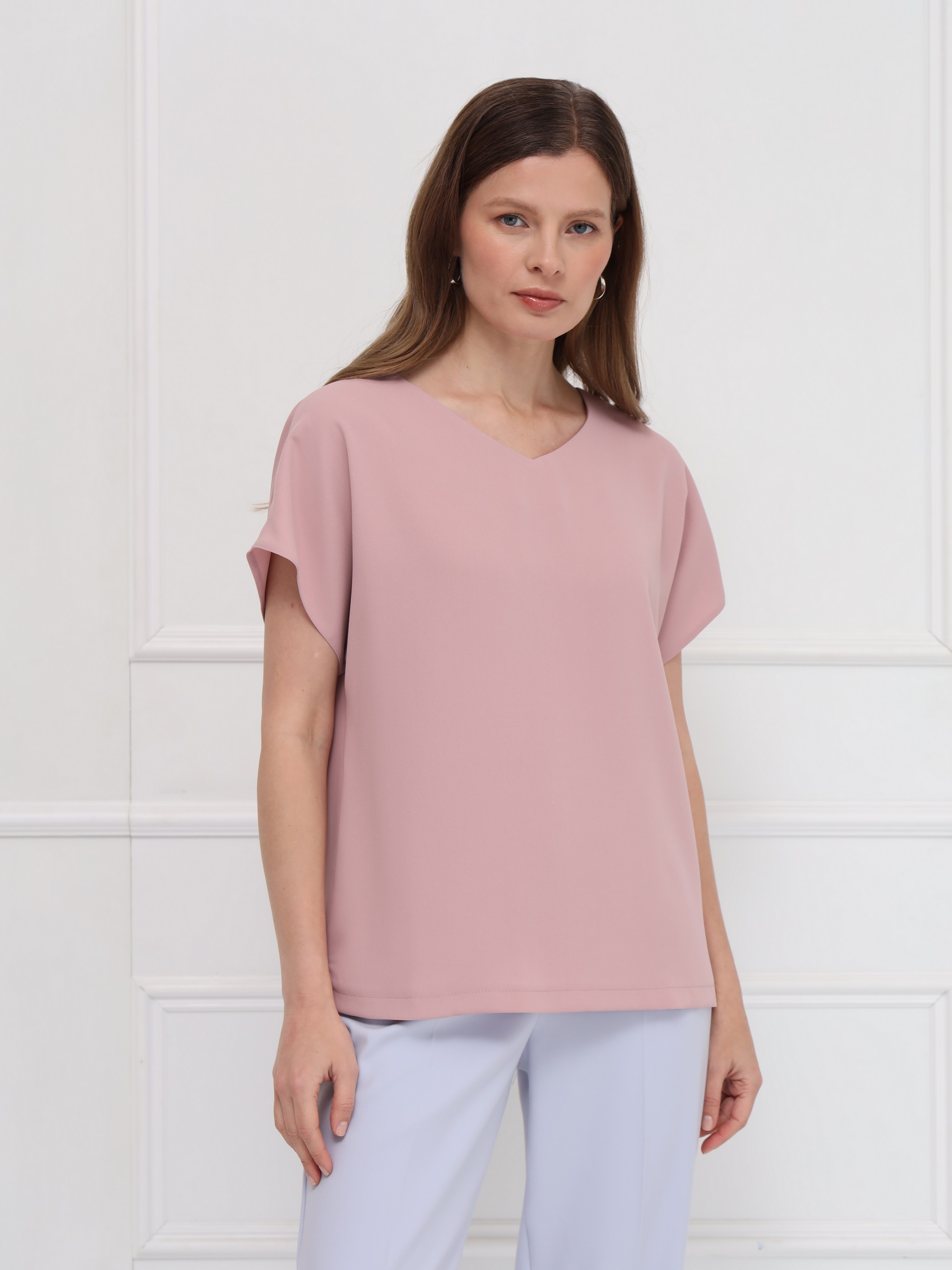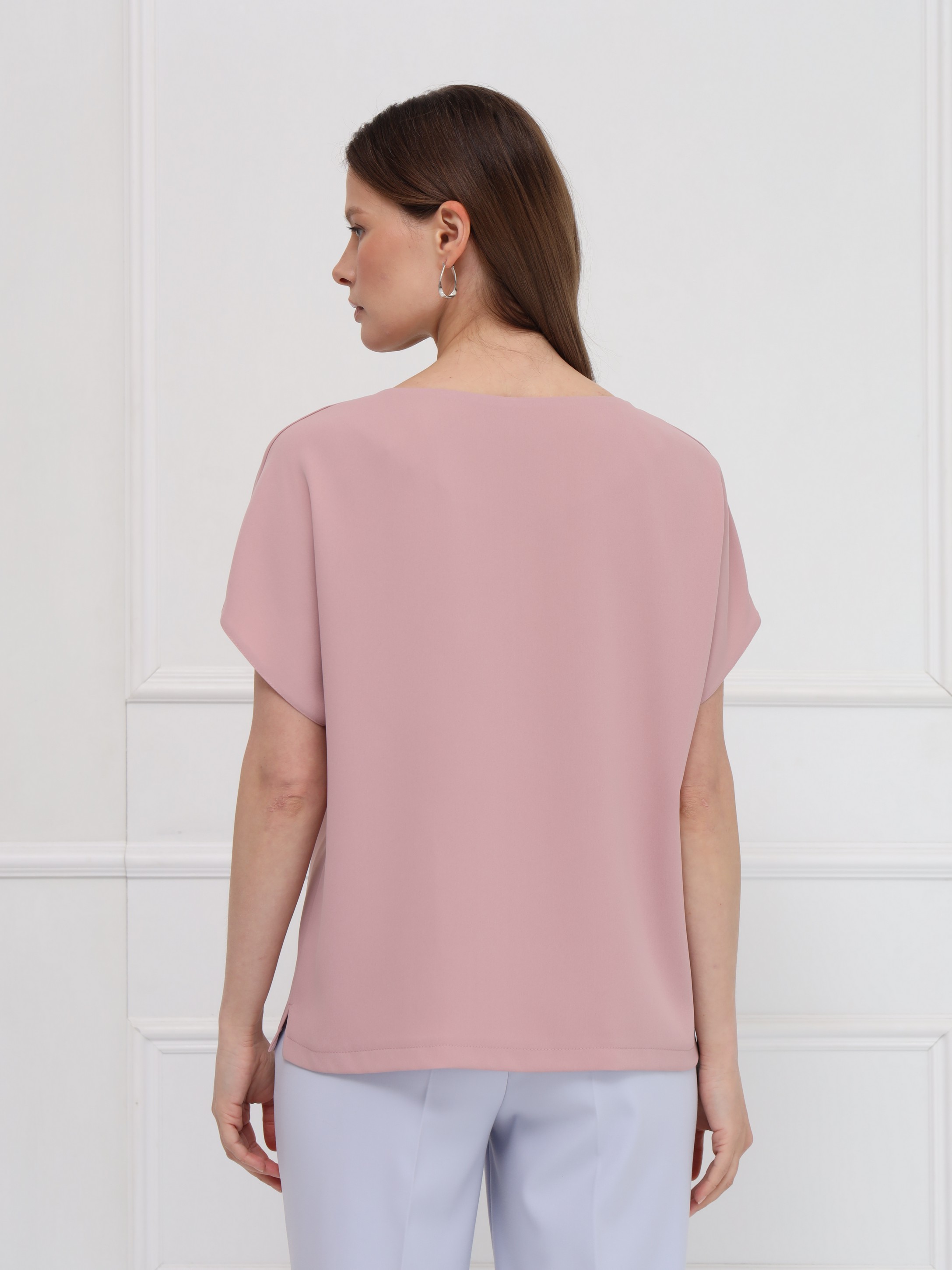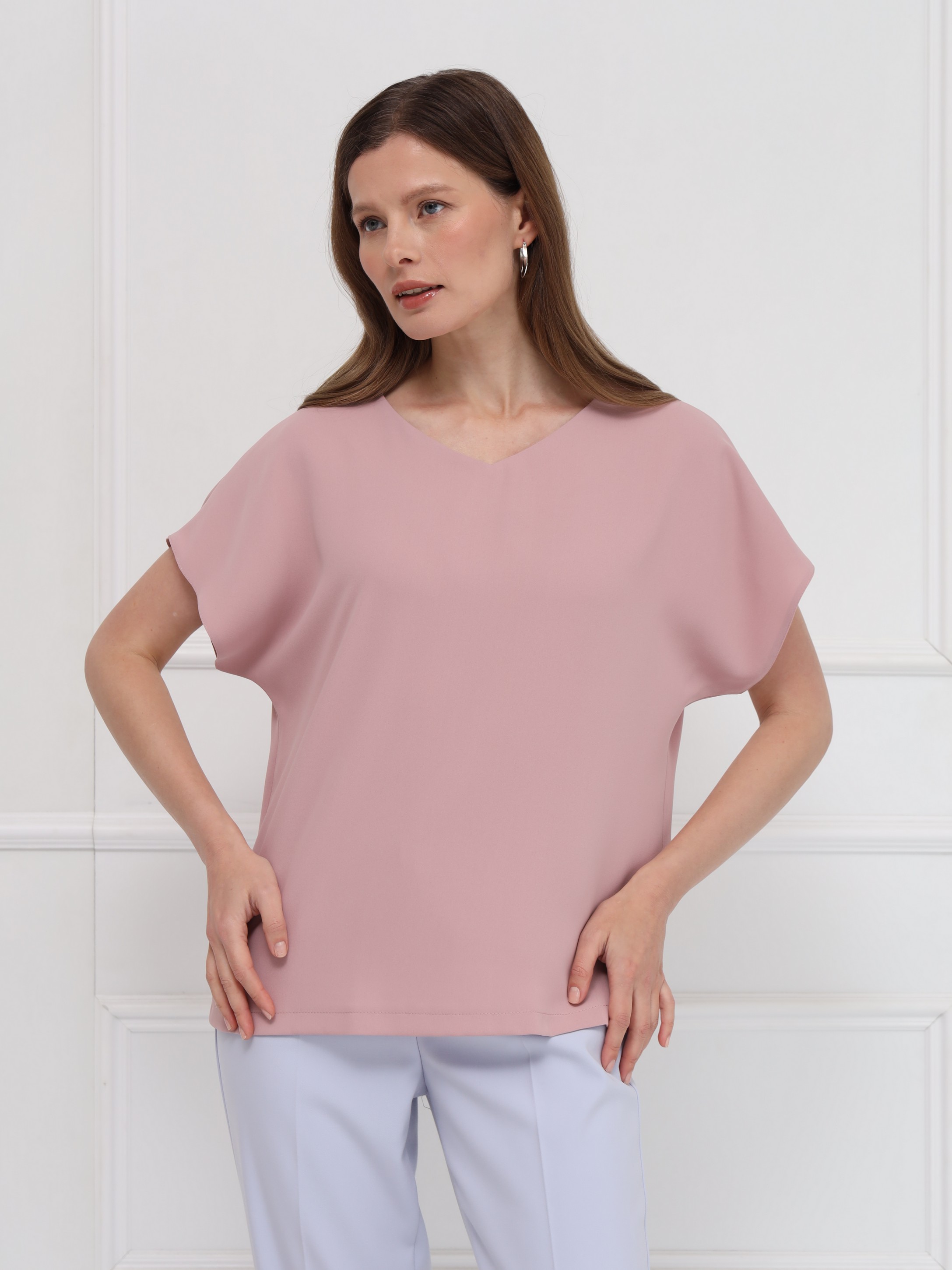 Блузка выполнена из тонкого крепа. Прямой силуэт обеспечивает свободную посадку и подчёркивает чистоту линий. Вырез в форме сердечка мягко оформляет зону декольте, добавляя образу аккуратную женственность. Короткие цельнокроеные рукава создают плавный, цельный контур, а небольшие разрезы по бокам внизу делают модель более подвижной и комфортной. Блузка выглядит сдержанно и элегантно.