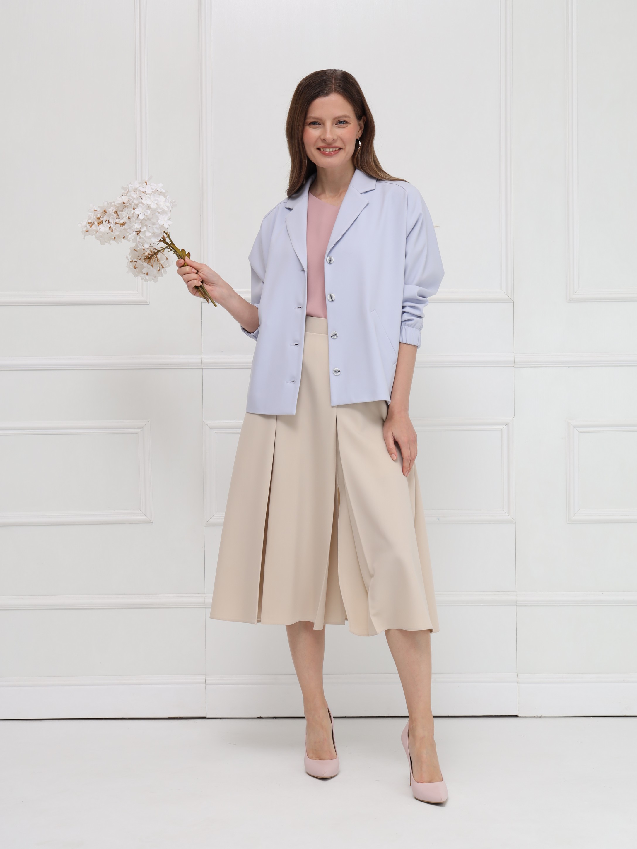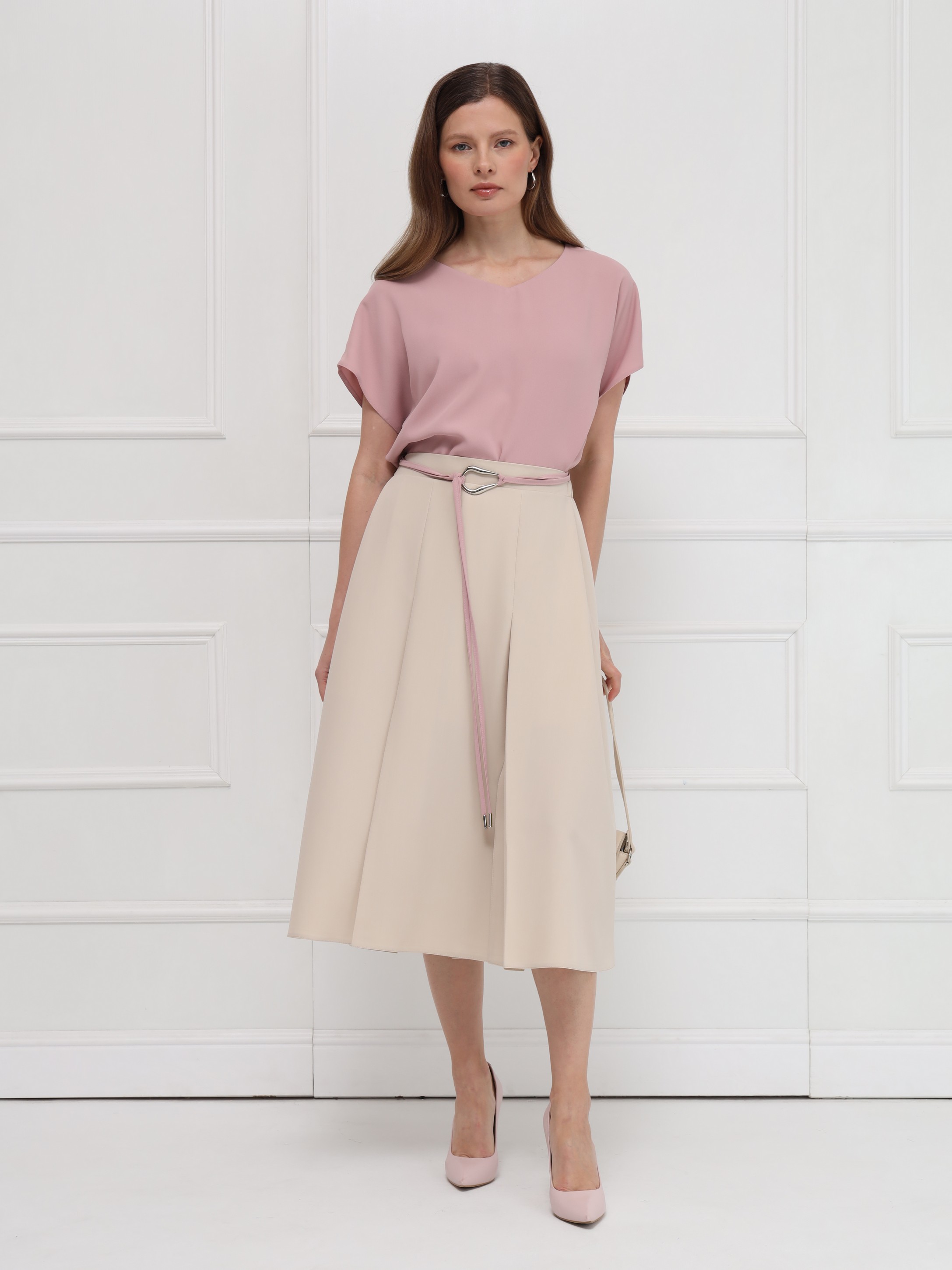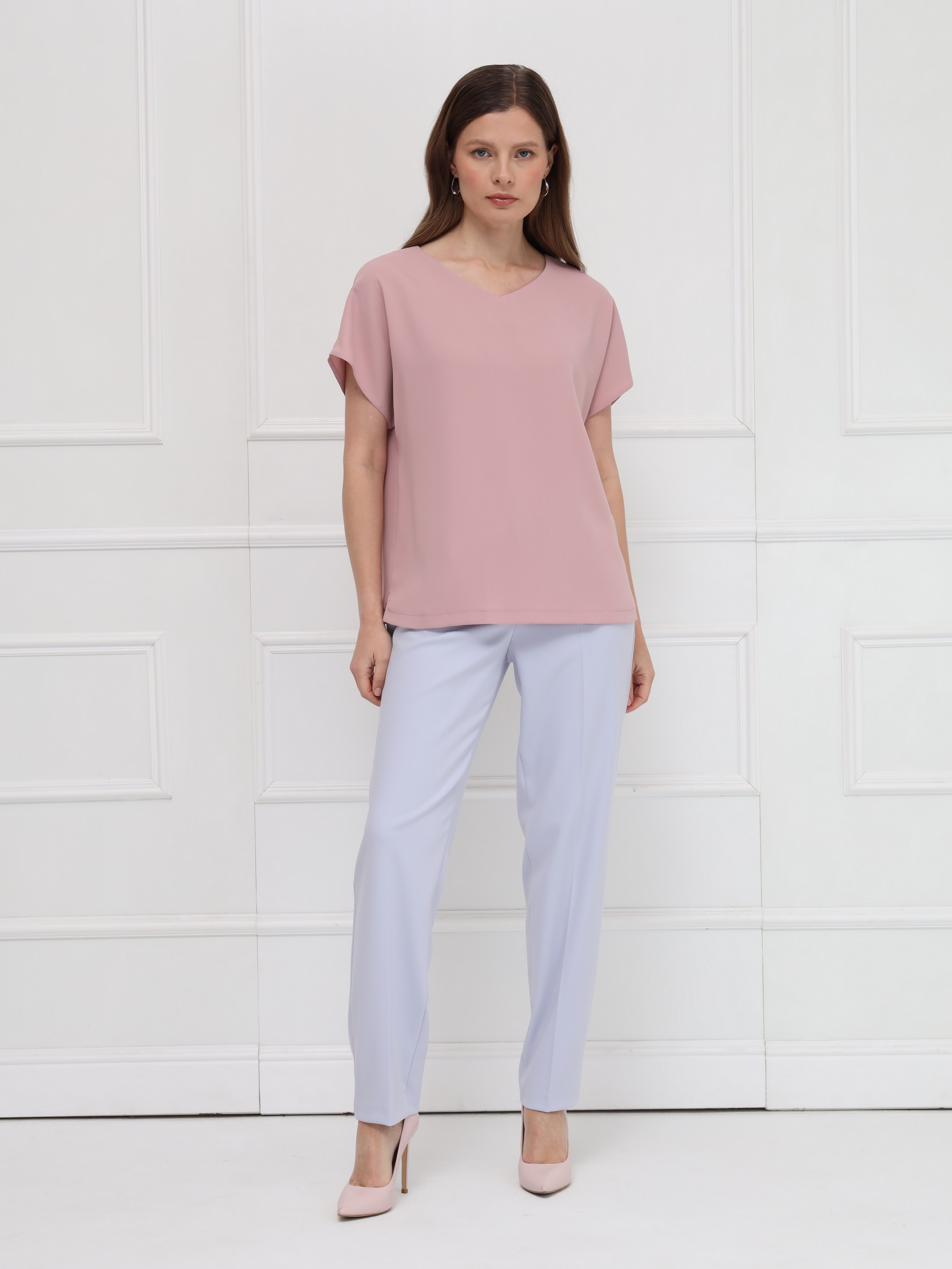 Блузка выполнена из тонкого крепа. Прямой силуэт обеспечивает свободную посадку и подчёркивает чистоту линий. Вырез в форме сердечка мягко оформляет зону декольте, добавляя образу аккуратную женственность. Короткие цельнокроеные рукава создают плавный, цельный контур, а небольшие разрезы по бокам внизу делают модель более подвижной и комфортной. Блузка выглядит сдержанно и элегантно.