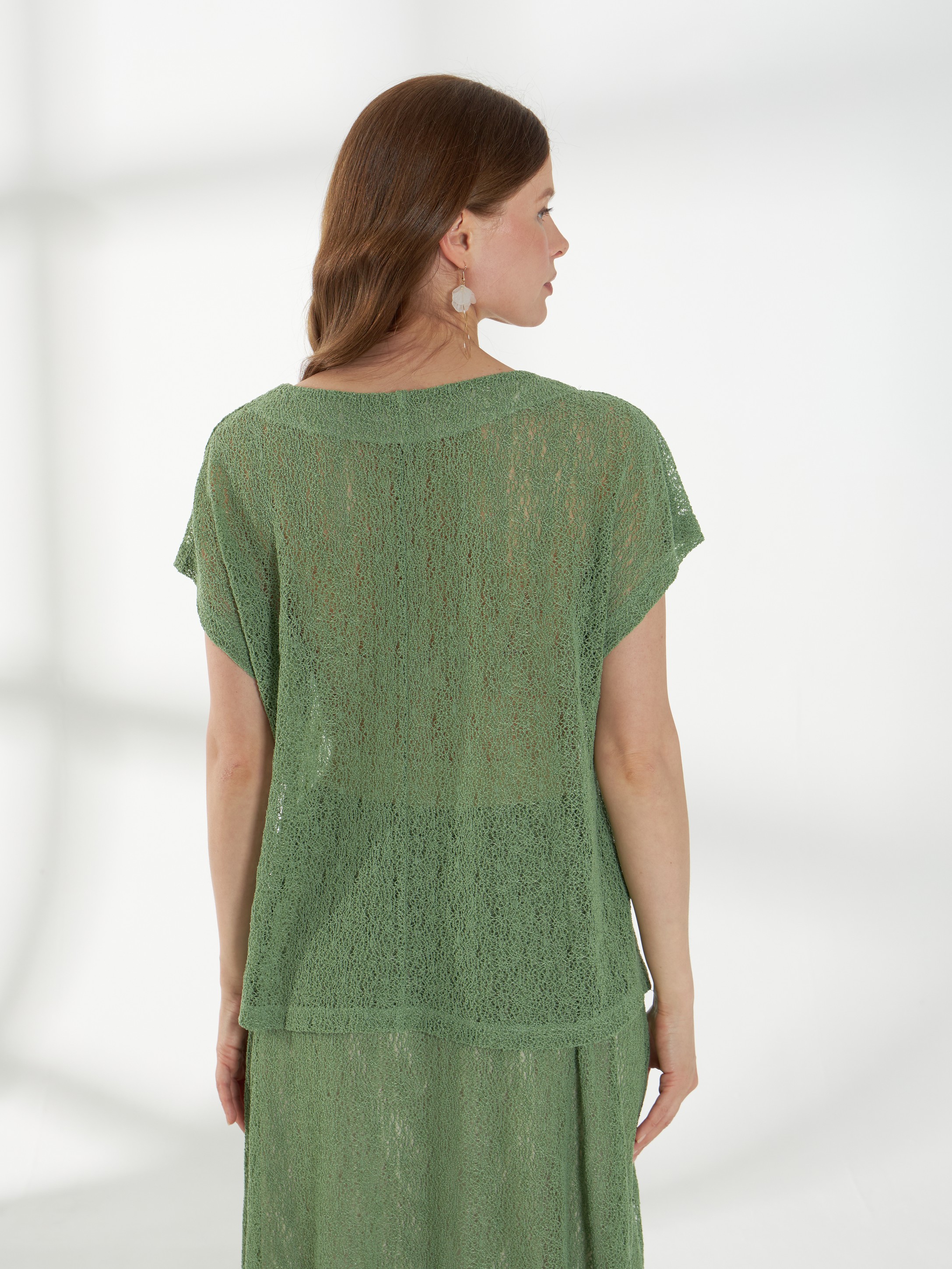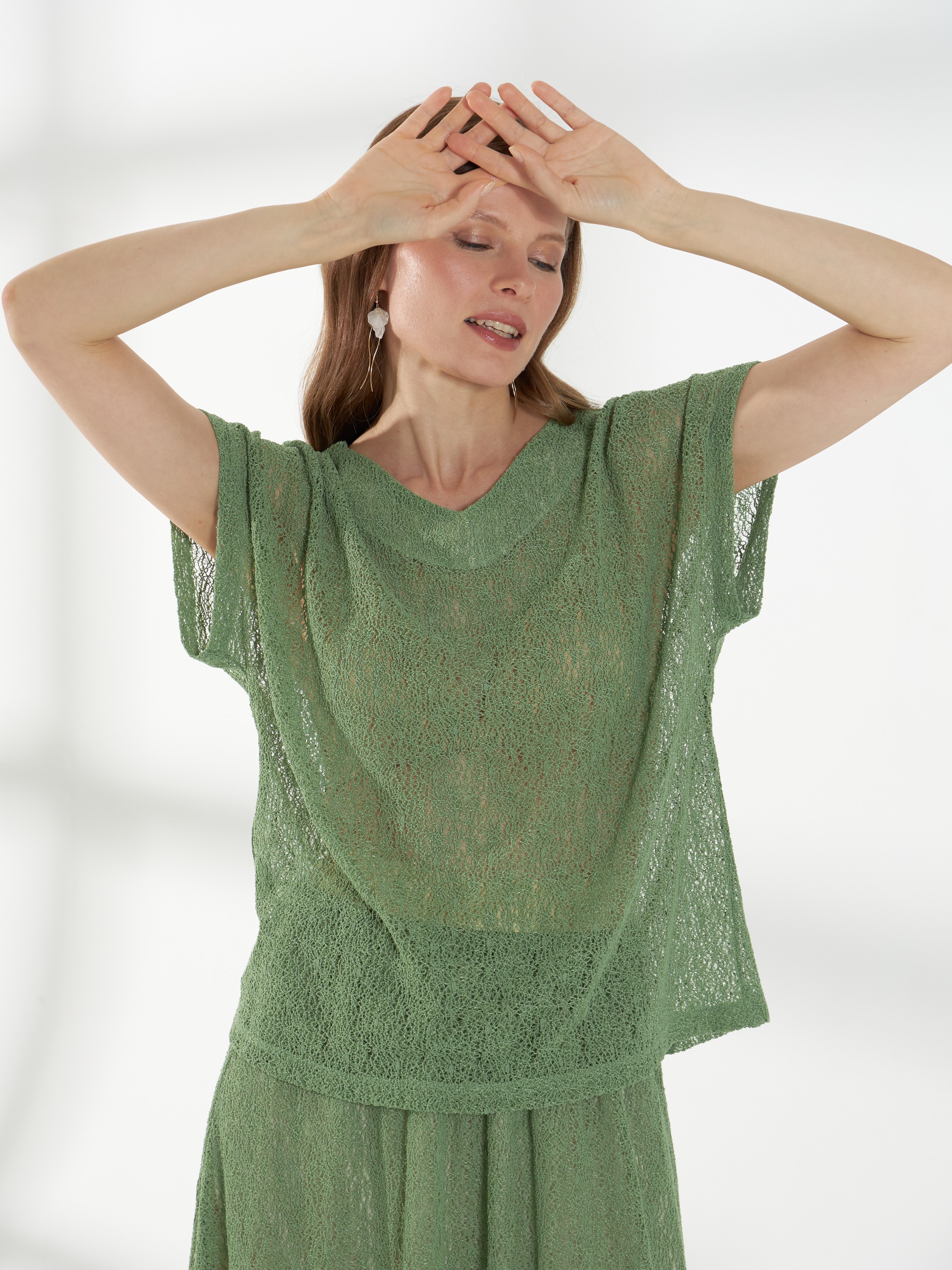 Блуза прямого кроя, с короткими цельнокроеными рукавами и аккуратной горловиной сердечком, выполнена из мягкого кружевного трикотажа в нежно-зеленом оттенке. Модель сочетает комфорт и легкость с изящной текстурой кружева, создавая женственный и воздушный силуэт.