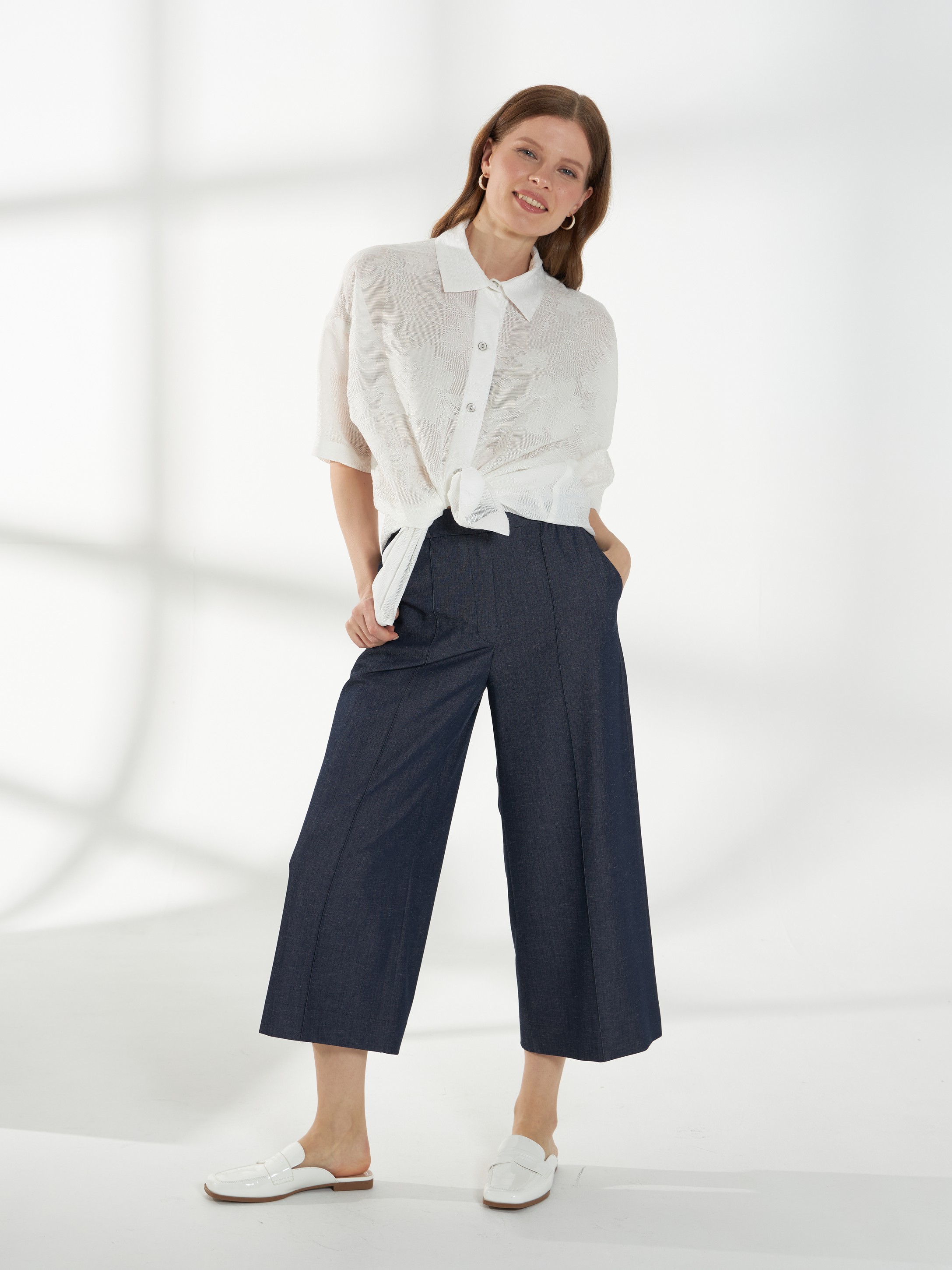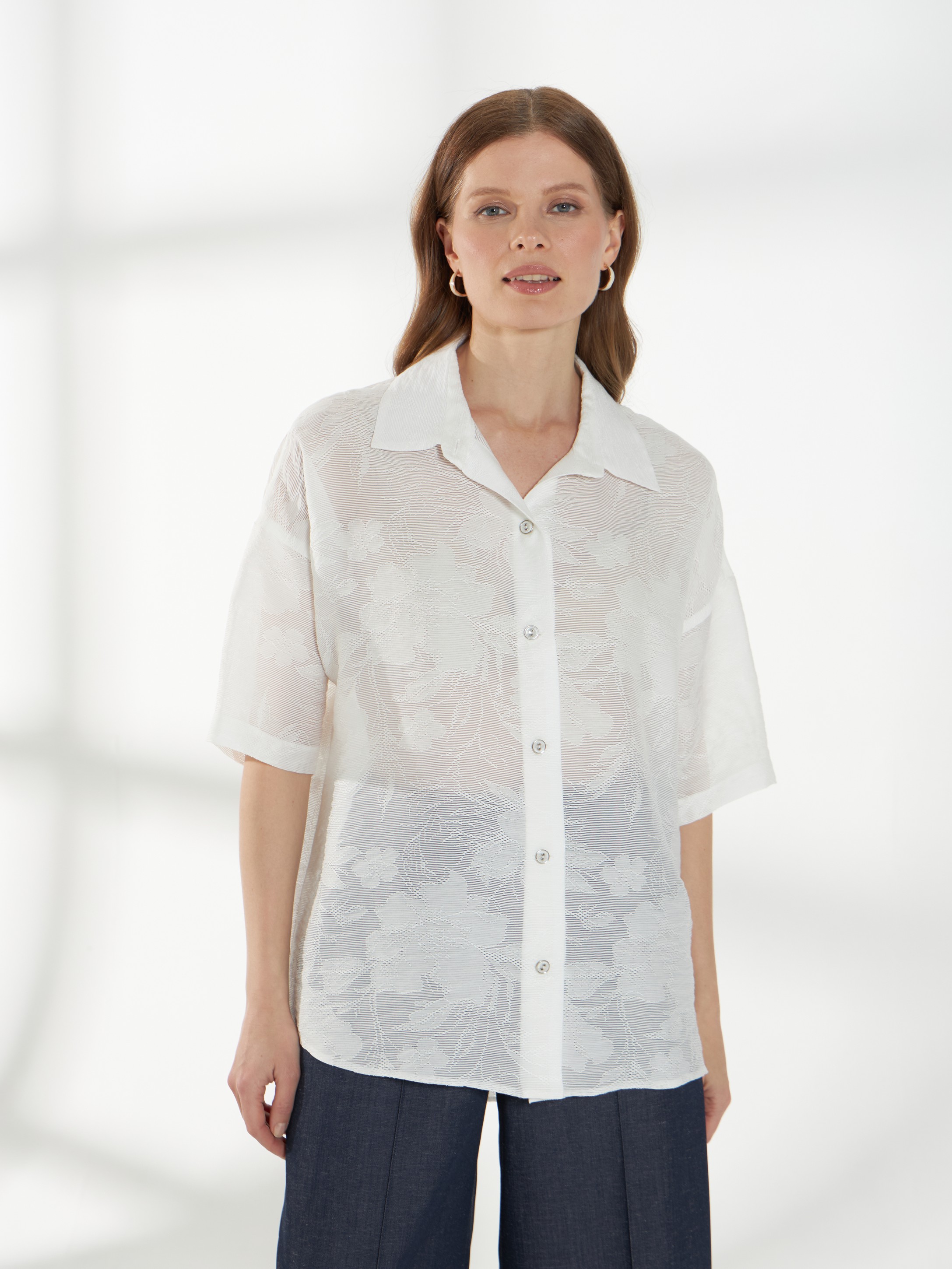 Блуза-рубашка молочного оттенка, свободного кроя из полупрозрачного кружева с вискозой в составе. Легкая фактура придает образу выразительность и делает модель подходящей как для особых случаев, так и для стильных повседневных сочетаний. Фигурная линия низа добавляет динамики силуэту. Спущенная пройма и короткий рукав создают мягкую, расслабленную посадку. Рубашечный воротник и застежка-планка на мелкие пуговицы сохраняют аккуратность и завершенность дизайна.