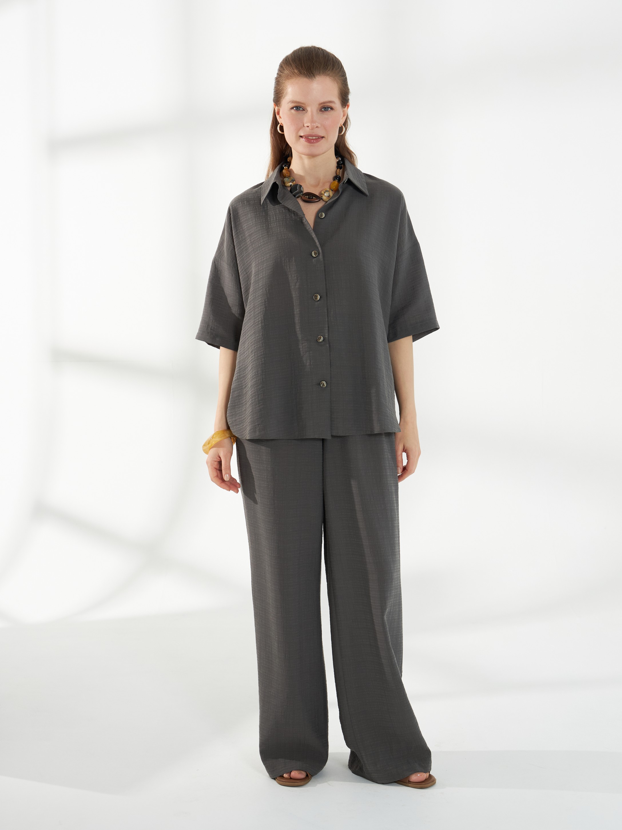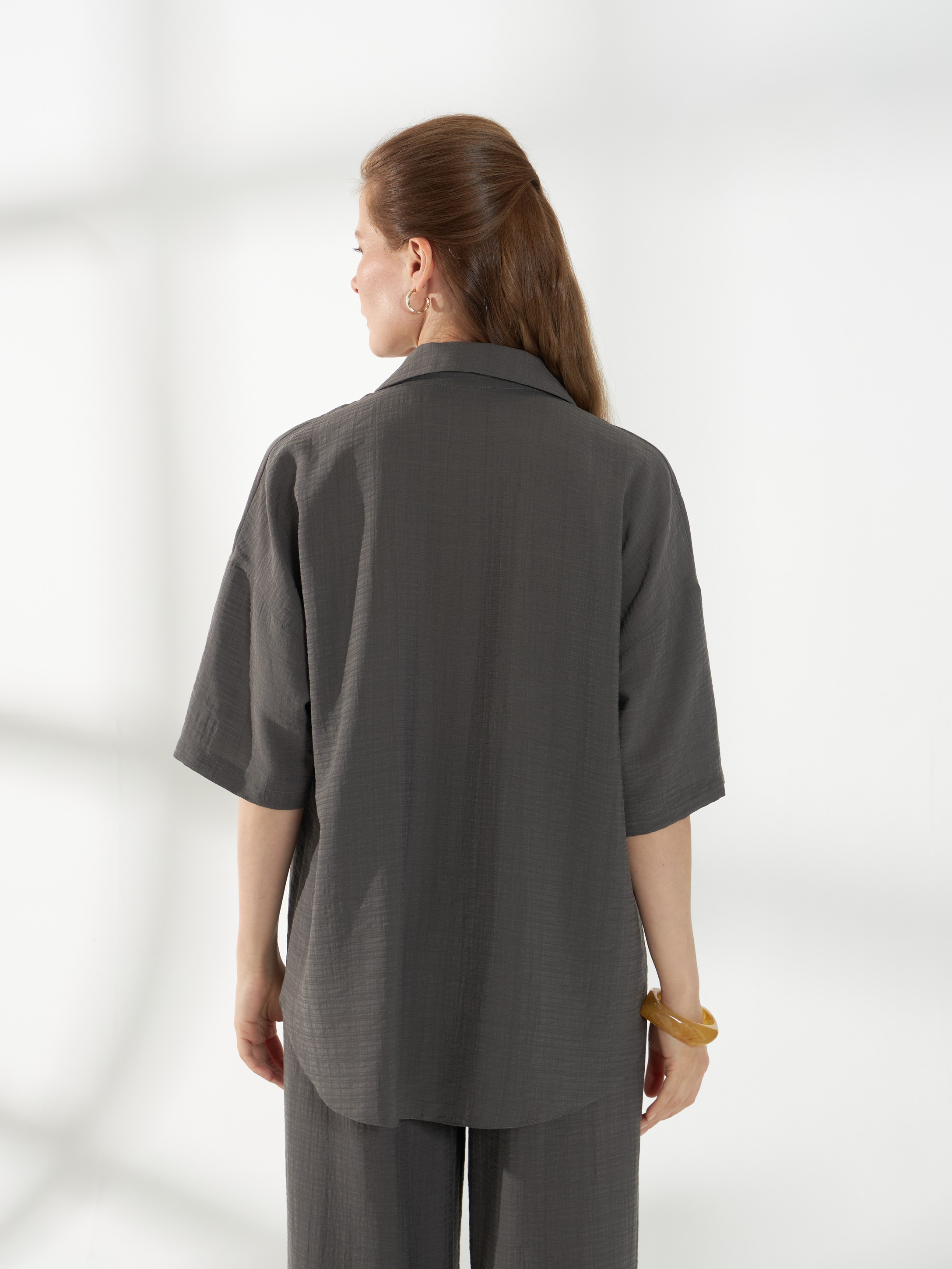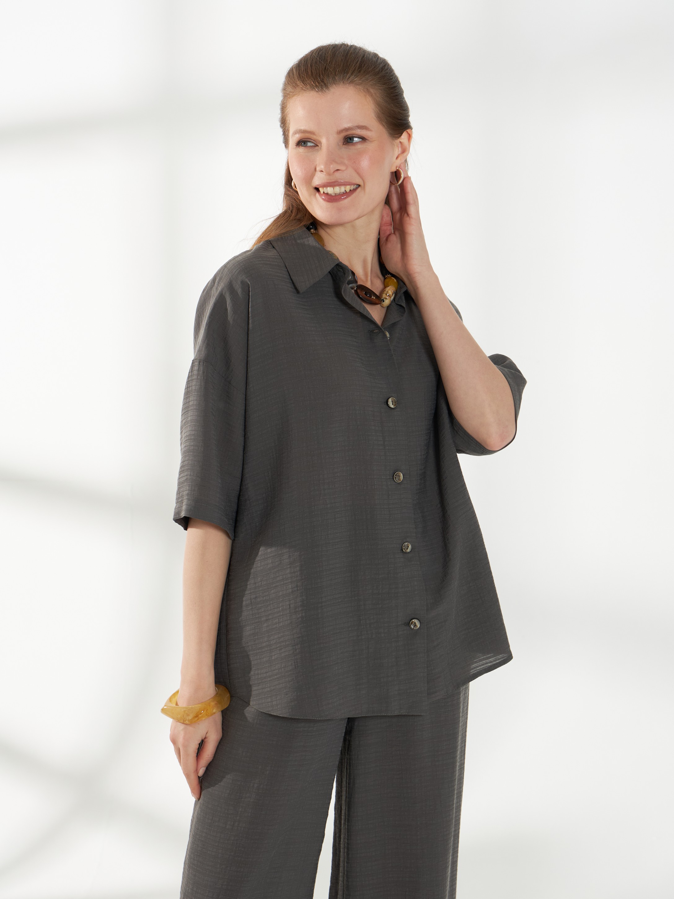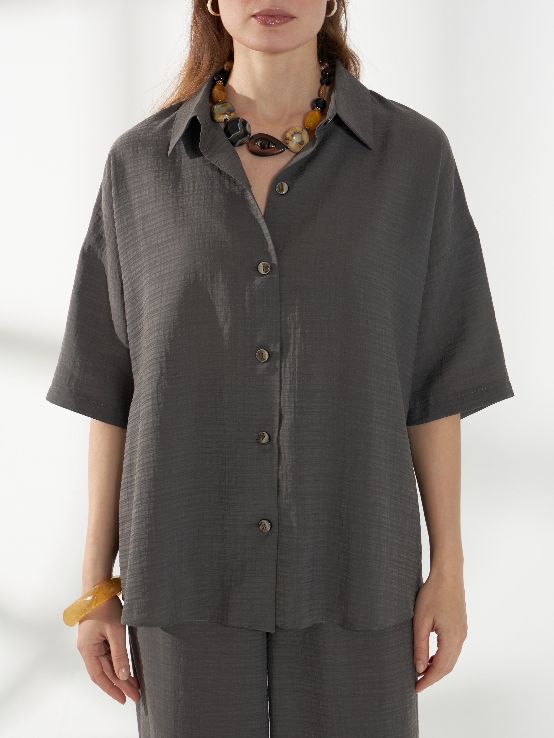 Легкая серо-зеленая блуза-рубашка из тонкого вискозного полотна с жатым эффектом. Свободный крой и короткие рукава создают комфортный и непринужденный силуэт. Фигурная линия низа добавляет мягкость образу, классический воротник на стойке и планка на пуговицах сохраняют аккуратность и универсальность модели.
