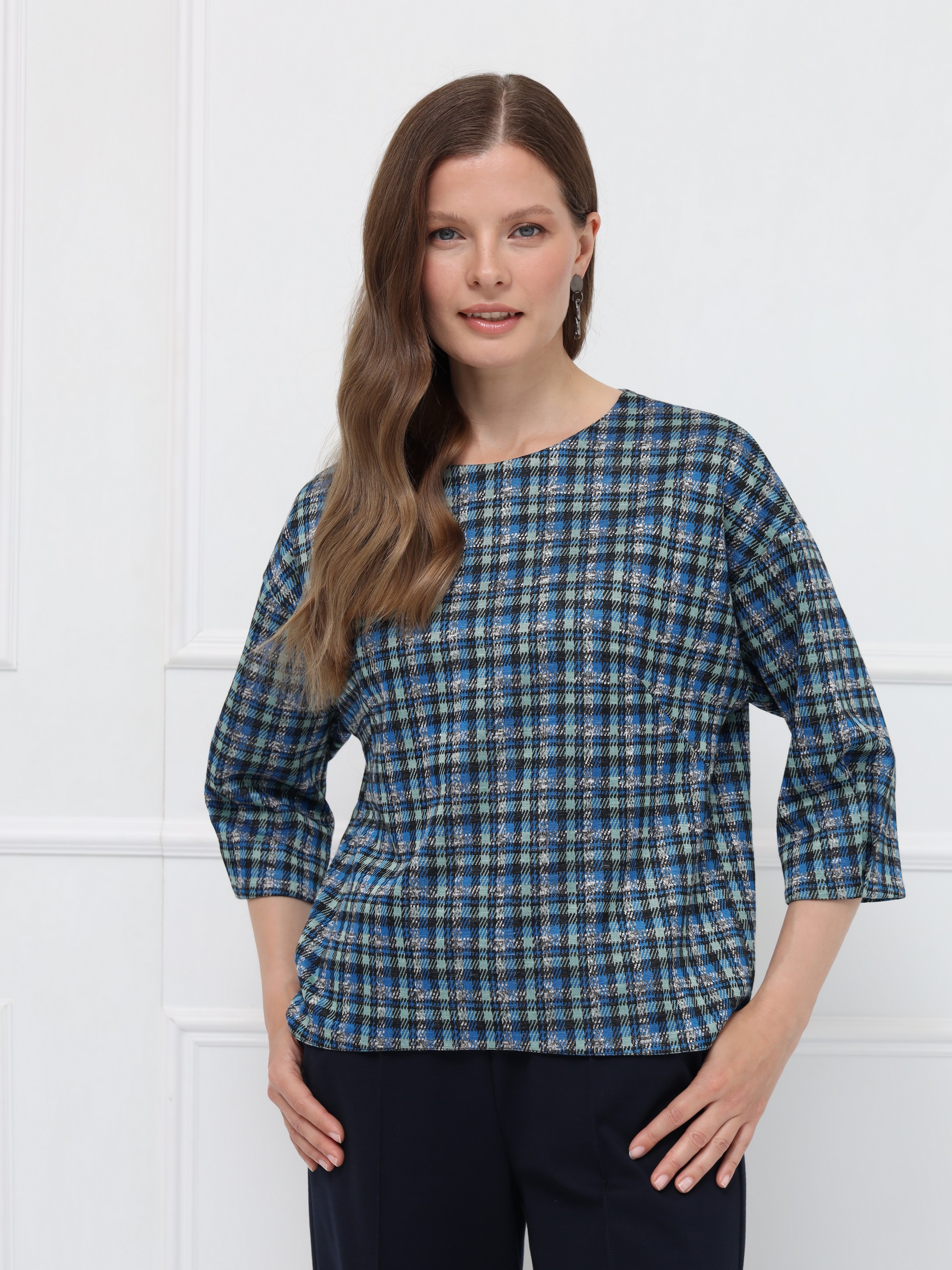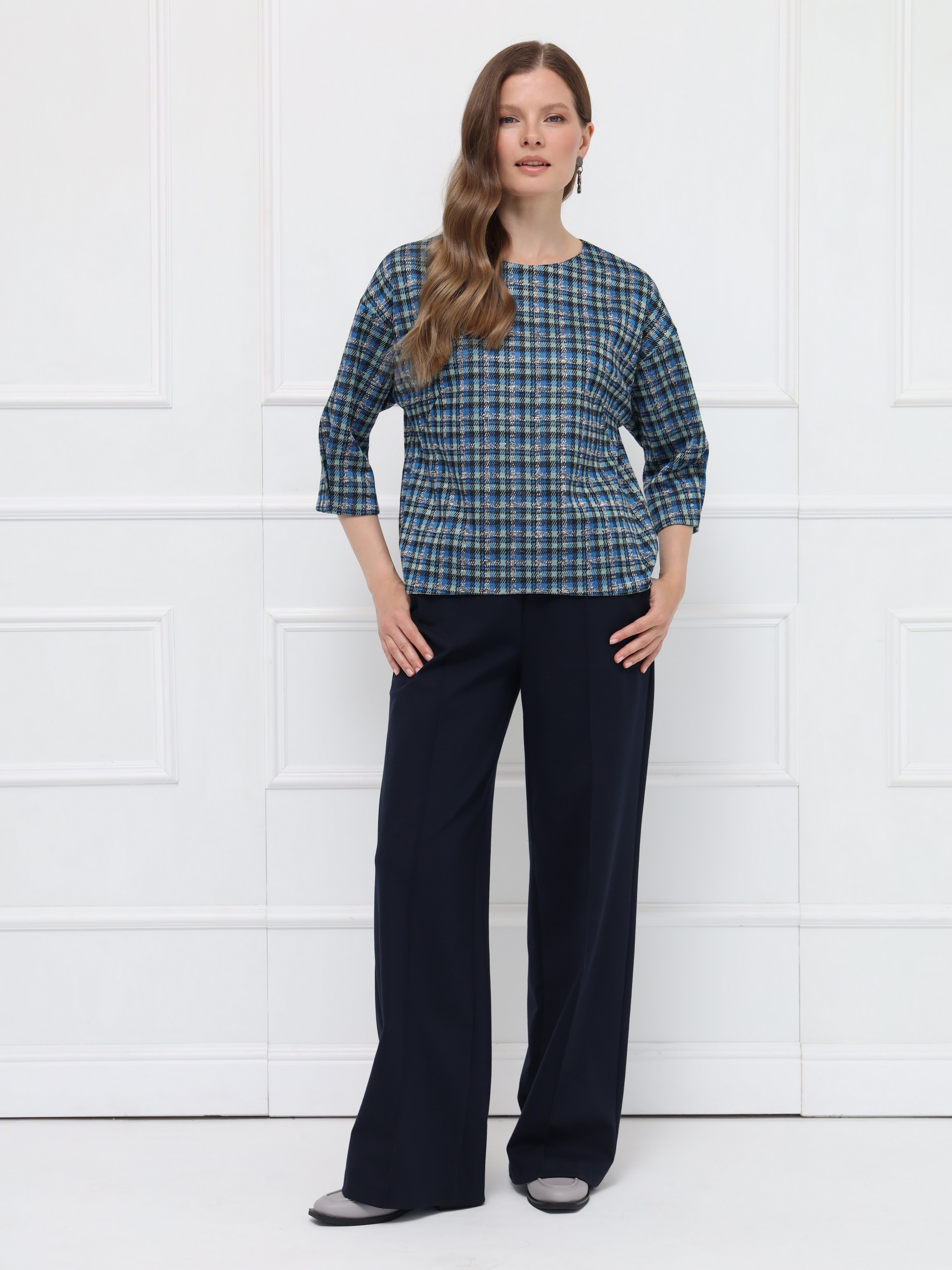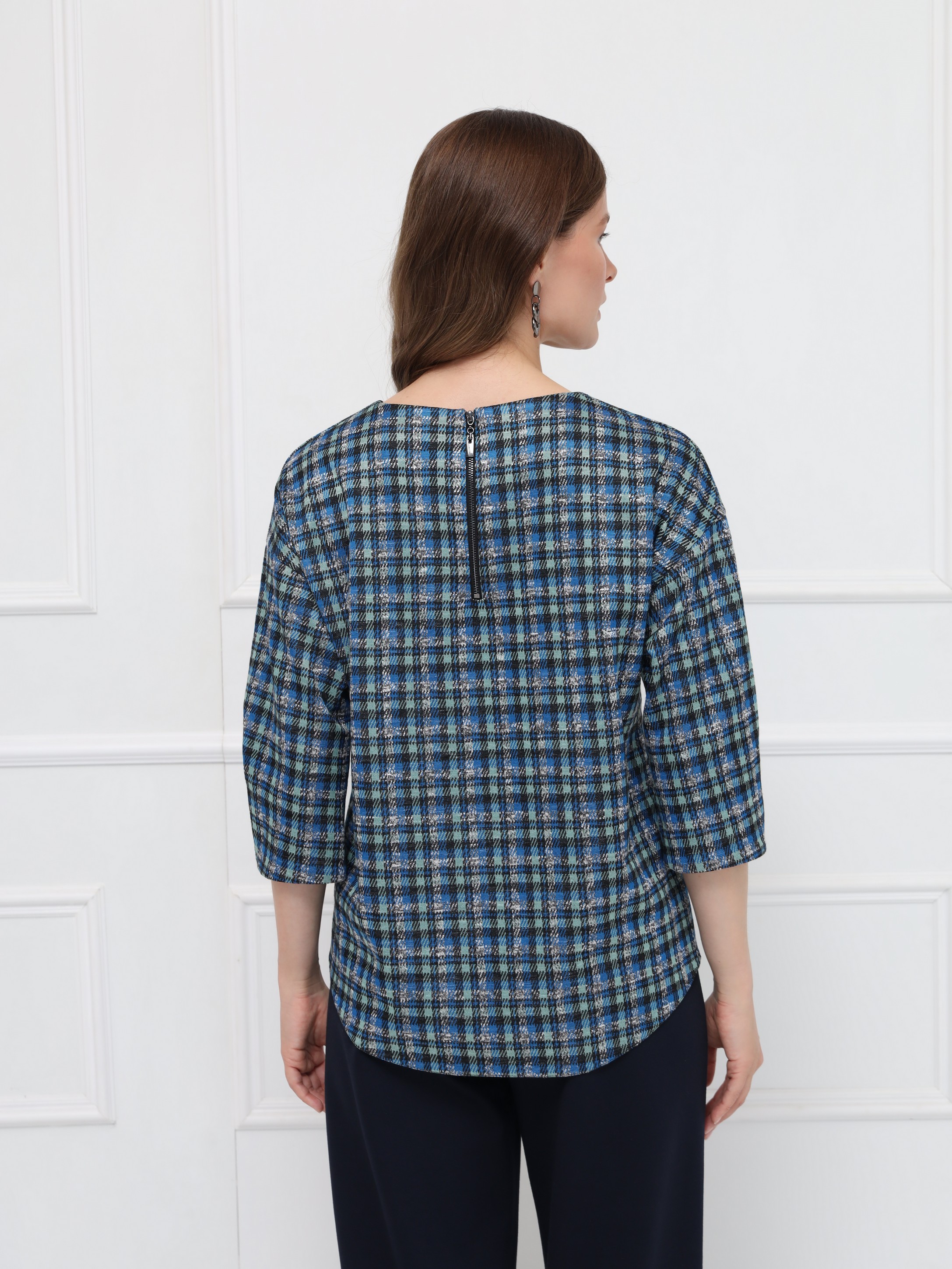 Элегантная блуза свободного кроя с мягкой линией плеча создаёт лёгкий, женственный силуэт. Рукава 7/8 с деликатными складками подчёркивают изящество образа. Овальная горловина и декоративная молния на спинке добавляют современный акцент. Фигурный низ с удлинённой спинкой красиво смотрится с брюками и юбками. Выполнена из мягкого пластичного трикотажа с актуальным принтом «микро-клетка» в сине-серой гамме.