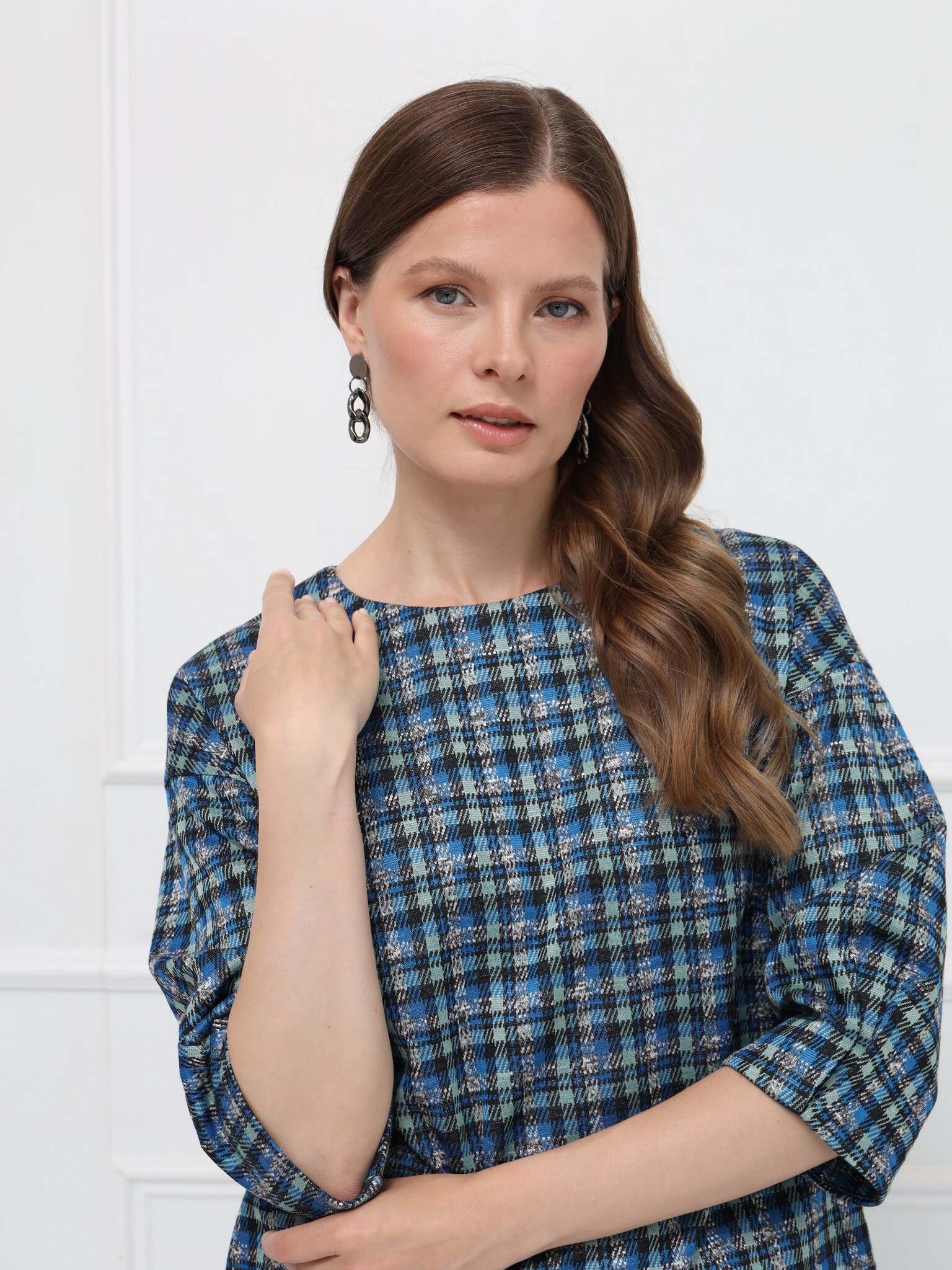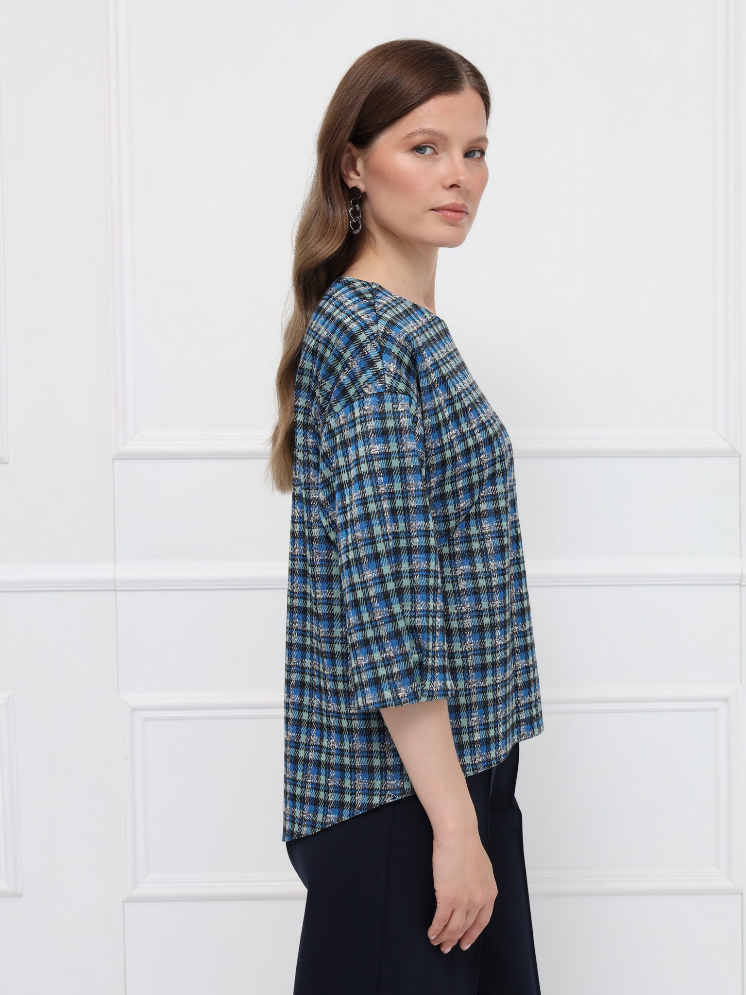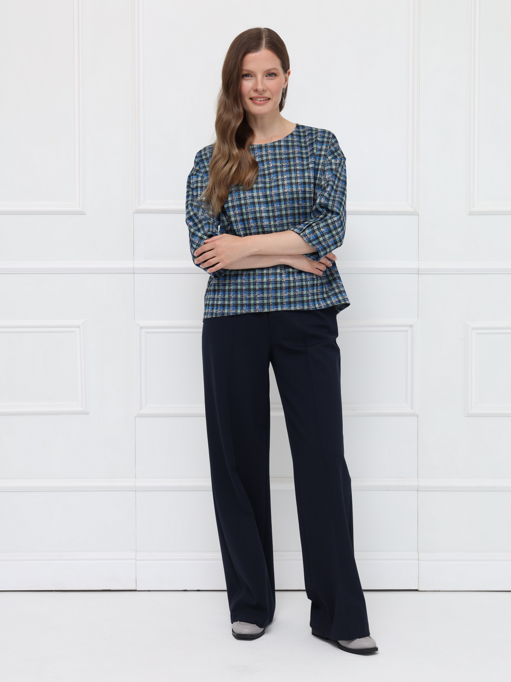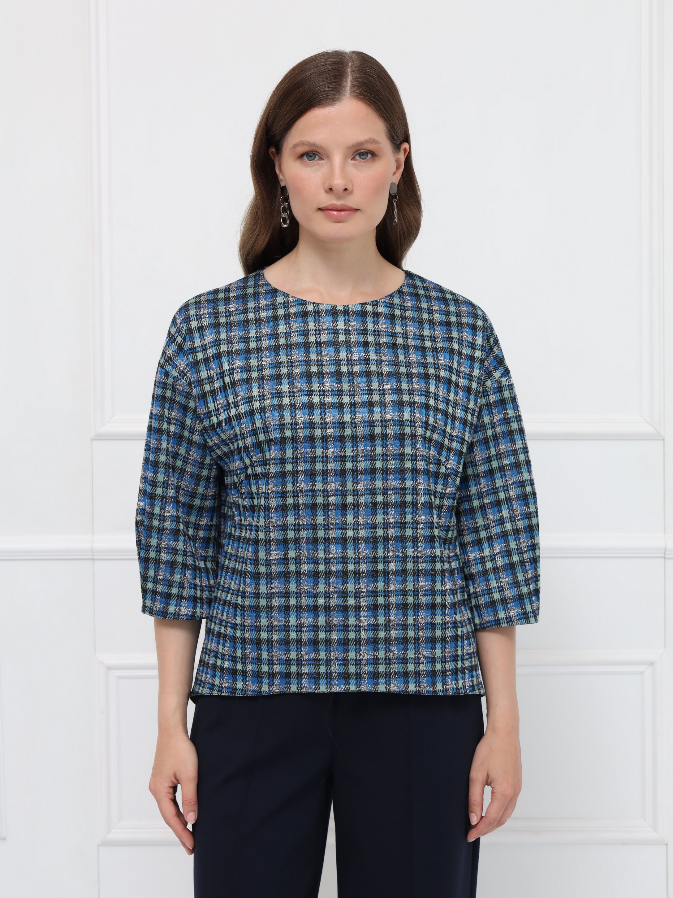 Элегантная блуза свободного кроя с мягкой линией плеча создаёт лёгкий, женственный силуэт. Рукава 7/8 с деликатными складками подчёркивают изящество образа. Овальная горловина и декоративная молния на спинке добавляют современный акцент. Фигурный низ с удлинённой спинкой красиво смотрится с брюками и юбками. Выполнена из мягкого пластичного трикотажа с актуальным принтом «микро-клетка» в сине-серой гамме.