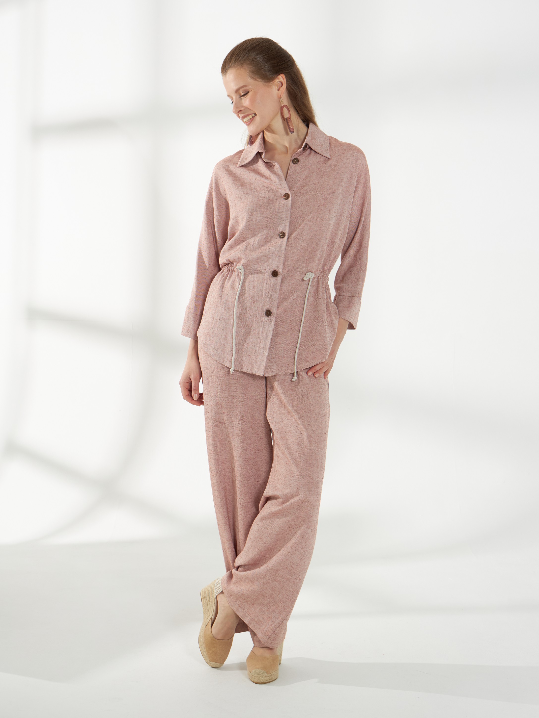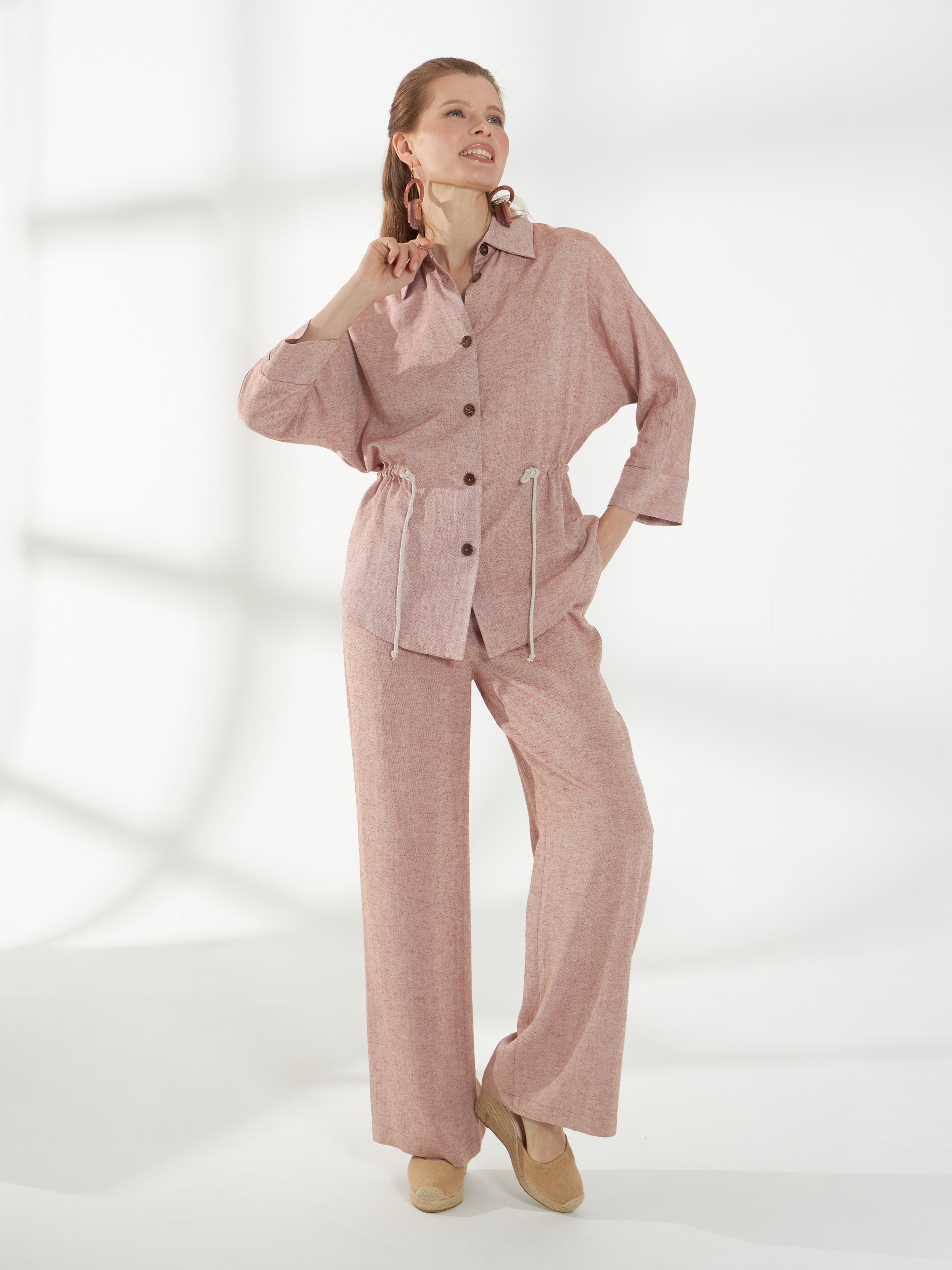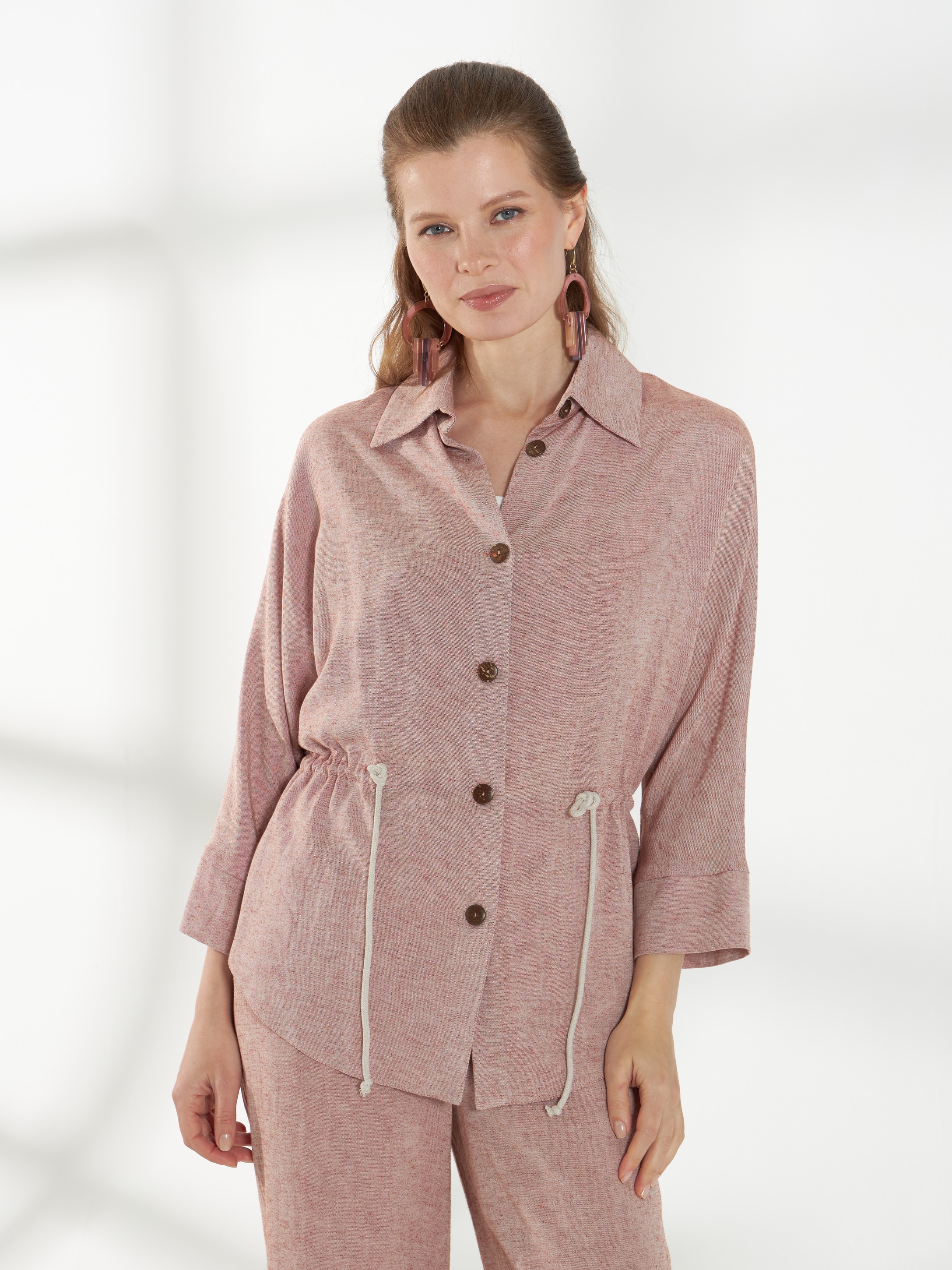 Легкая блуза свободного кроя, из смесового материала со льном в оттенке розового песка. Цельнокроеные рукава 3/4 и рубашечный воротник создают аккуратный и непринужденный силуэт. Планка с пуговицами и фигурная линия низа добавляют детализацию, а декоративный шнур в кулисе позволяет приталить модель, сохраняя комфорт и легкость посадки.