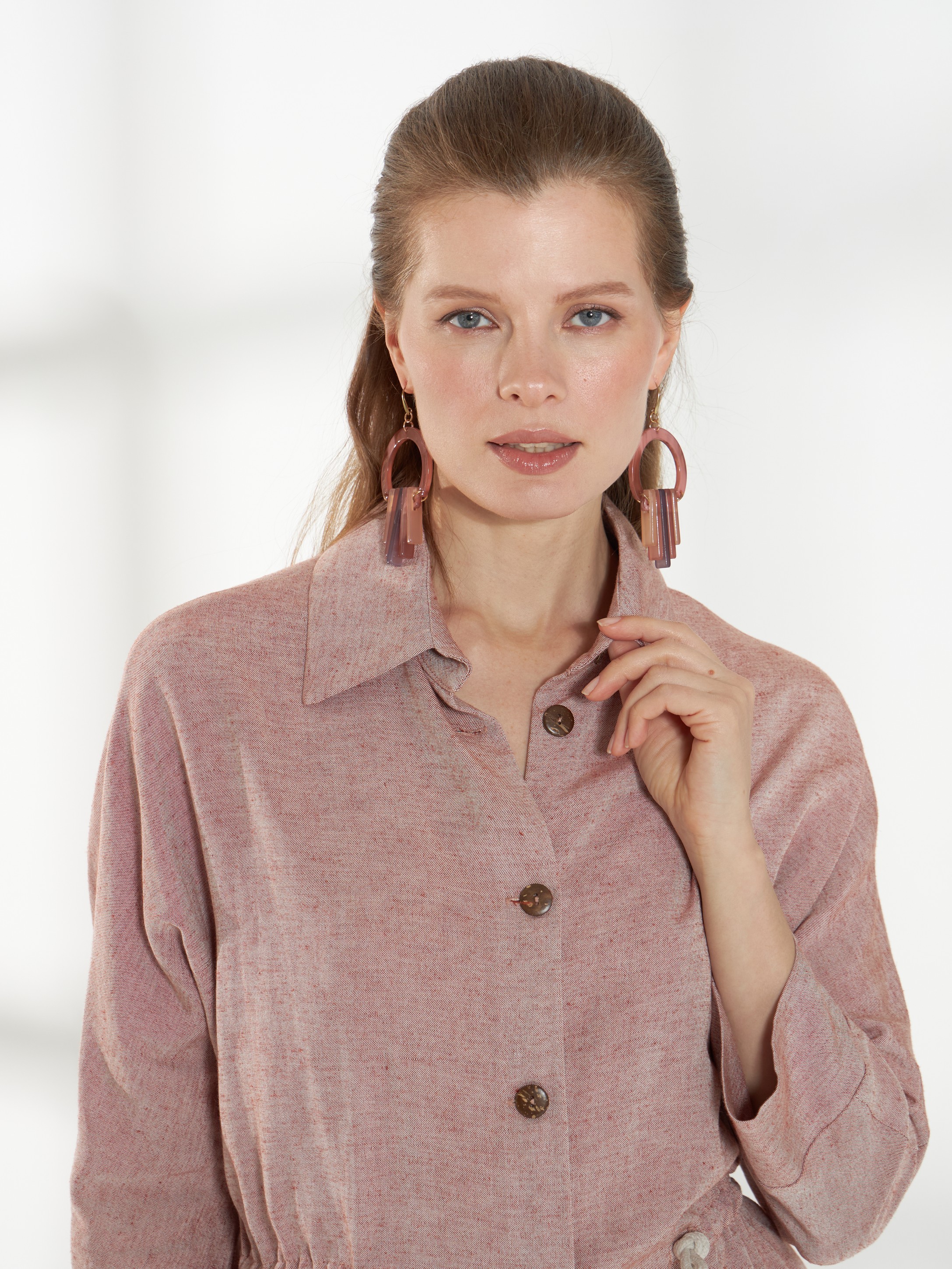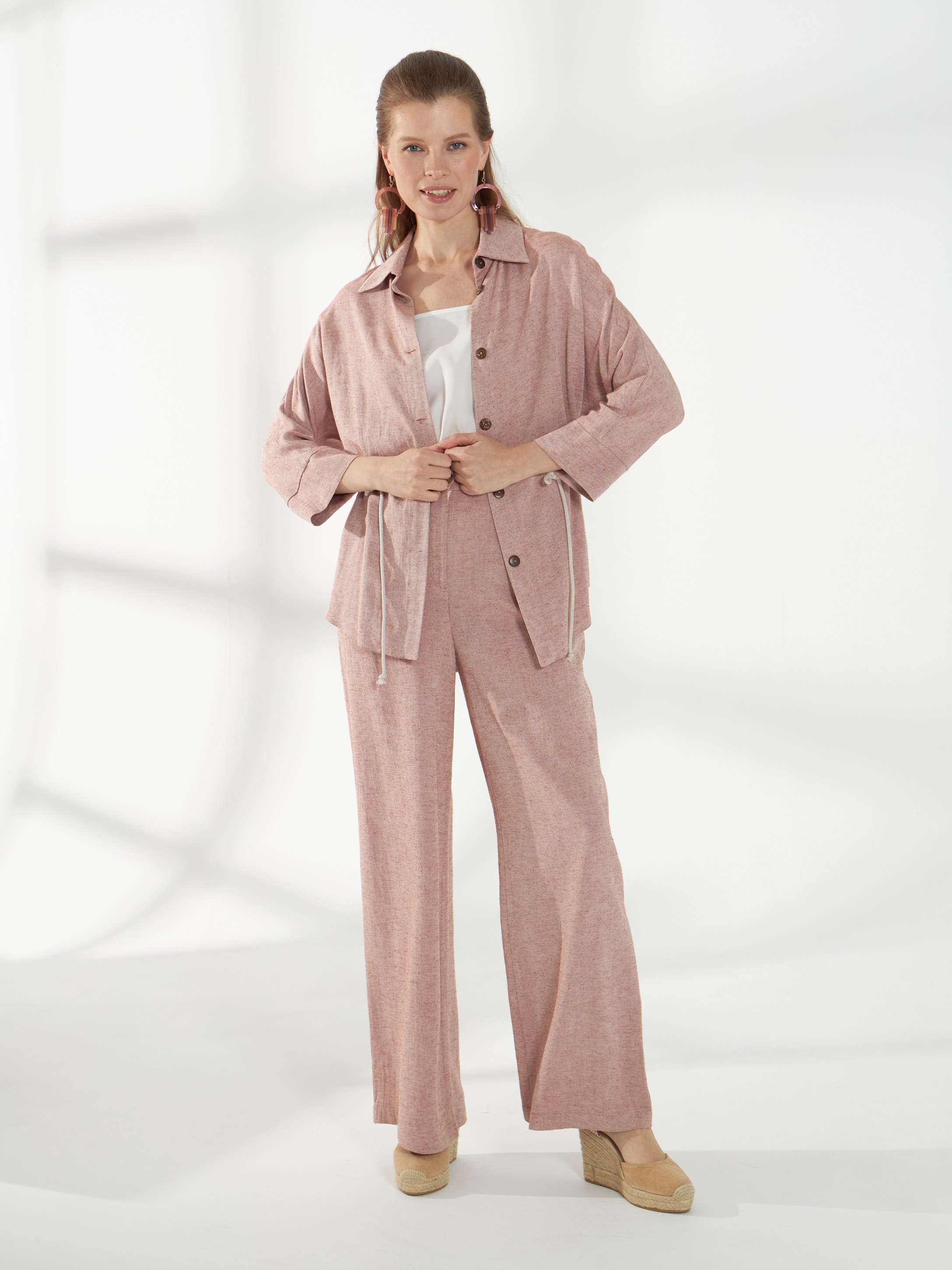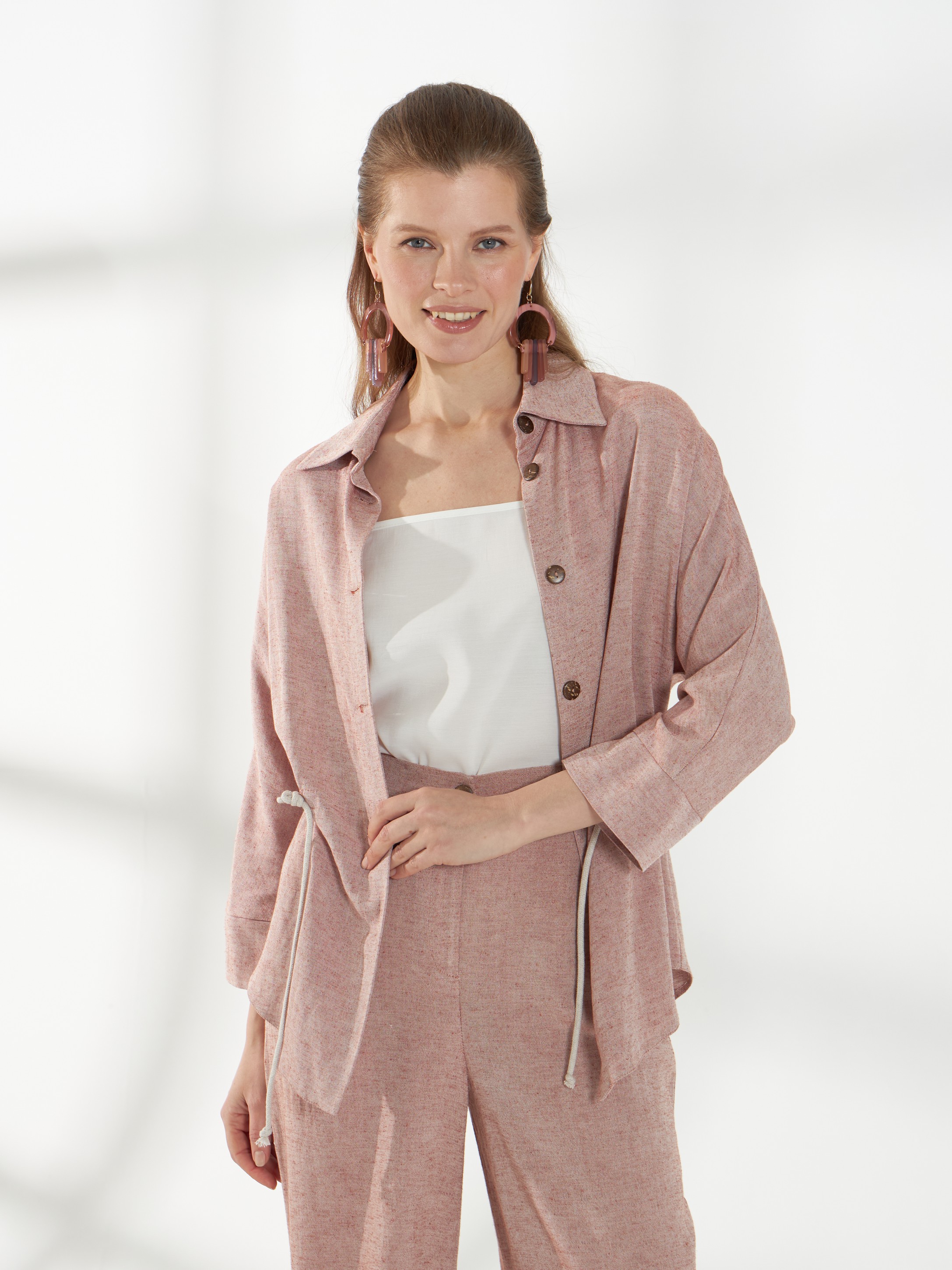 Легкая блуза свободного кроя, из смесового материала со льном в оттенке розового песка. Цельнокроеные рукава 3/4 и рубашечный воротник создают аккуратный и непринужденный силуэт. Планка с пуговицами и фигурная линия низа добавляют детализацию, а декоративный шнур в кулисе позволяет приталить модель, сохраняя комфорт и легкость посадки.
