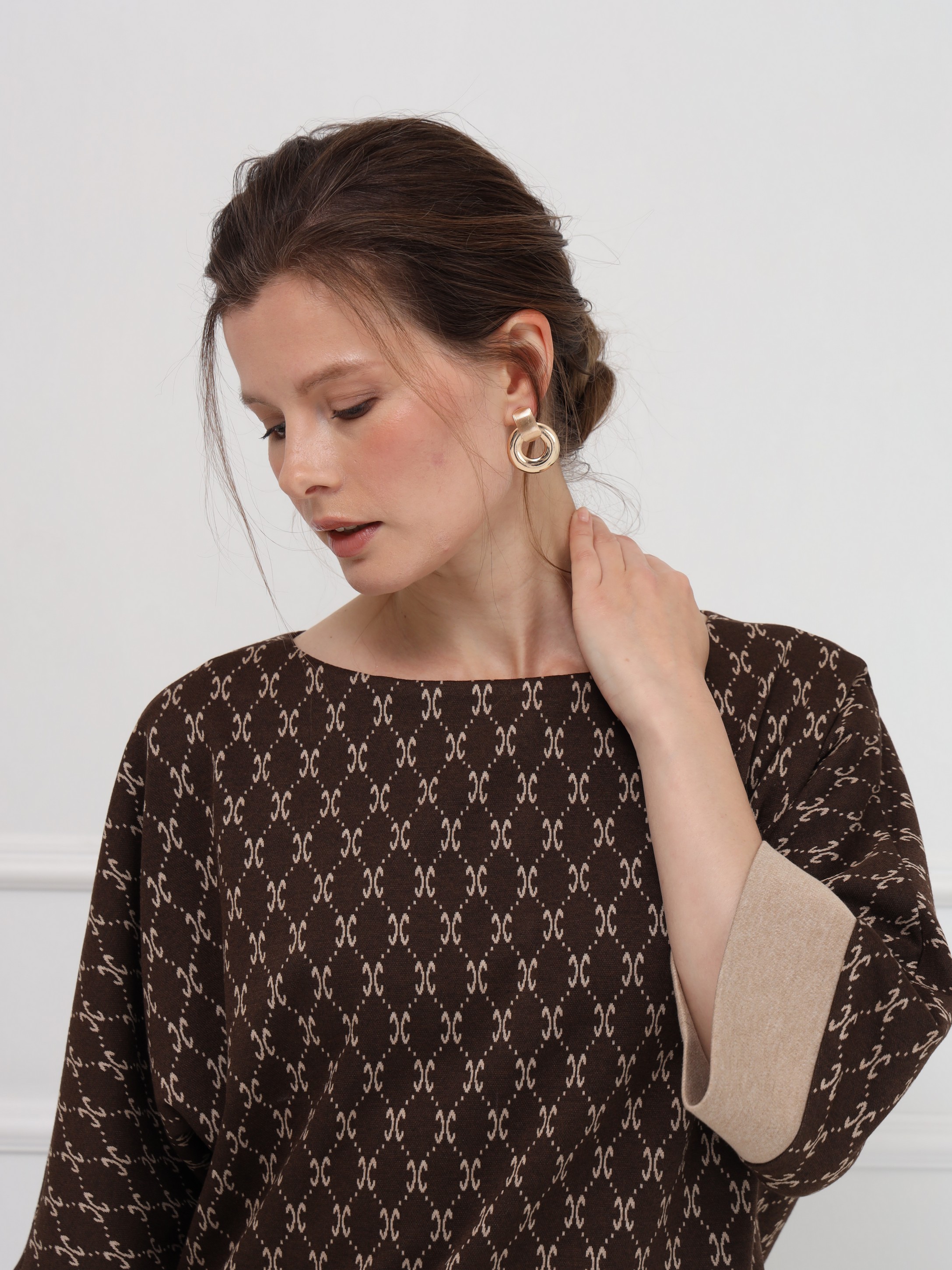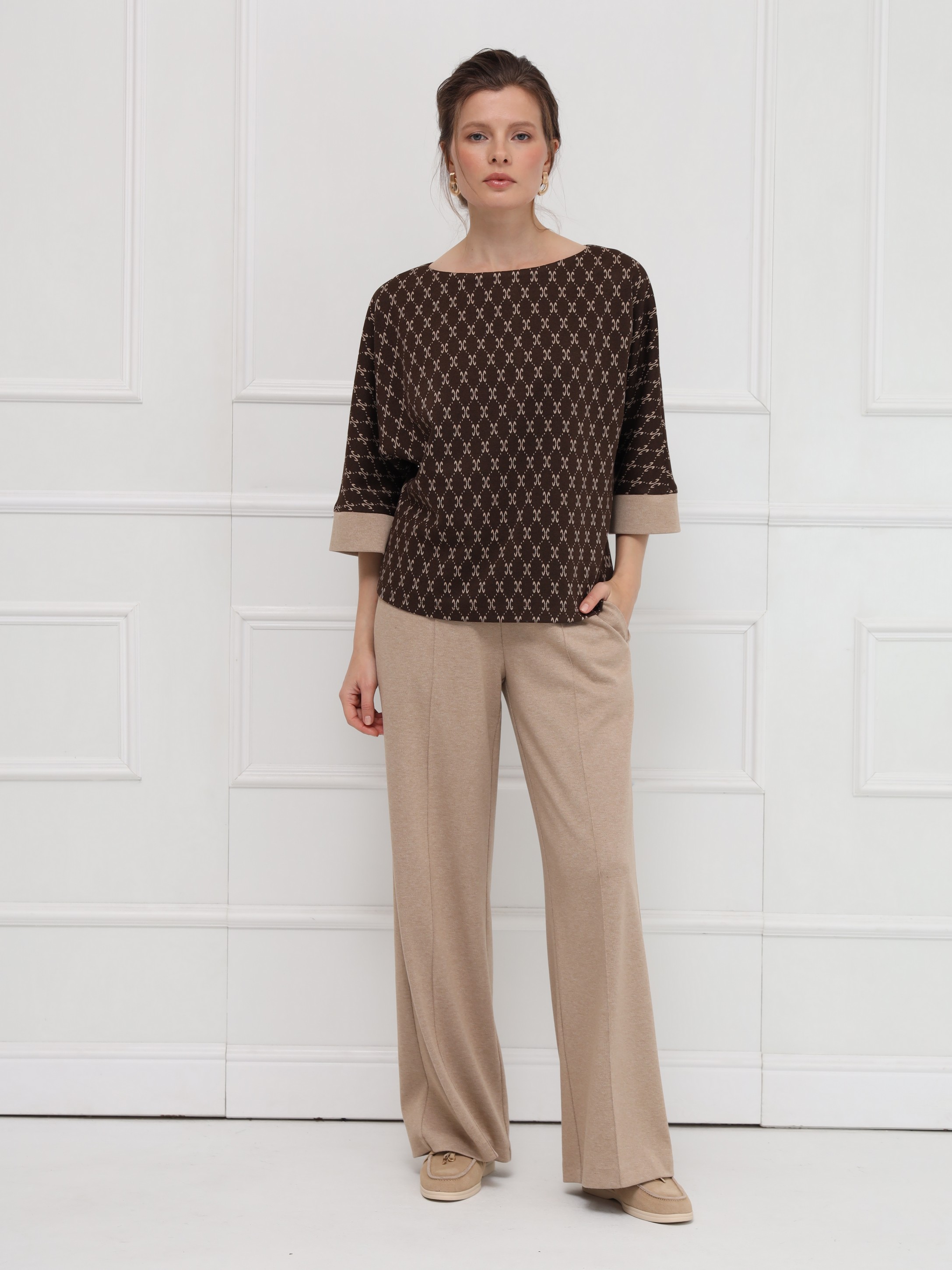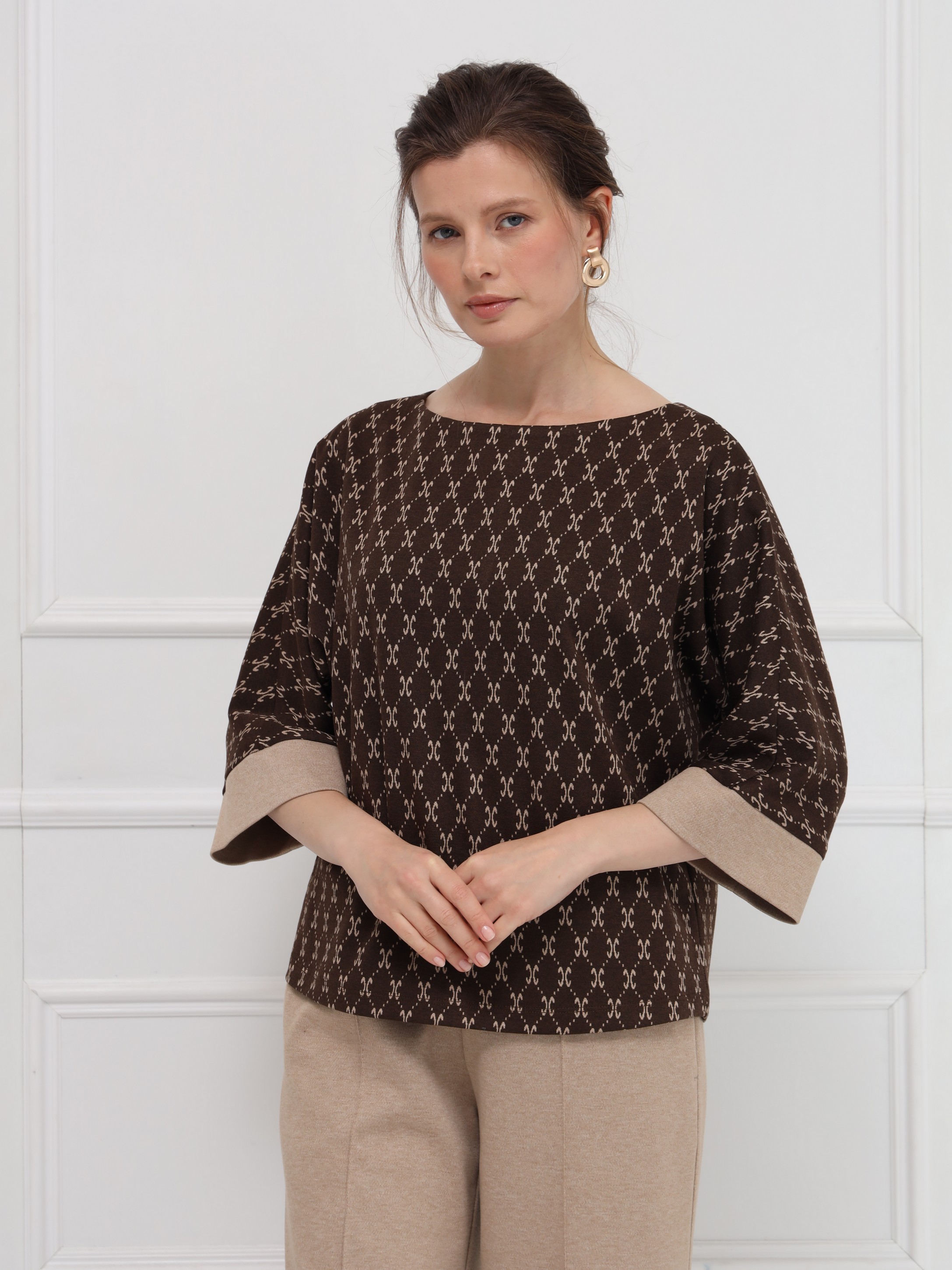 Блузка с утонченным принтом, напоминающим мотивы премиальных брендов, имеет цельнокроеные широкие рукава и лаконичную горловину. Мягкий трикотаж драпируется по фигуре. Контрастные манжеты по низу рукавов придают модели законченность.