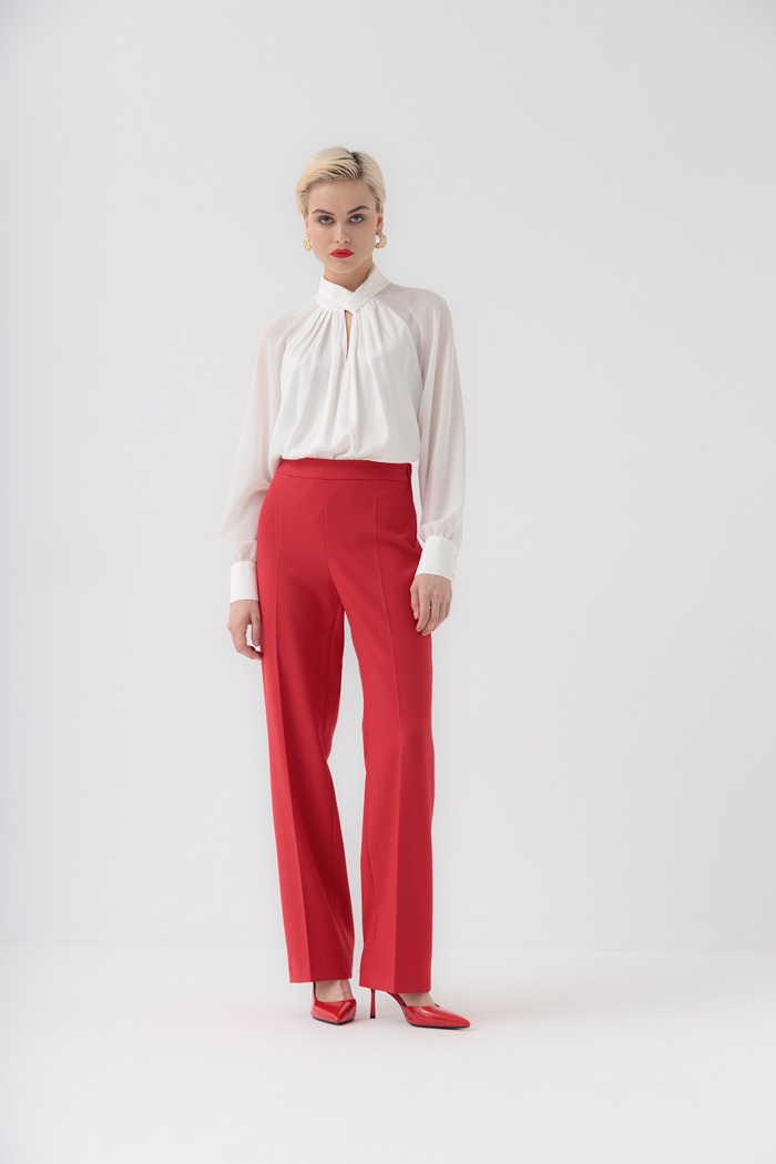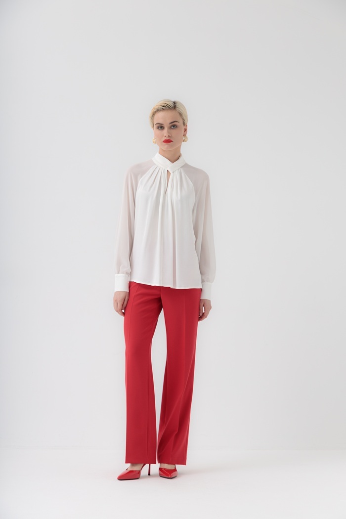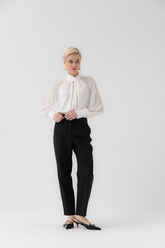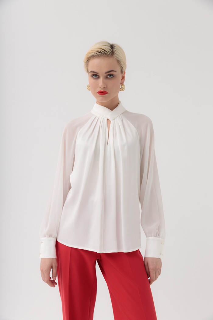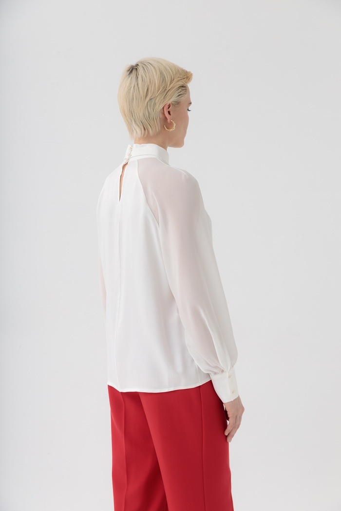 Блуза Стельвио выполнена из струящегося атласа молочного цвета с шифоновыми рукавами. Складки по горловине блузы , воротник-стойка, высокие манжеты создают нежный и романтичный образ.