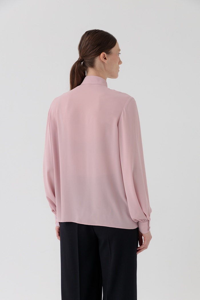 Блуза из тонкого полотна креп-шифон с длинным рукавом. Модной акцентной деталью является воротник-стойка, переходящий в шарф, который можно эффектно перебросить через плечо.