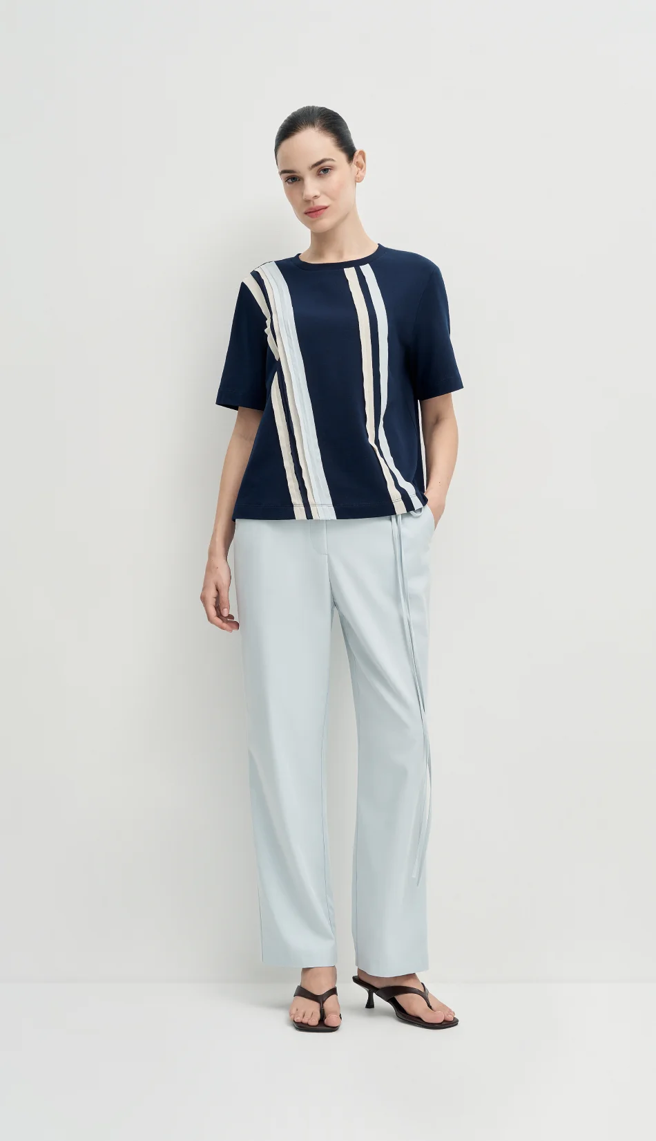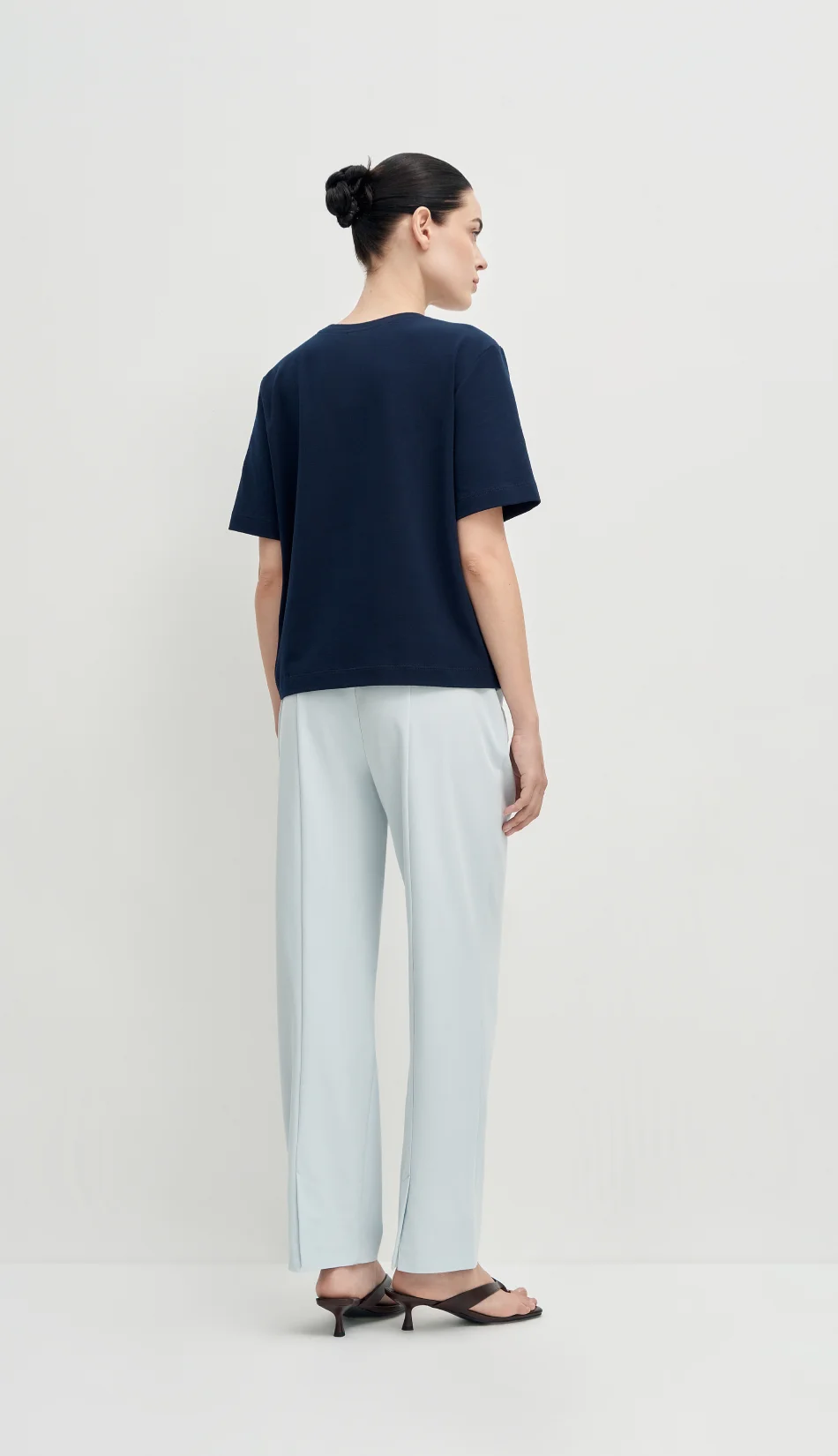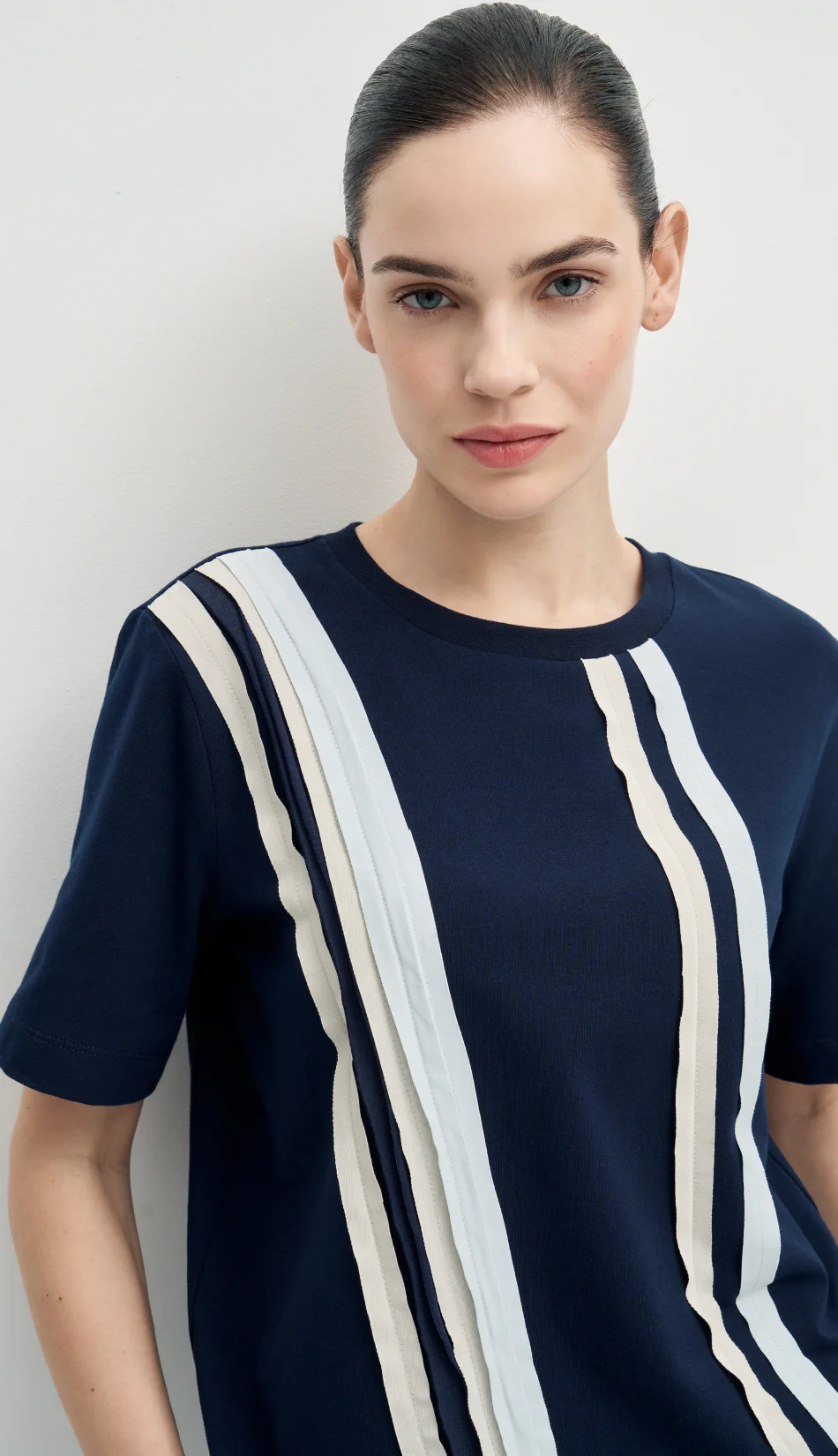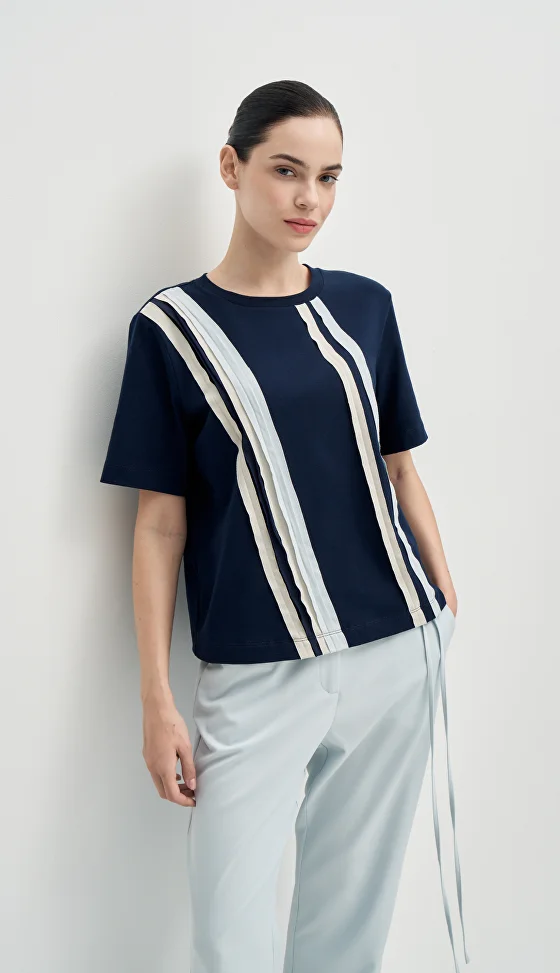 Футболка в глубоком синем оттенке с дизайнерскими акцентами в виде надстрочных элементов. Линия добавляет пластики и выводят блузу за рамки базовой, сохраняя при этом лаконичность.