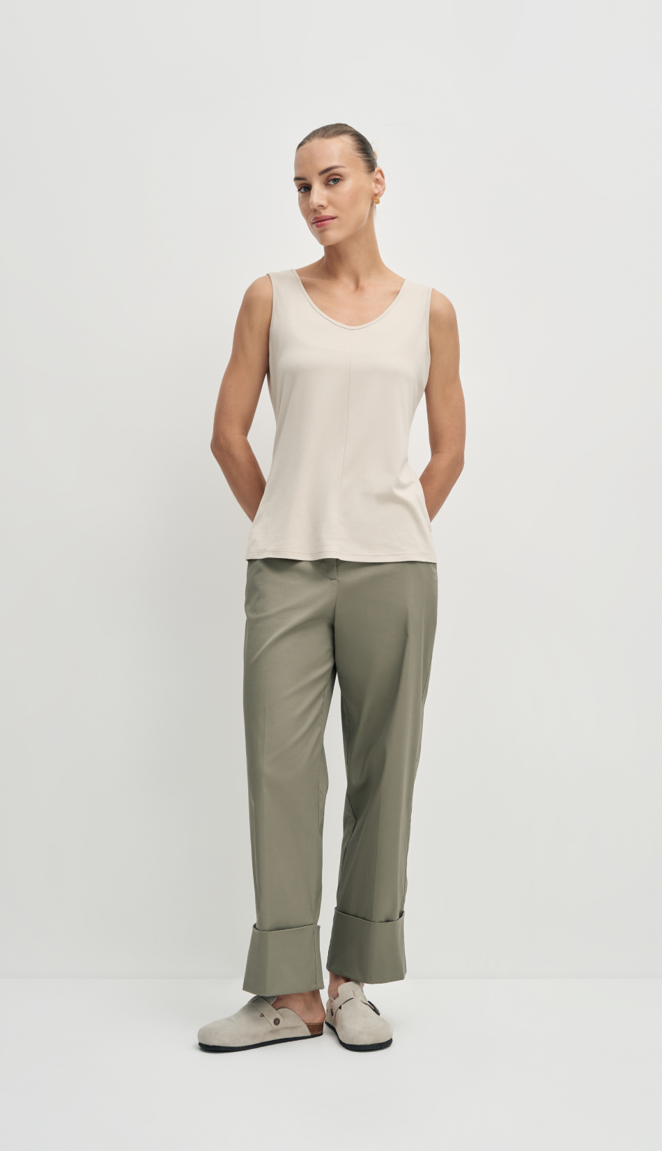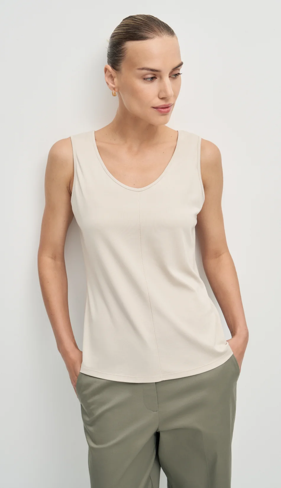 Лаконичный топ из итальянского эластичного вискозного трикотажа с декоративной строчкой посередине передней части. Базовая модель для составления любых летних образов.