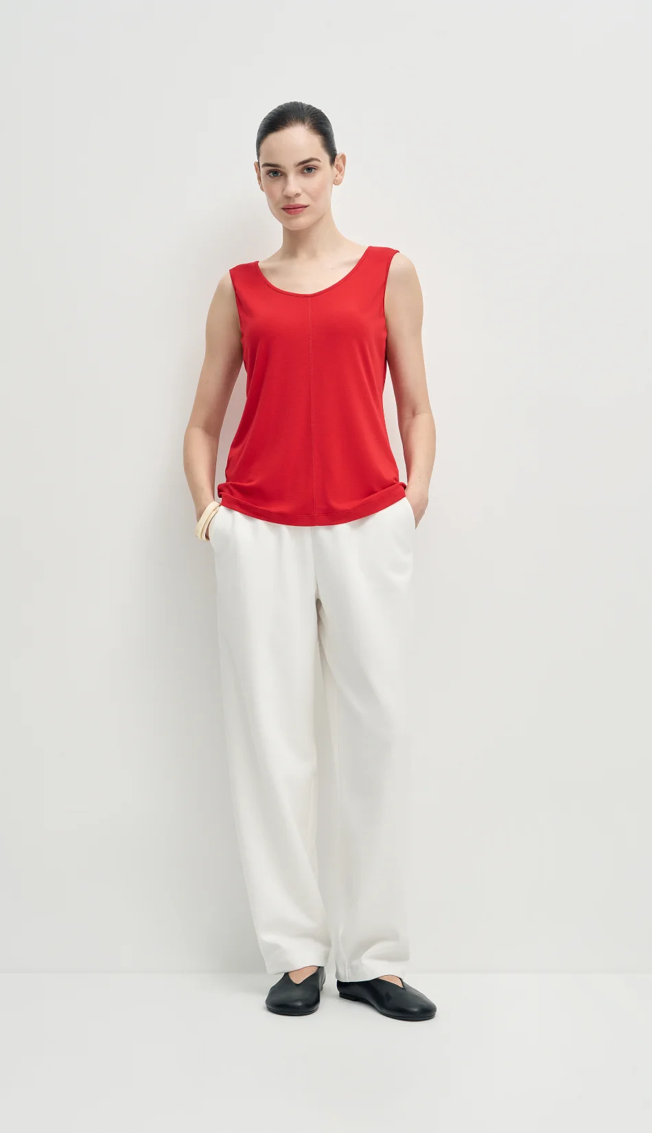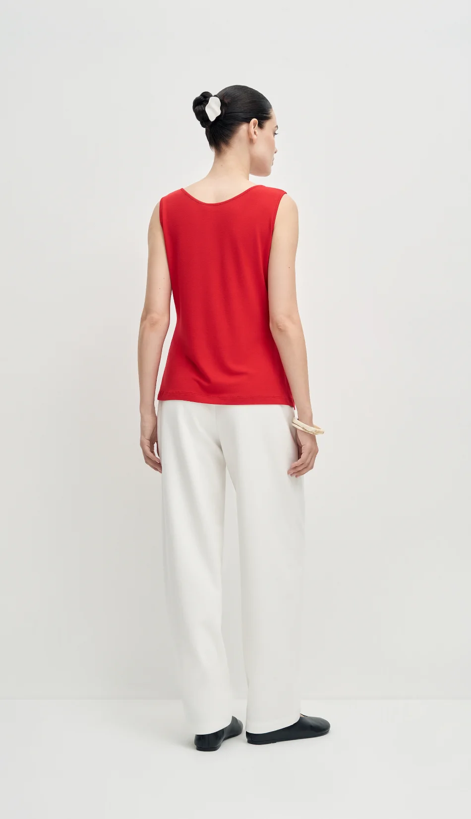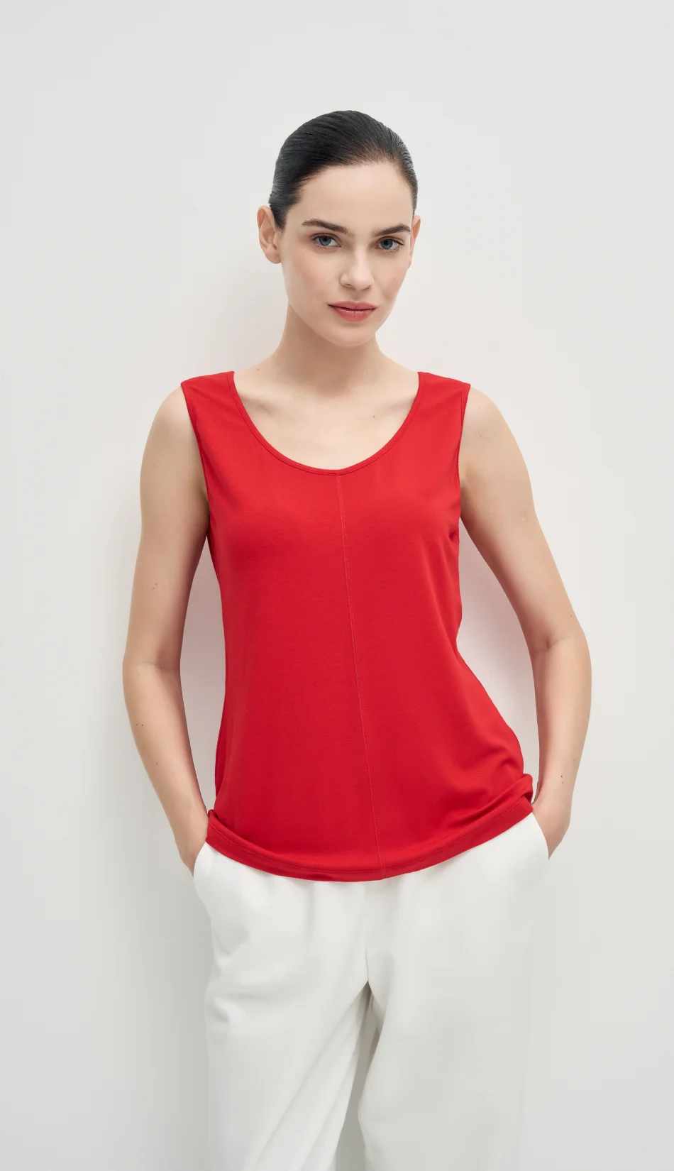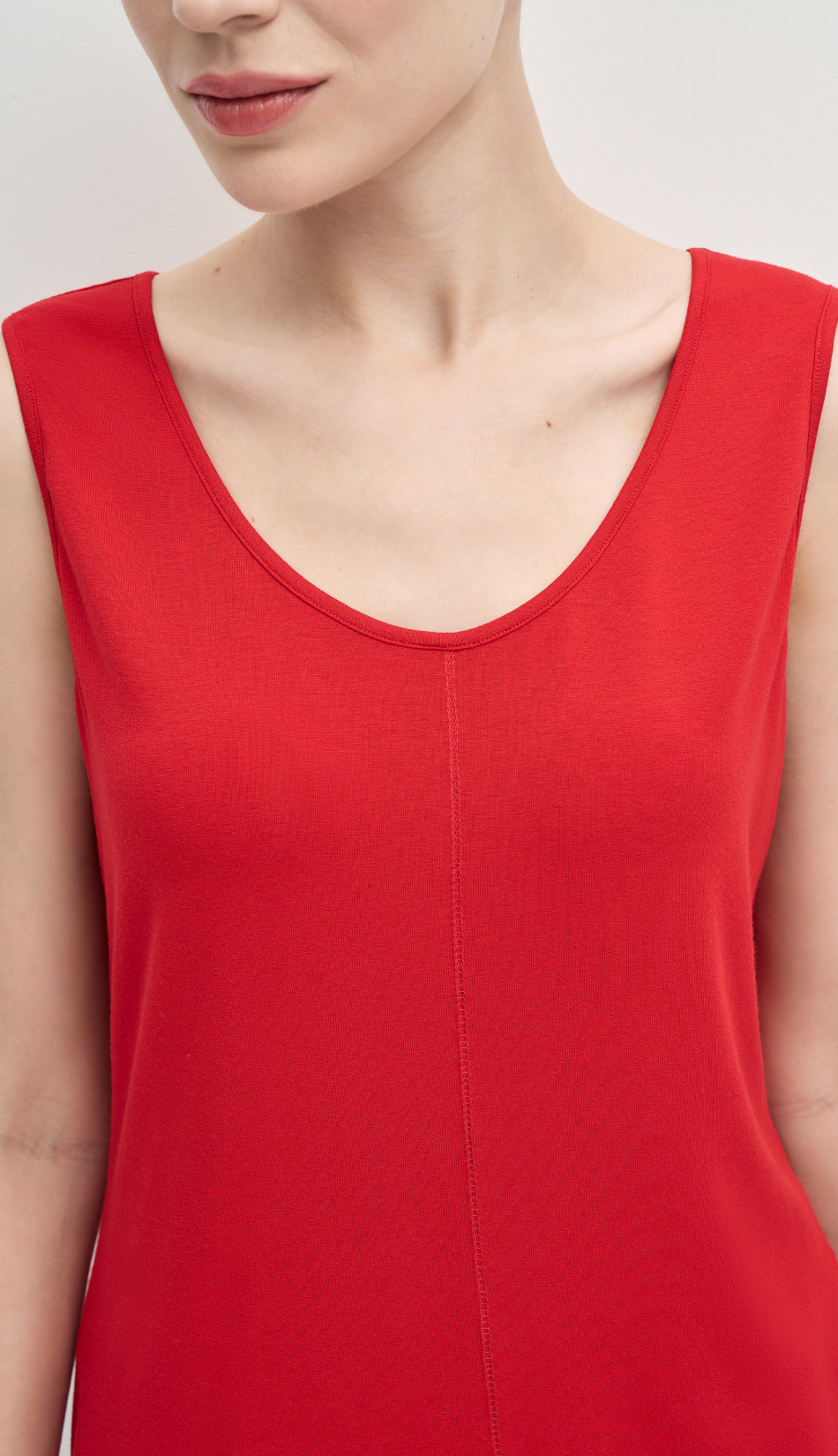 Лаконичный топ из итальянского вискозного трикотажа с декоративной строчкой по середине.Топ с круглым вырезом — универсальная база. Его можно заправить в шорты, брюки, юбку или носить навыпуск.