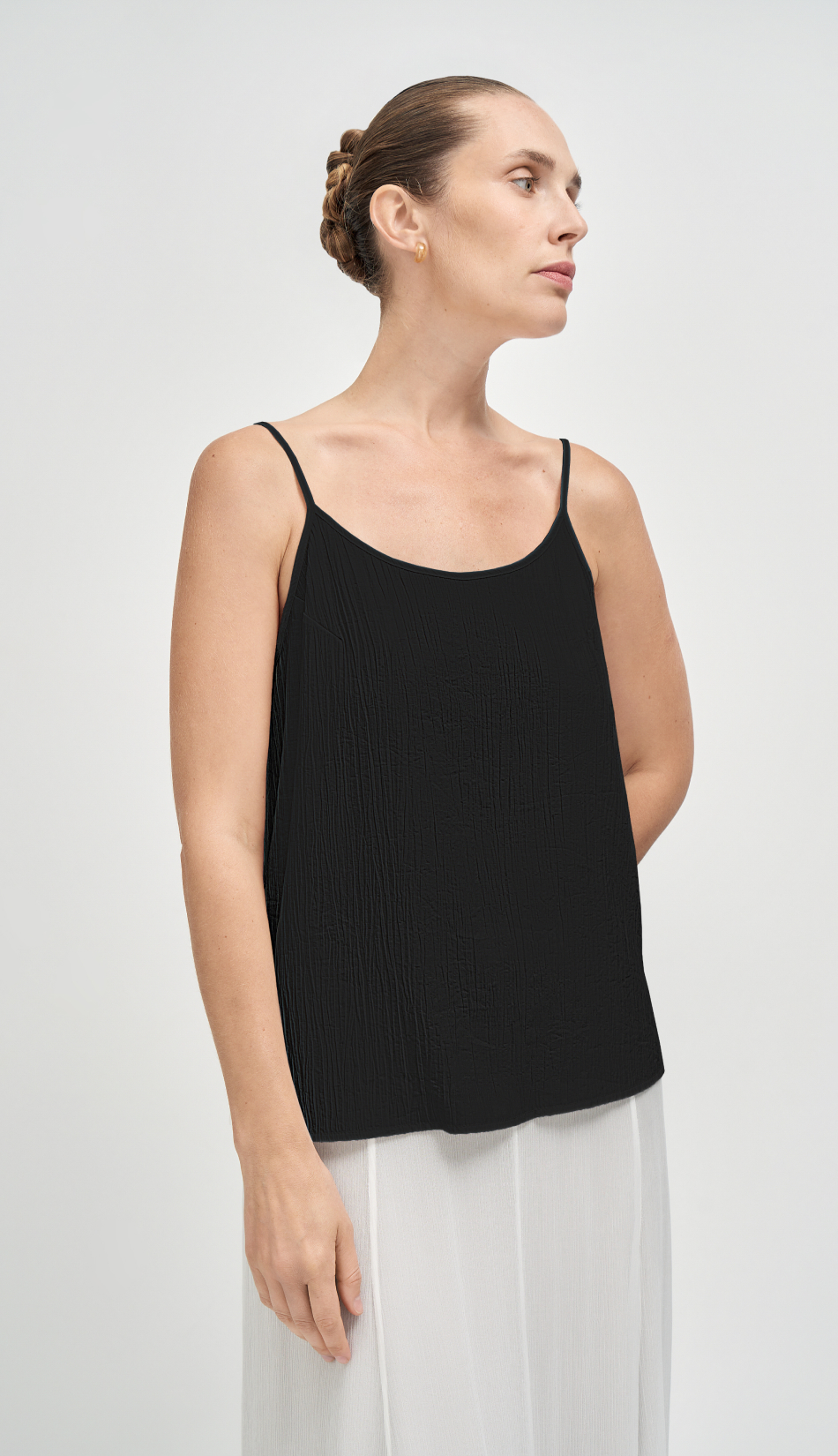 Топ из фактурной вискозы с эффектом помятости в базовом черном оттенке. Мягкая овальная линия горловины спереди и по спинке, тонкие регулируемые бретели и прямой силуэт формируют легкую, чистую форму.Благодаря минималистичному дизайну топ легко сочетается с любым верхом и низом. Небольшие разрезы по боковым швам добавляют свободу движения и подчеркивают расслабленный, современный характер модели.