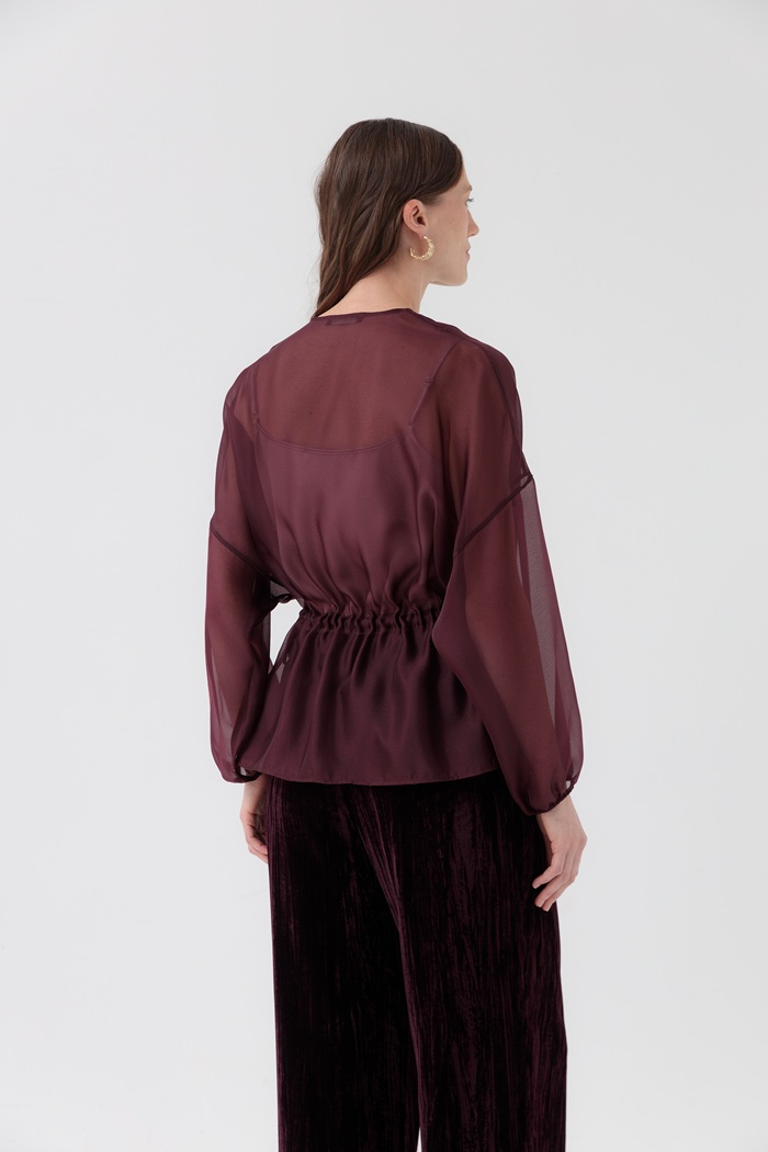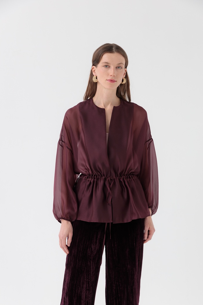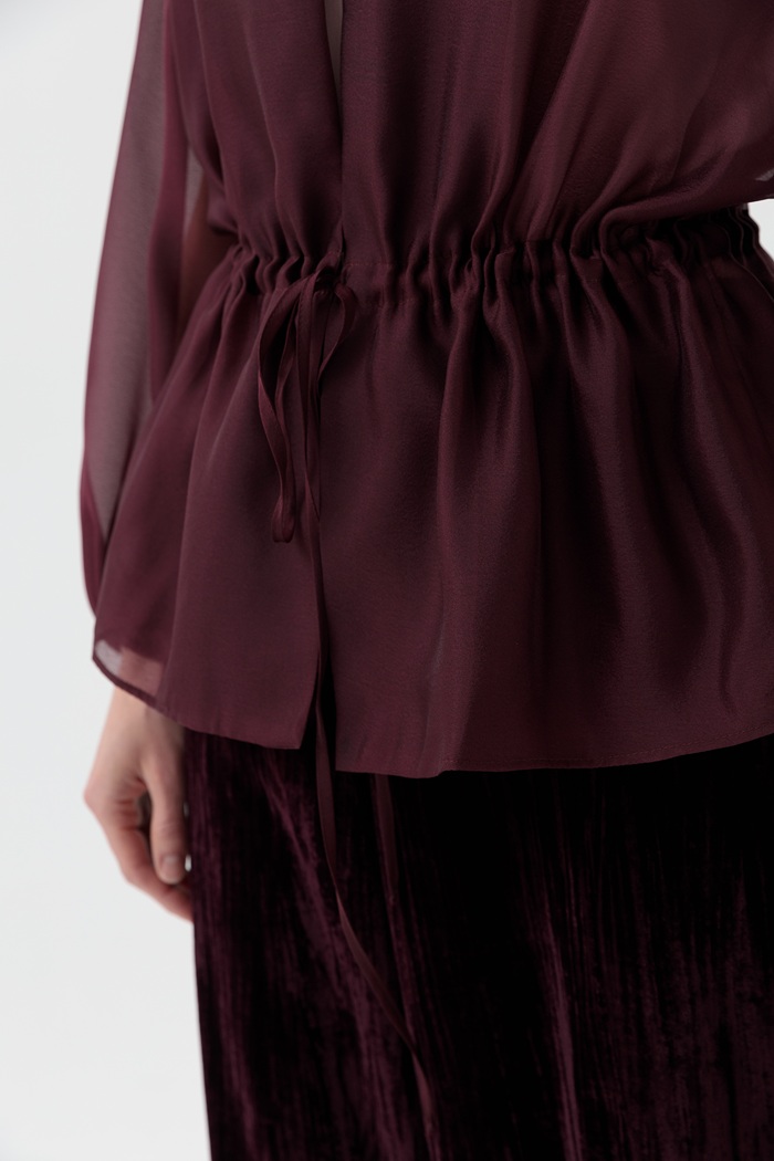 Нарядный блузон-накидка из органзы поможет создать вечерний образ благодаря пышным рукавам на эластичной резинке по низу и свободному силуэту, который регулируется завязкой-кулисой по талии. Создавайте эффектные образы с нашими моделями из новогодней коллекции.