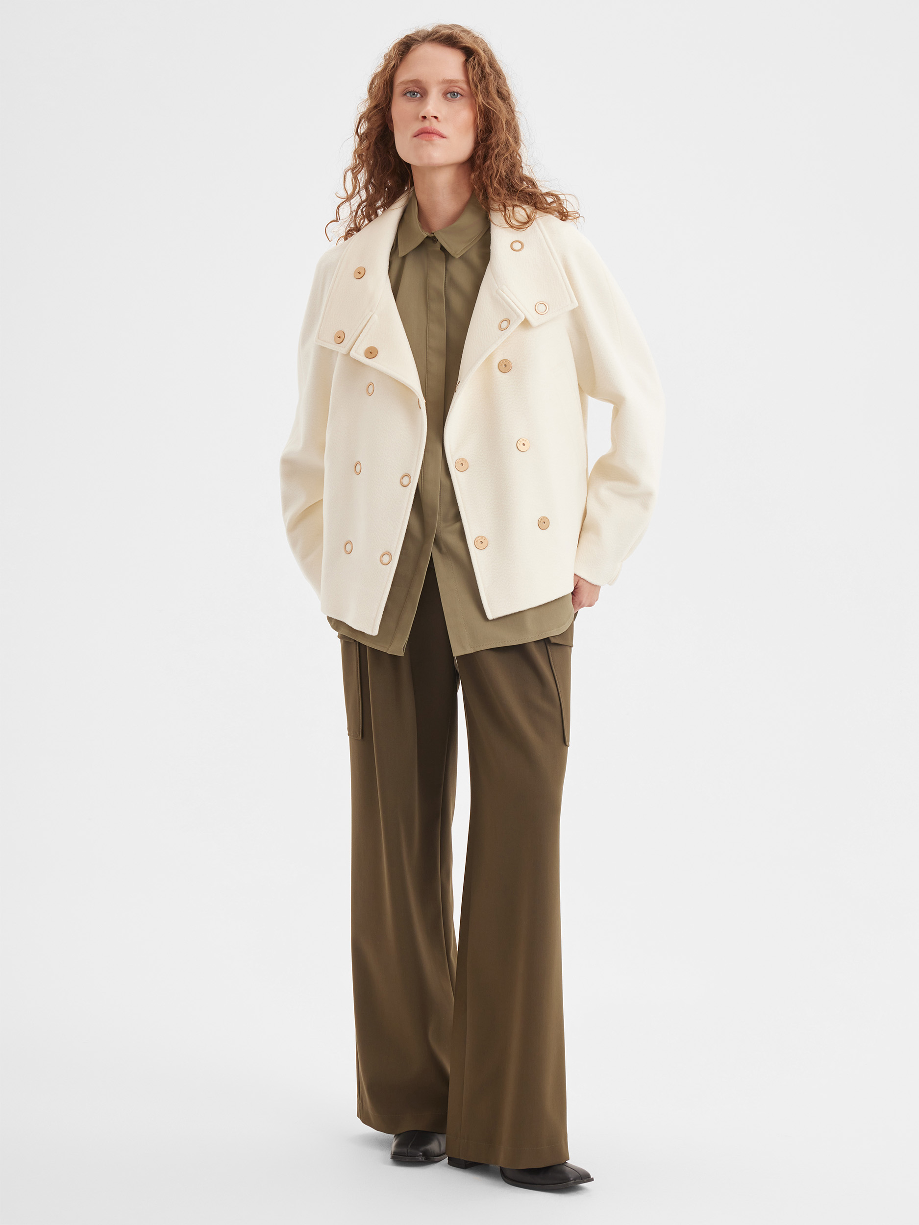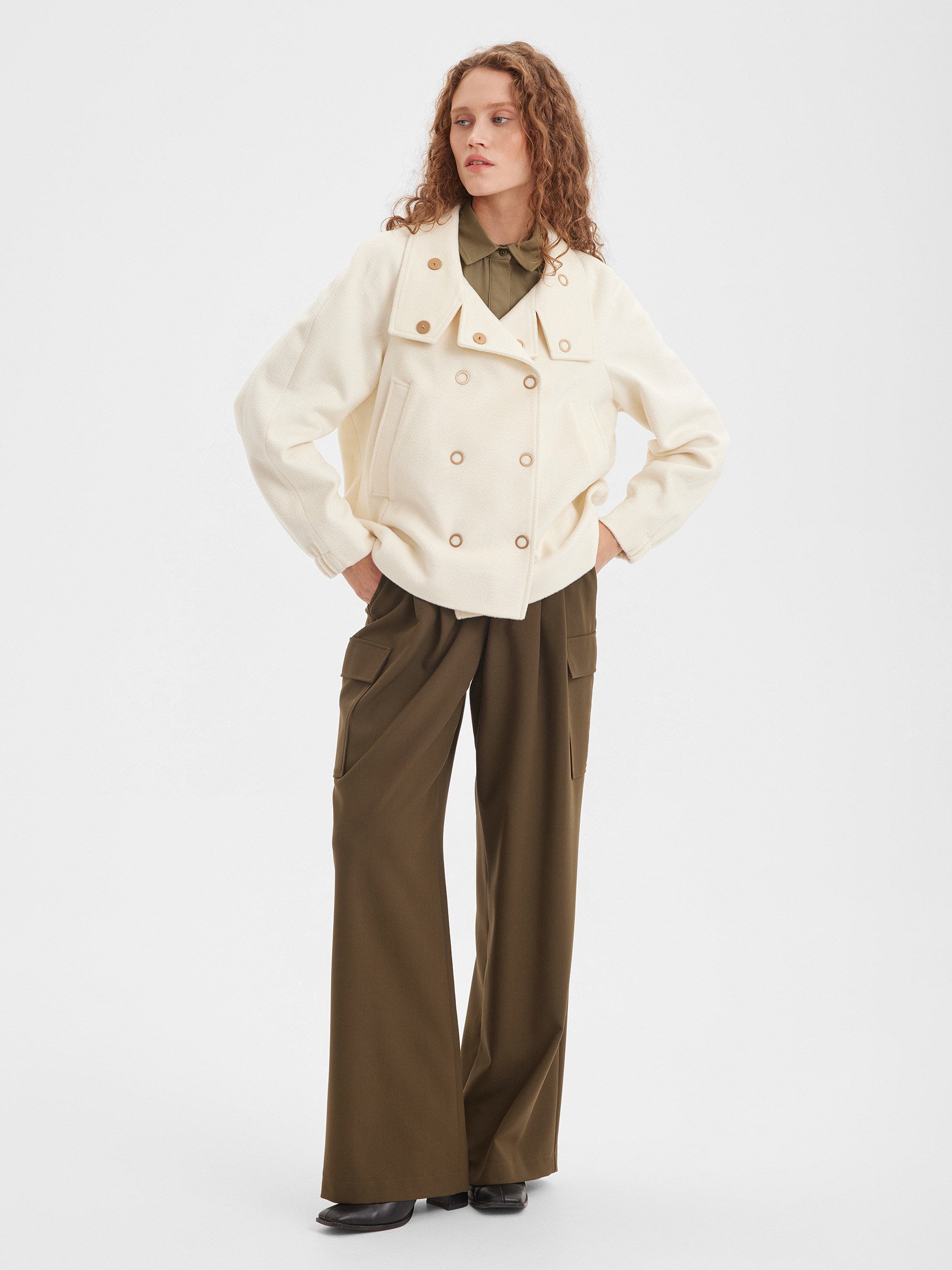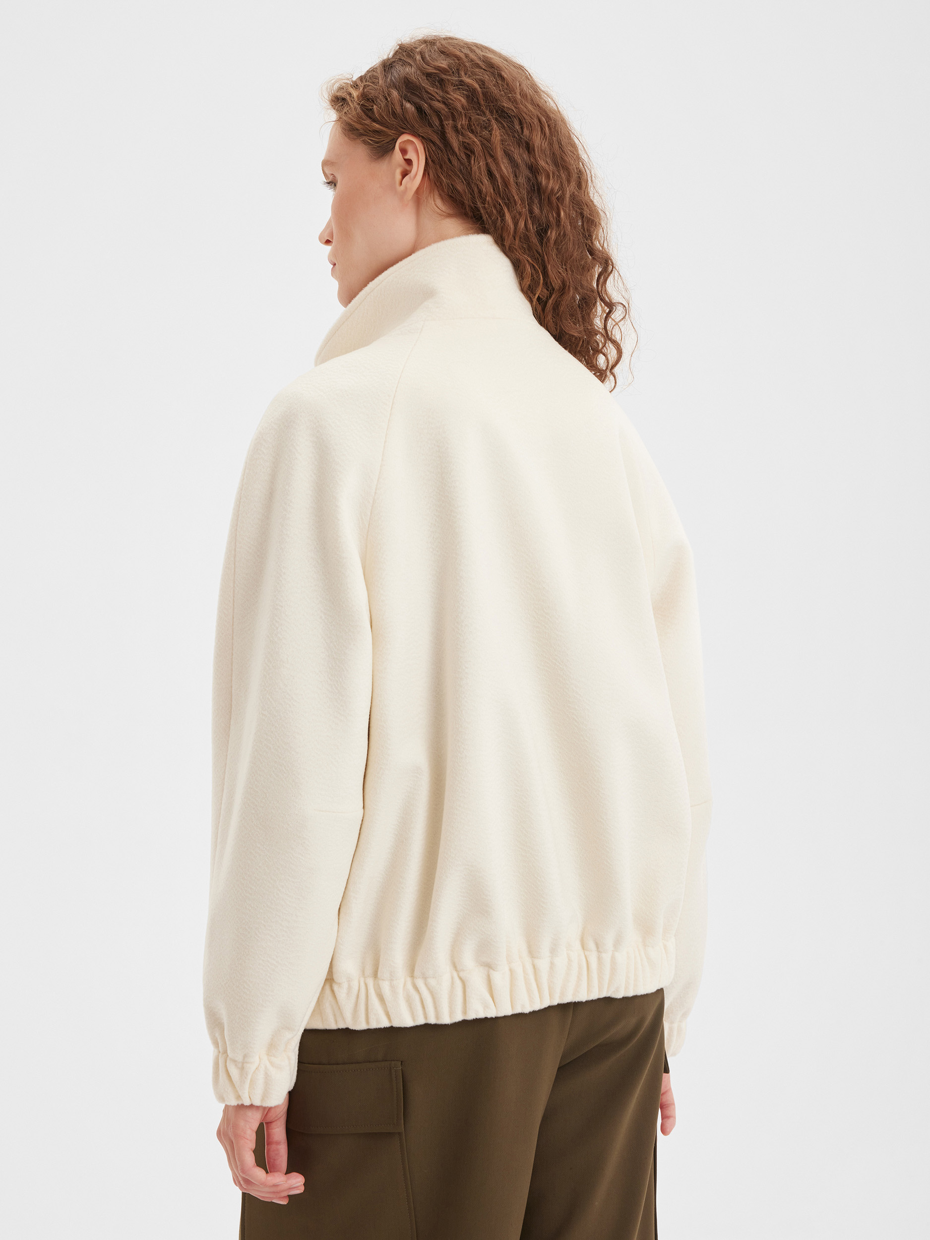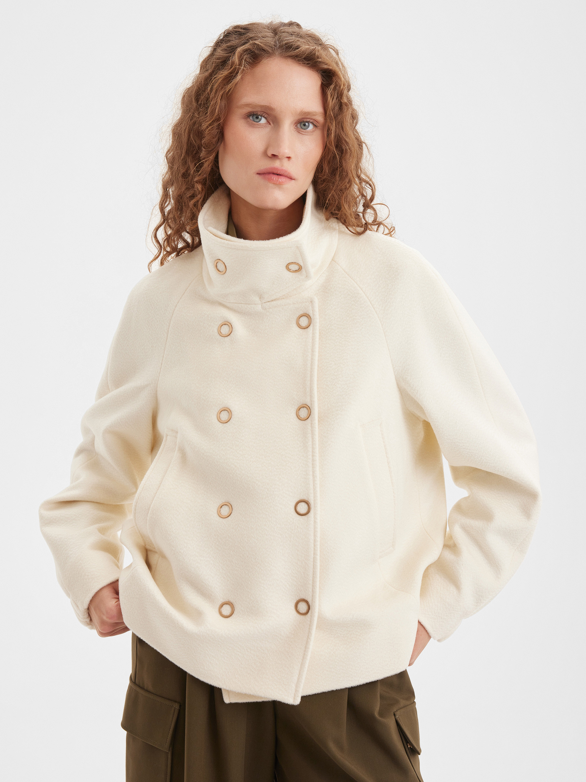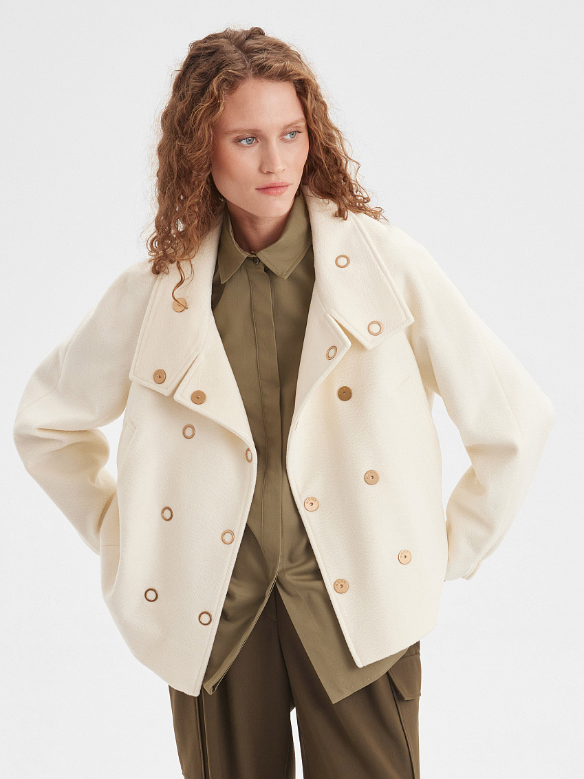 Пальто - бомбер из молочной чистошерстяной ткани с фактурой елочка. О-образный силуэт демисезонного пальто-бомбера достигается за счет объема изделия и резинки по низу спинки. Рукава реглан создают плавность плечевого пояса за счет кроя и резинки по низу. Застежка двубортная, на металлических кнопках матового серебряного цвета. Воротник - стойка создает скульптурность силуэта. Чтобы стиль выглядел расслабленным, не застёгивайте воротник. Вертикальные карманы расположены на уровне талии. По стилю пальто-бомбер сочетается с брюками и джинсами, платьями или юбками прямого силуэта, длинными или короткими.