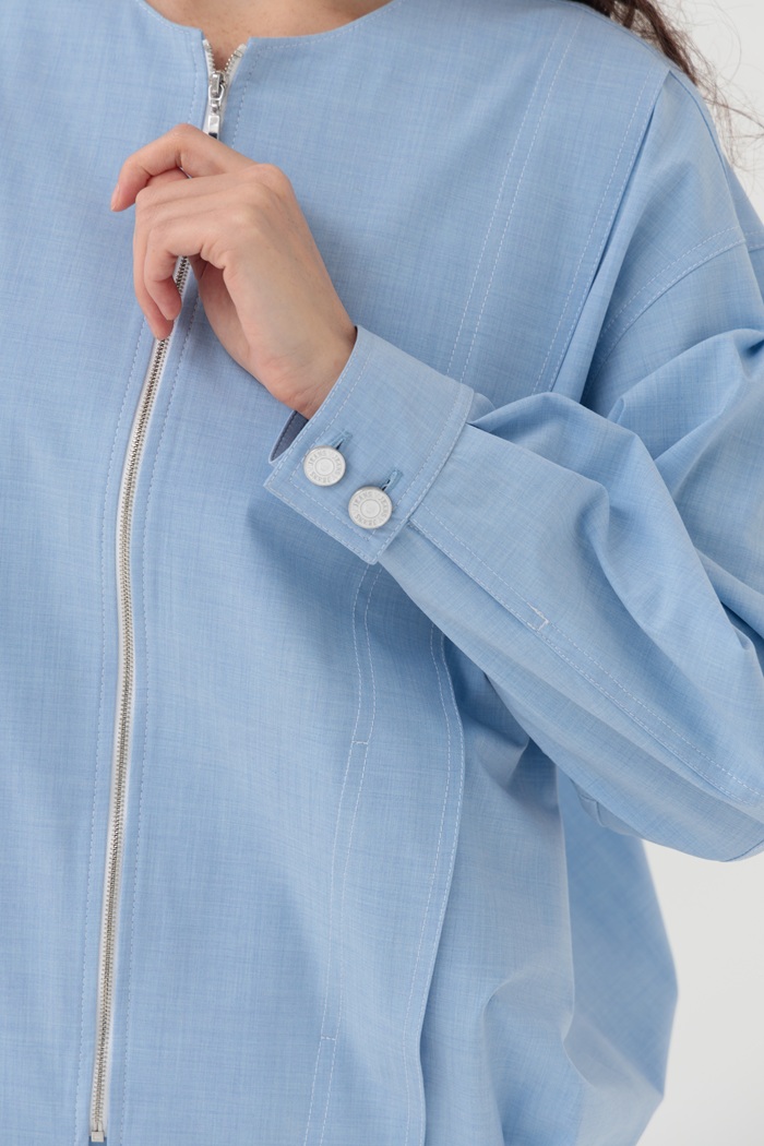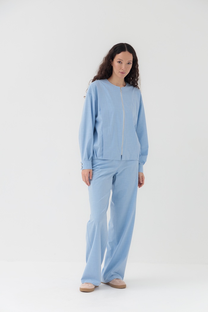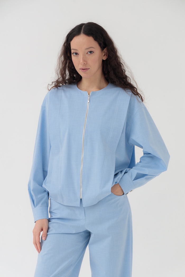 Бомбер Ольбия выполнен из тонкой костюмной ткани с добавлением вискозы. Бомбер объемного силуэта с застежкой-молнией. Круглый вырез горловины и длинные рукава с манжетами. Акцентной деталью служат складки по переду и складки по низу изделия.