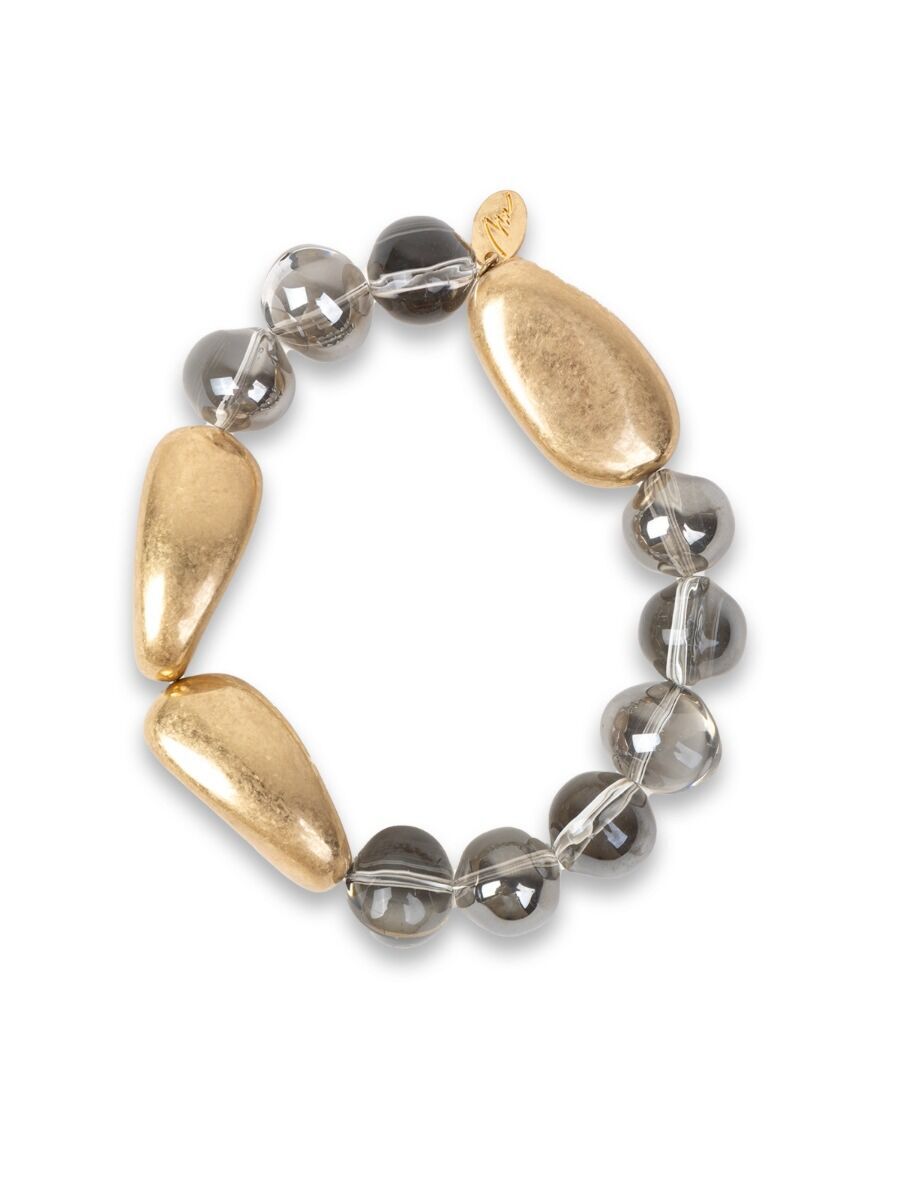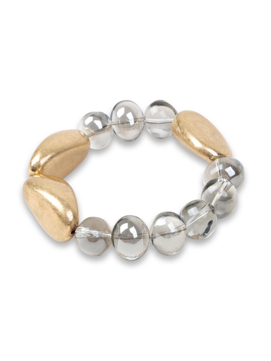 Изысканный браслет на резинке выполнен из качественных стеклянных бусин, напоминающих капсулы с водой, и крупных металлических матовых вставок оригинальной формы цвета состаренного золота. Сочетание стекла и металла делает аксессуар воздушно-прозрачным и брутальным одновременно. Такой аксессуар можно сочетать с одеждой как в классическом или вечернем стилях, так и в стилях кэжуал, спорт-шик, неформальном или молодежном. Вы будете выглядеть всегда женственно, ярко, модно и неповторимо, используя его в своем образе.