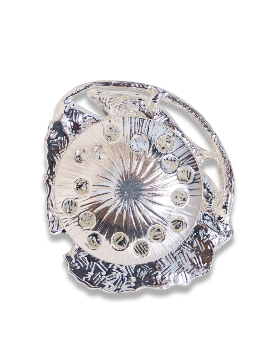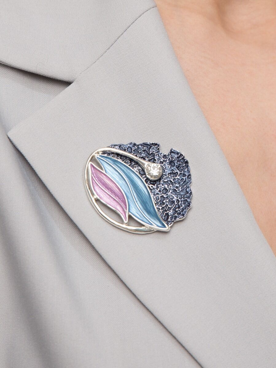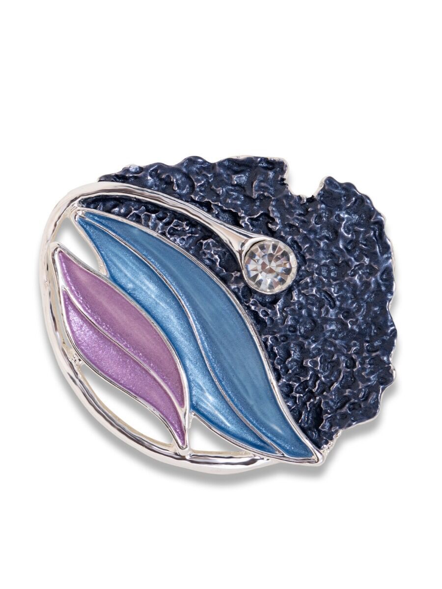 Изысканная брошь из серебристого металла покрыта эмалью различных оттенков синего, лилового и голубого, декорирована оригинальными вставками. В культурах многих народов оттенки синего символизируют покой и вечность. Застежка - магнит. Броши на магнитах завоевали любовь и пользуются спросом на протяжении многих сезонов, они не оставляют проколов и зацепок, магнитная застежка хорошо крепится на верхней одежде и лацканах пиджаков. Этот аксессуар всегда поможет оживить офисный или простой монохромный образ, идеально подойдет как к вечернему наряду, так и к заданному дресс-кодом официальному костюму.