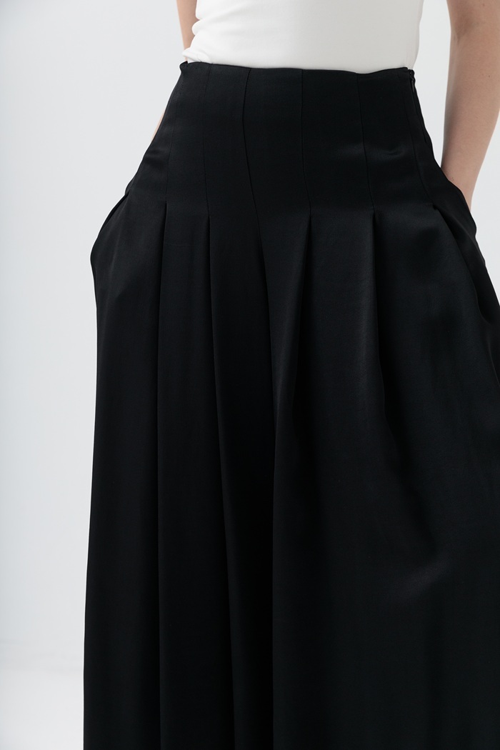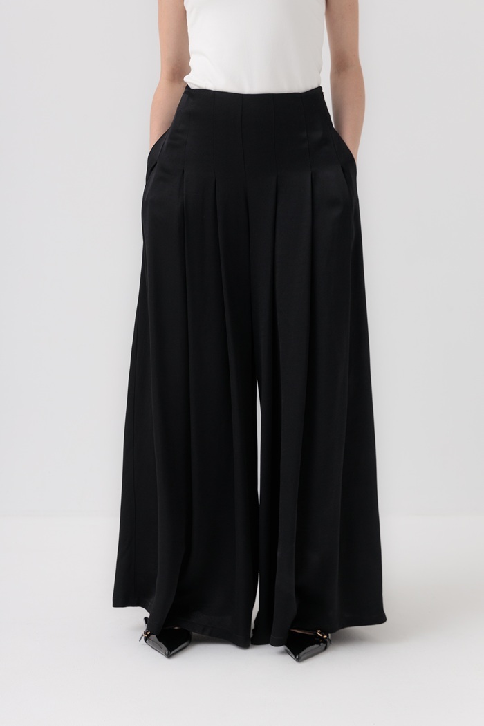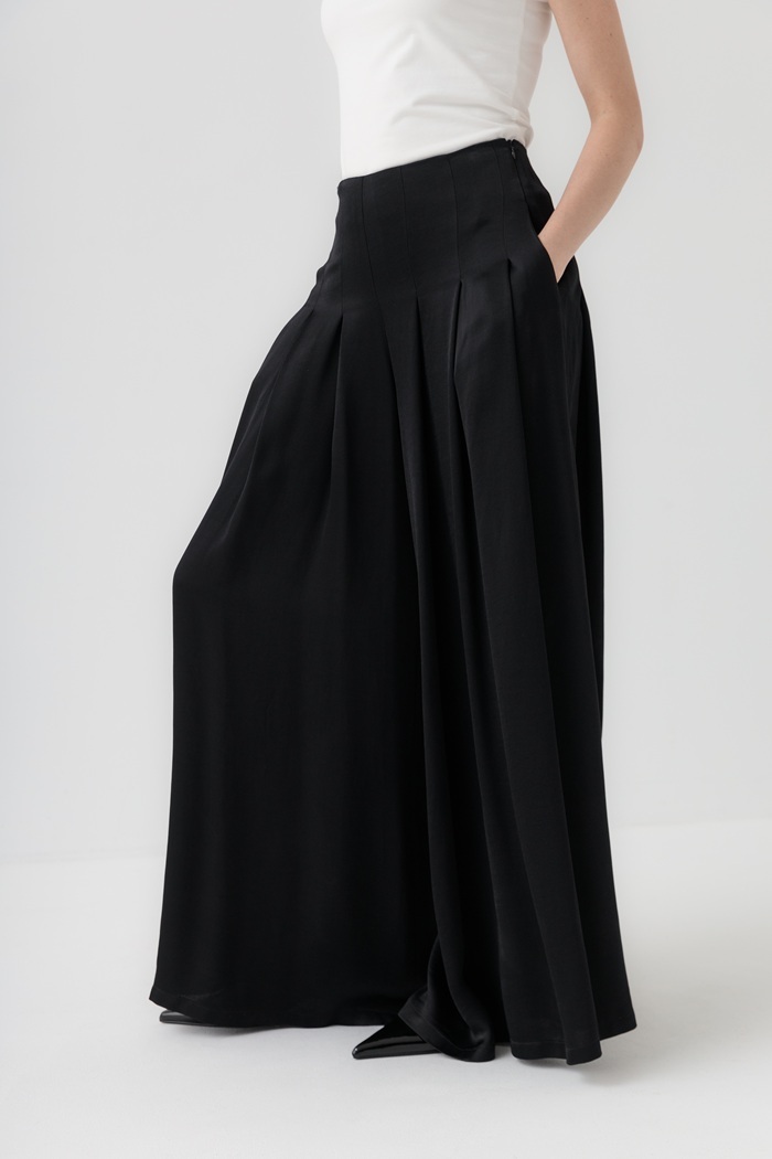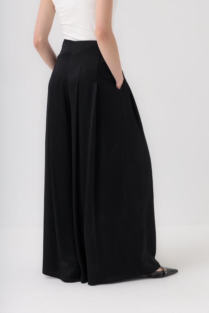 Стильные юбка-брюки из черного шелковистого атласа с широкими складками спереди и сзади.
