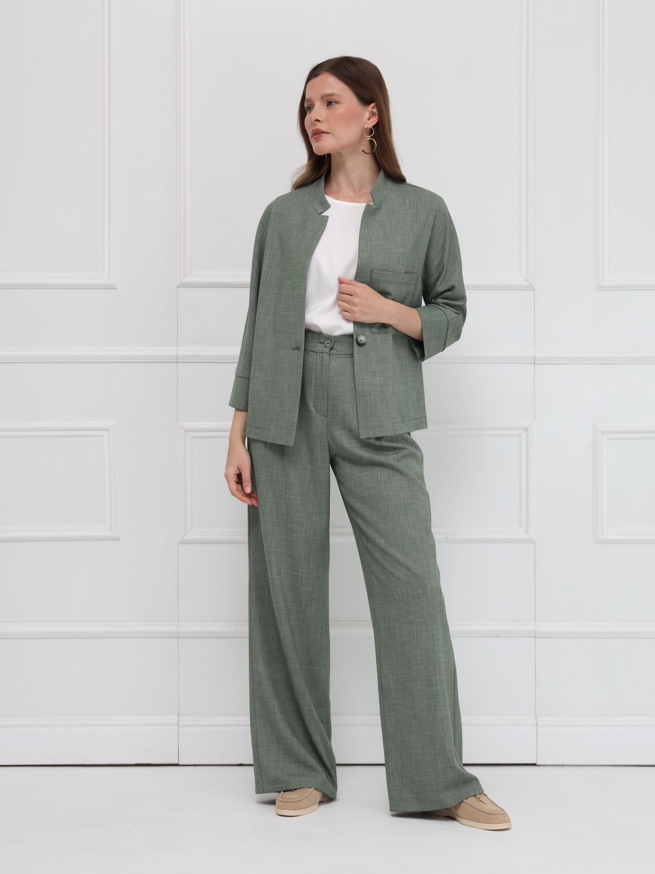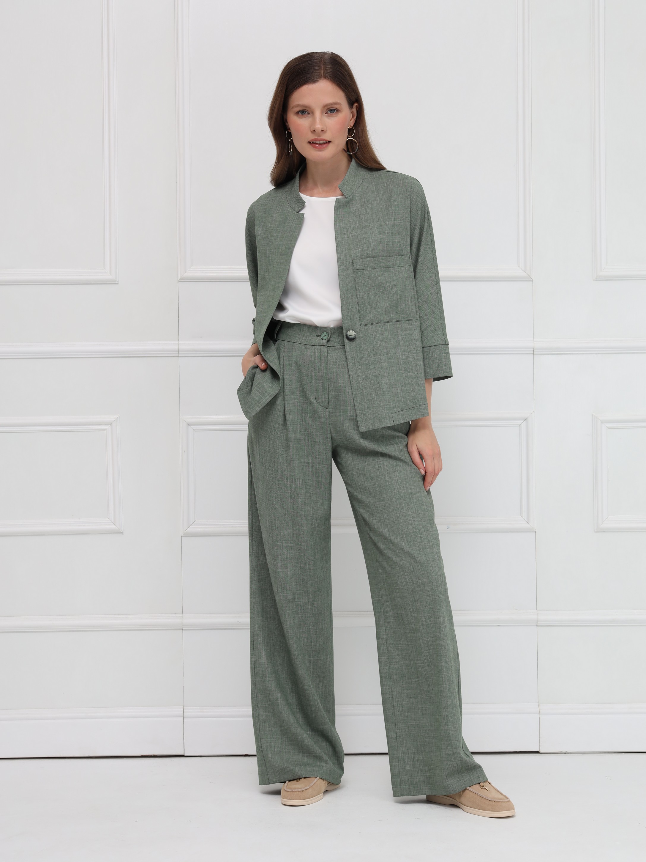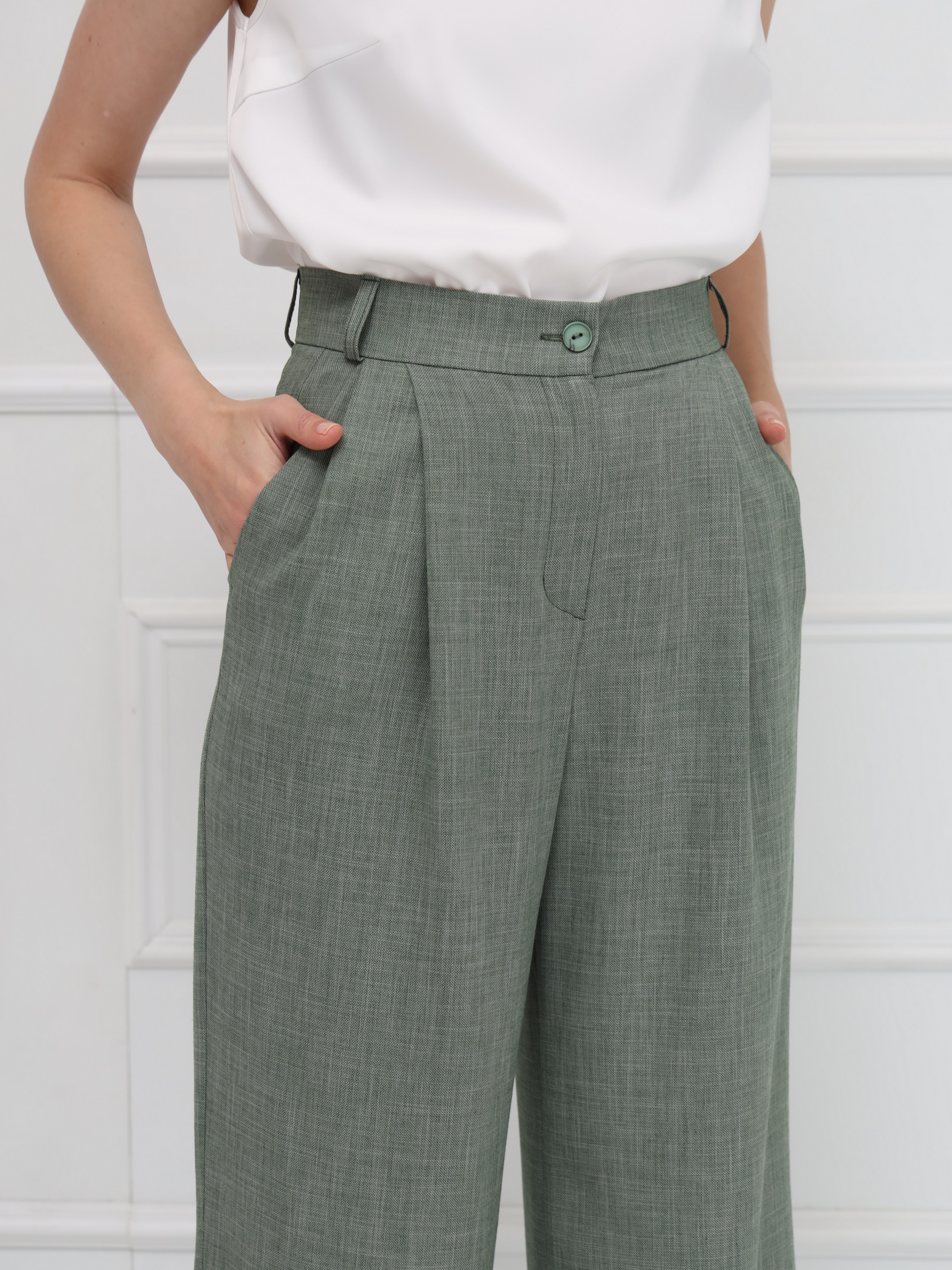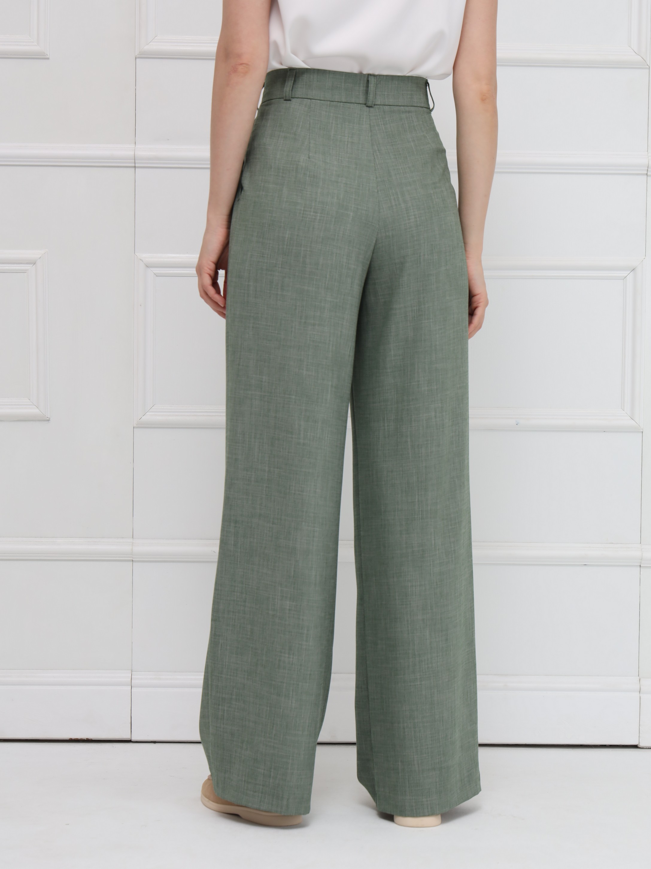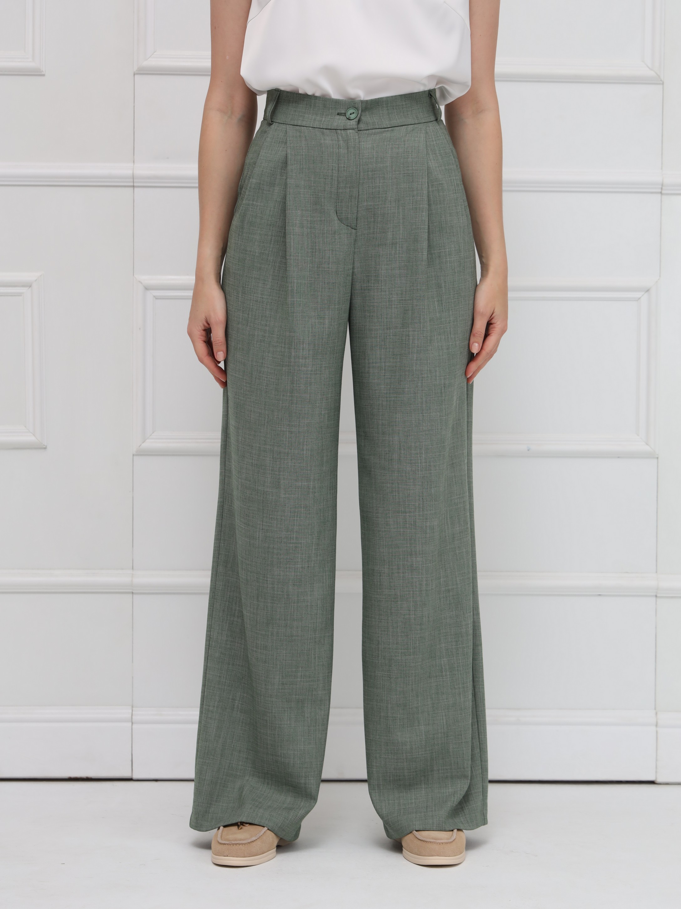 Широкие брюки-палаццо с высокой посадкой подчёркивают линию талии и создают плавный, женственный силуэт благодаря мягким складкам. Модель выполнена из тонкой костюмной ткани с деликатной льняной фактурой, что добавляет образу утончённой естественности и лёгкости. Брюки имеют длину в пол, аккуратный гульфик, удобные боковые карманы и шлёвки на поясе - идеальная база для современного гардероба.