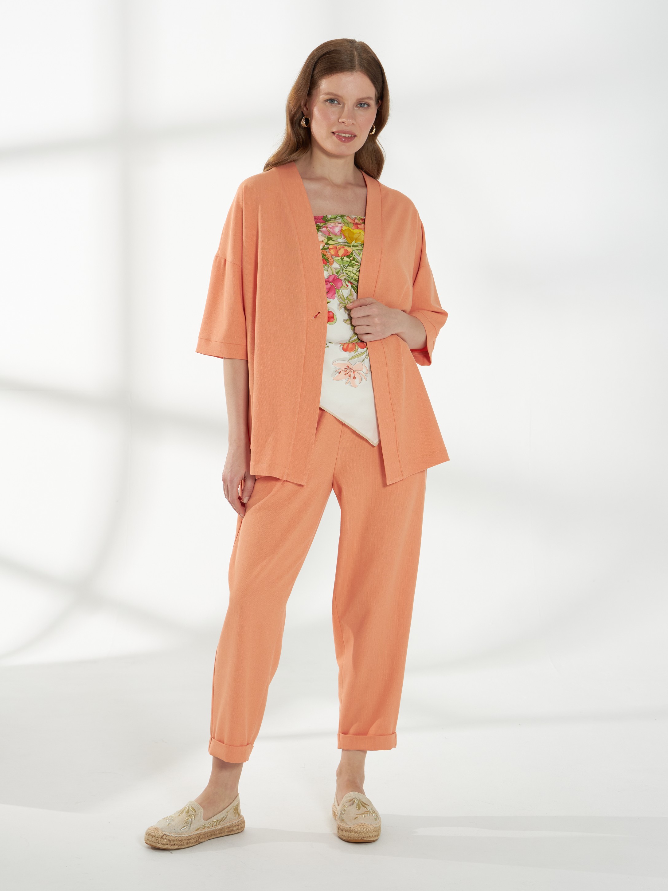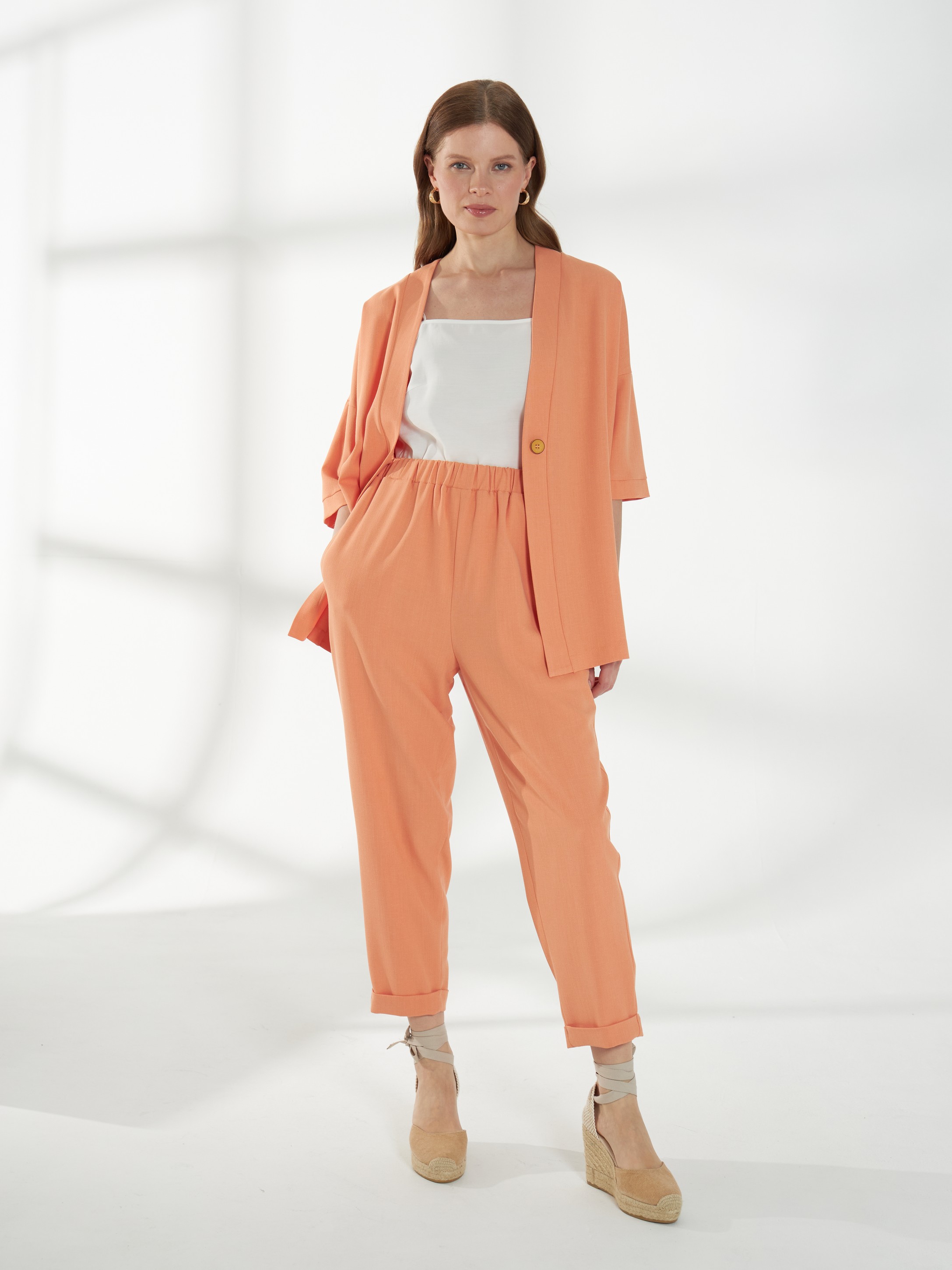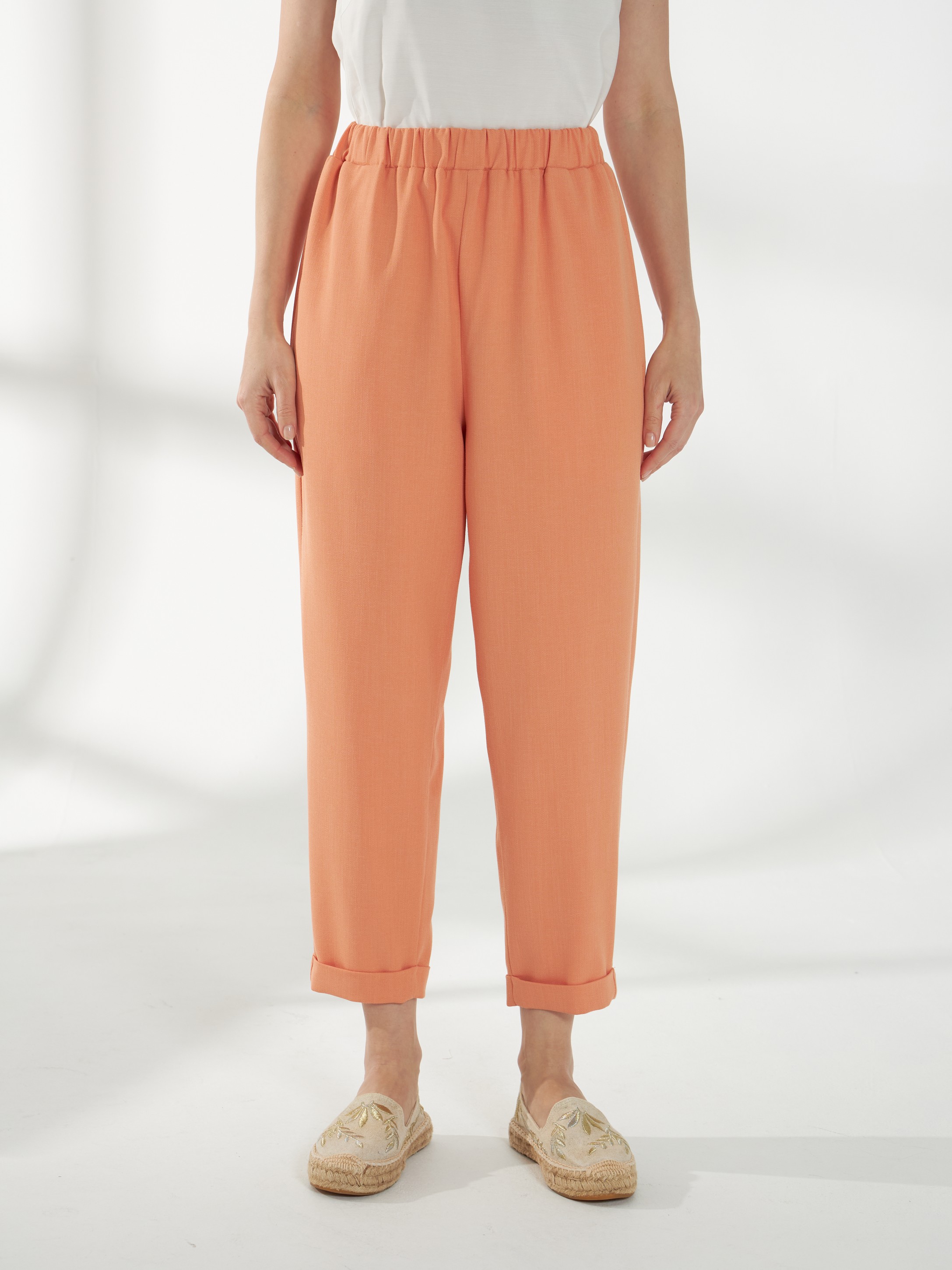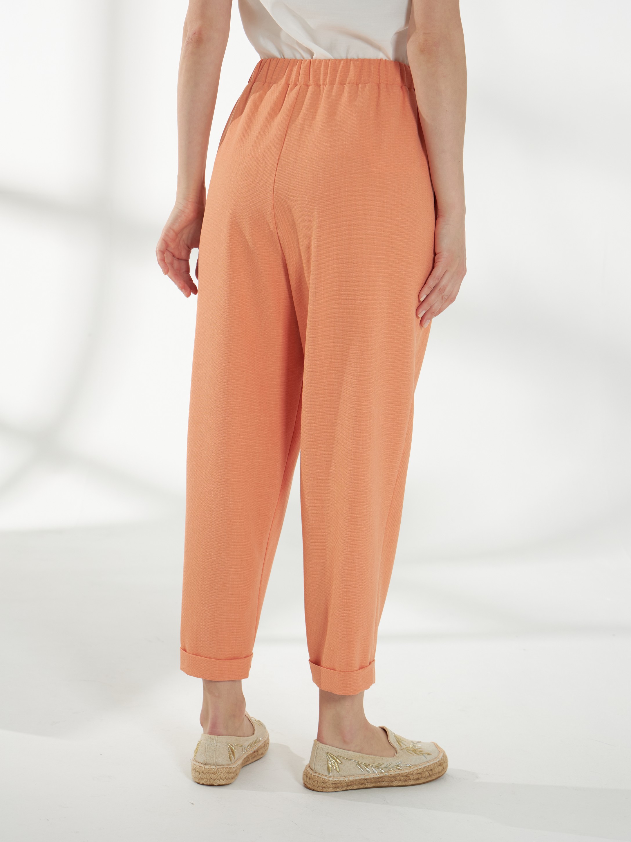 Расслабленные брюки в апельсиновом оттенке с длиной 7/8. Силуэт свободный сверху и зауженный книзу, создаёт аккуратную и современную линию. Широкий пояс с резинкой внутри обеспечивает комфортную посадку, боковые карманы добавляют практичности, а лёгкая, дышащая и пластичная ткань гарантирует удобство и свободу движений.