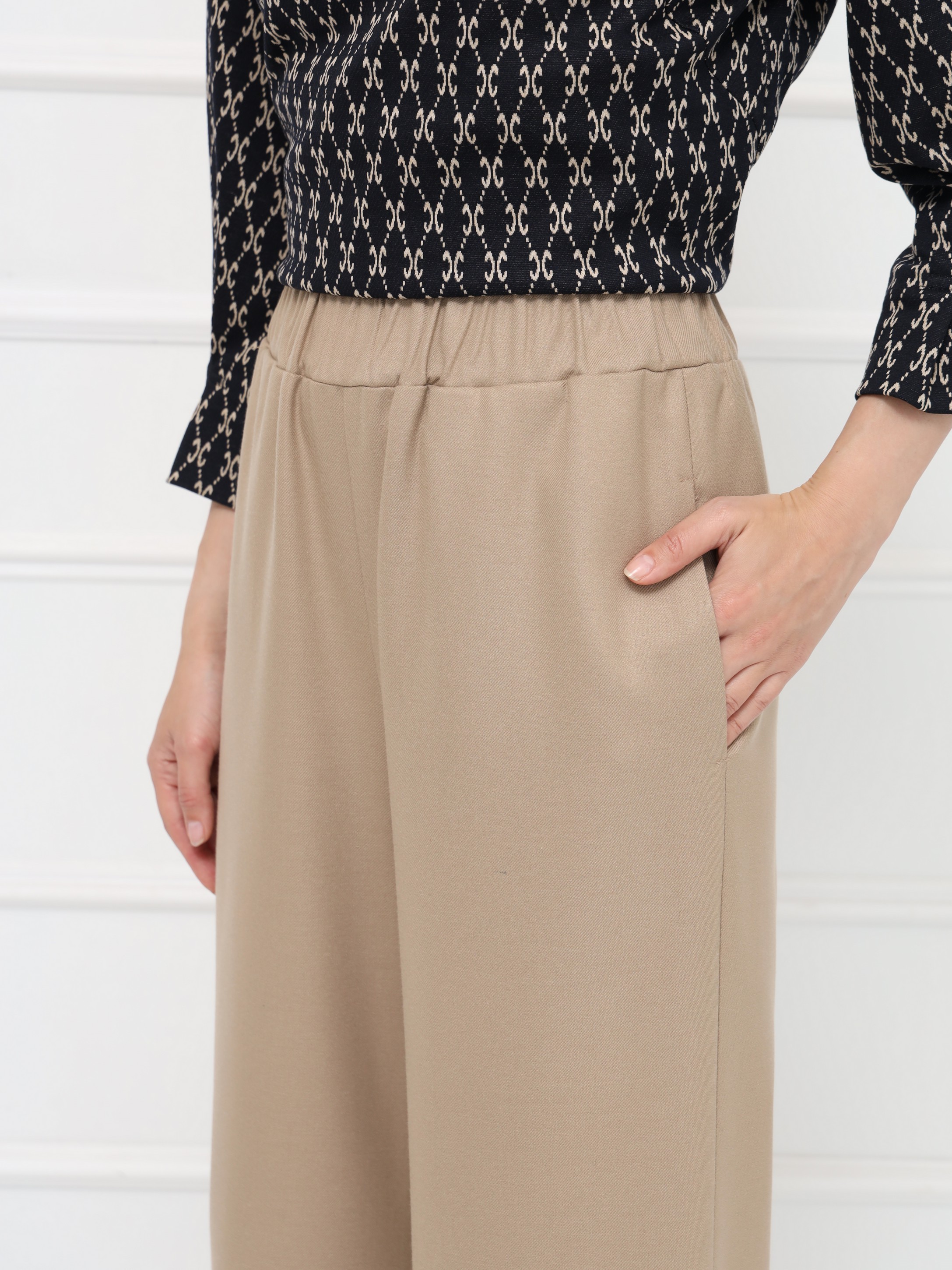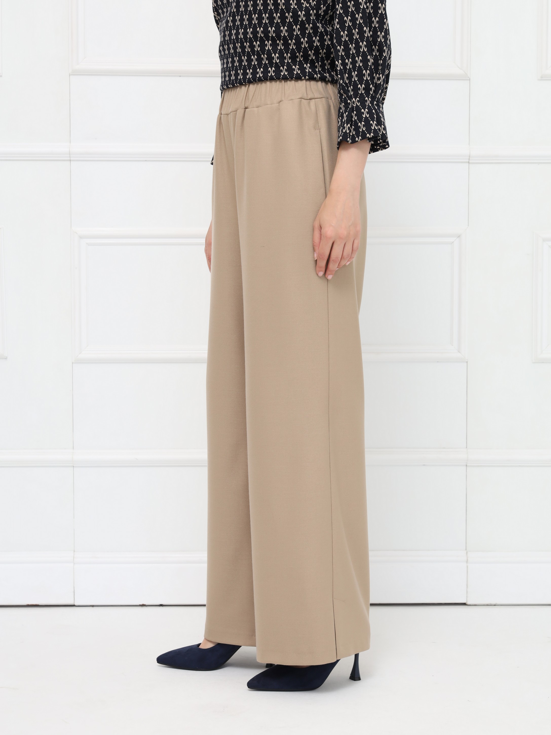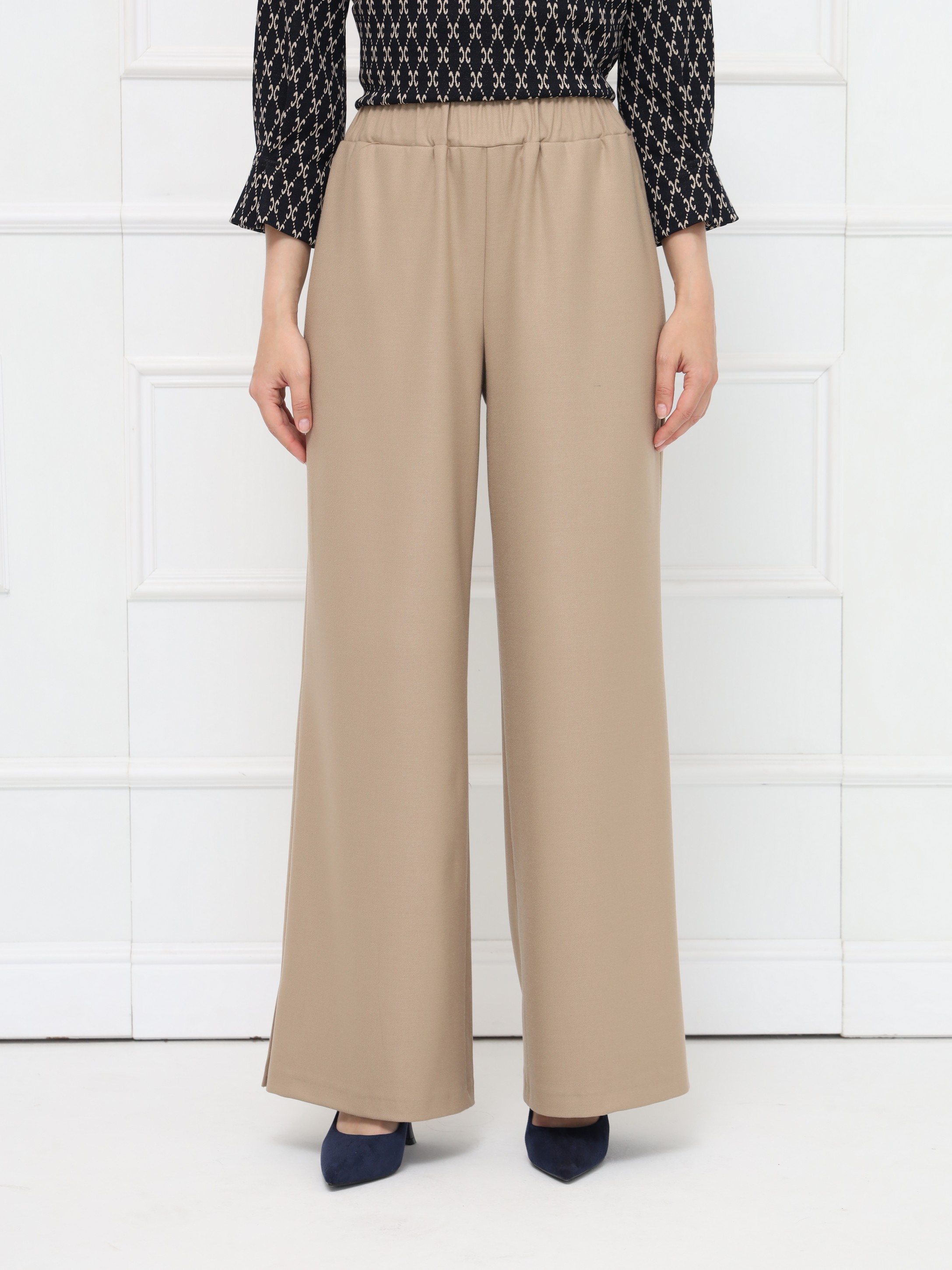 Брюки прямого кроя в актуальном песочном оттенке — must-have для современного гардероба. Плотная костюмная ткань держит форму и выглядит безупречно в течение всего дня. Боковые карманы делают модель практичной, а широкий пояс с резинкой обеспечивает комфортную посадку без лишних застёжек. Аккуратные шлицы по бокам придают образу лёгкость и динамику, создавая идеальную пару к блузам и джемперам.