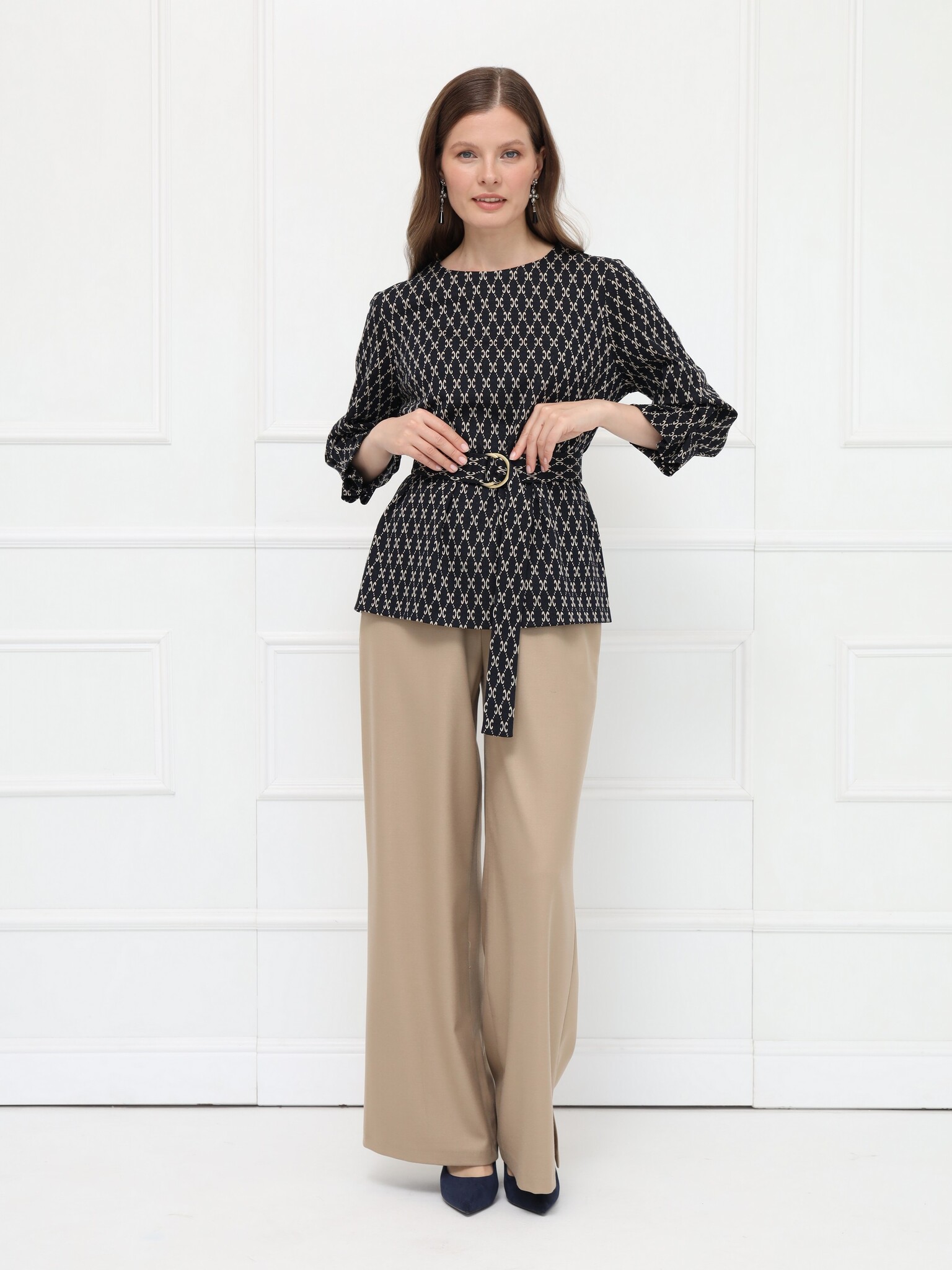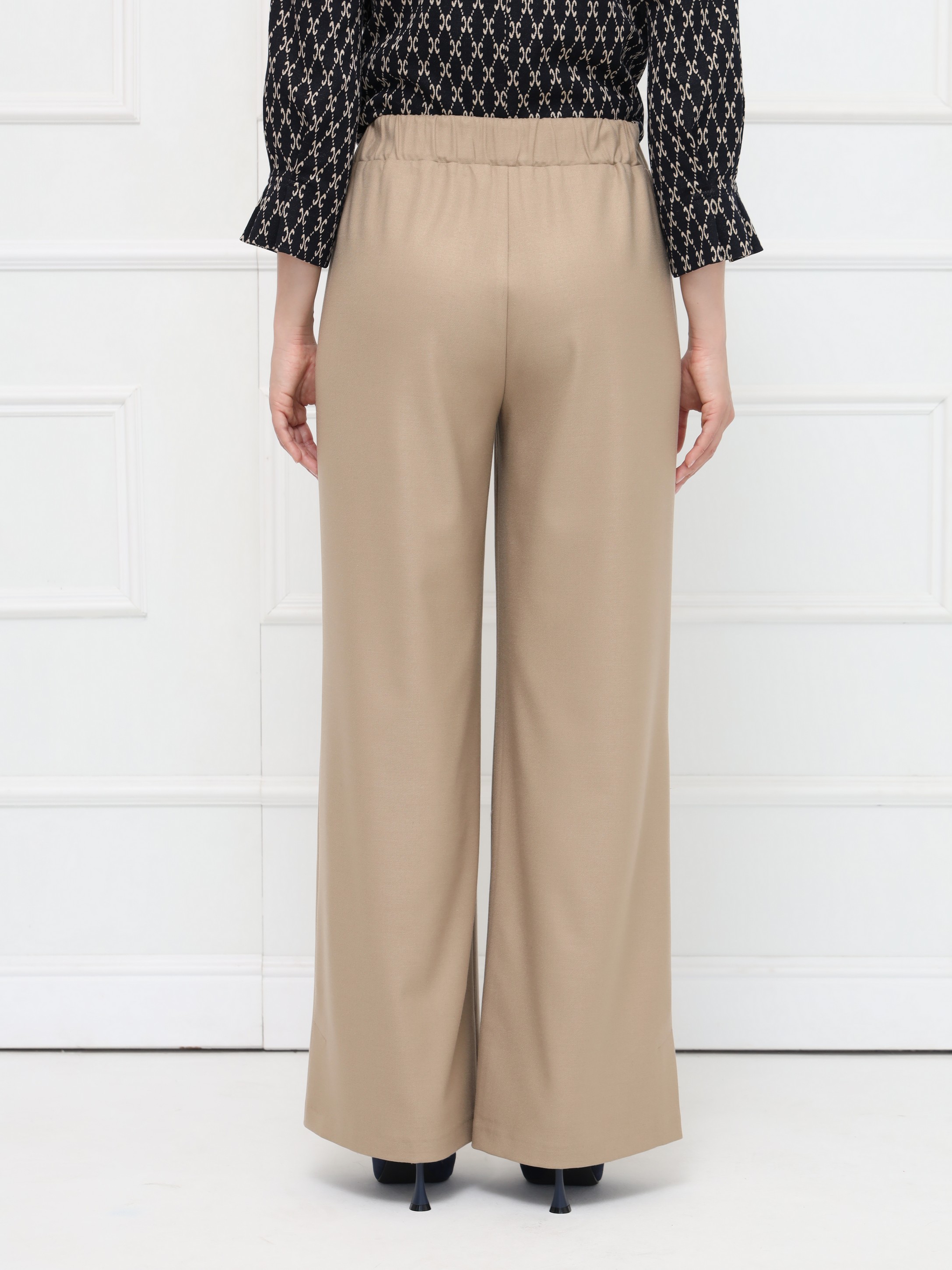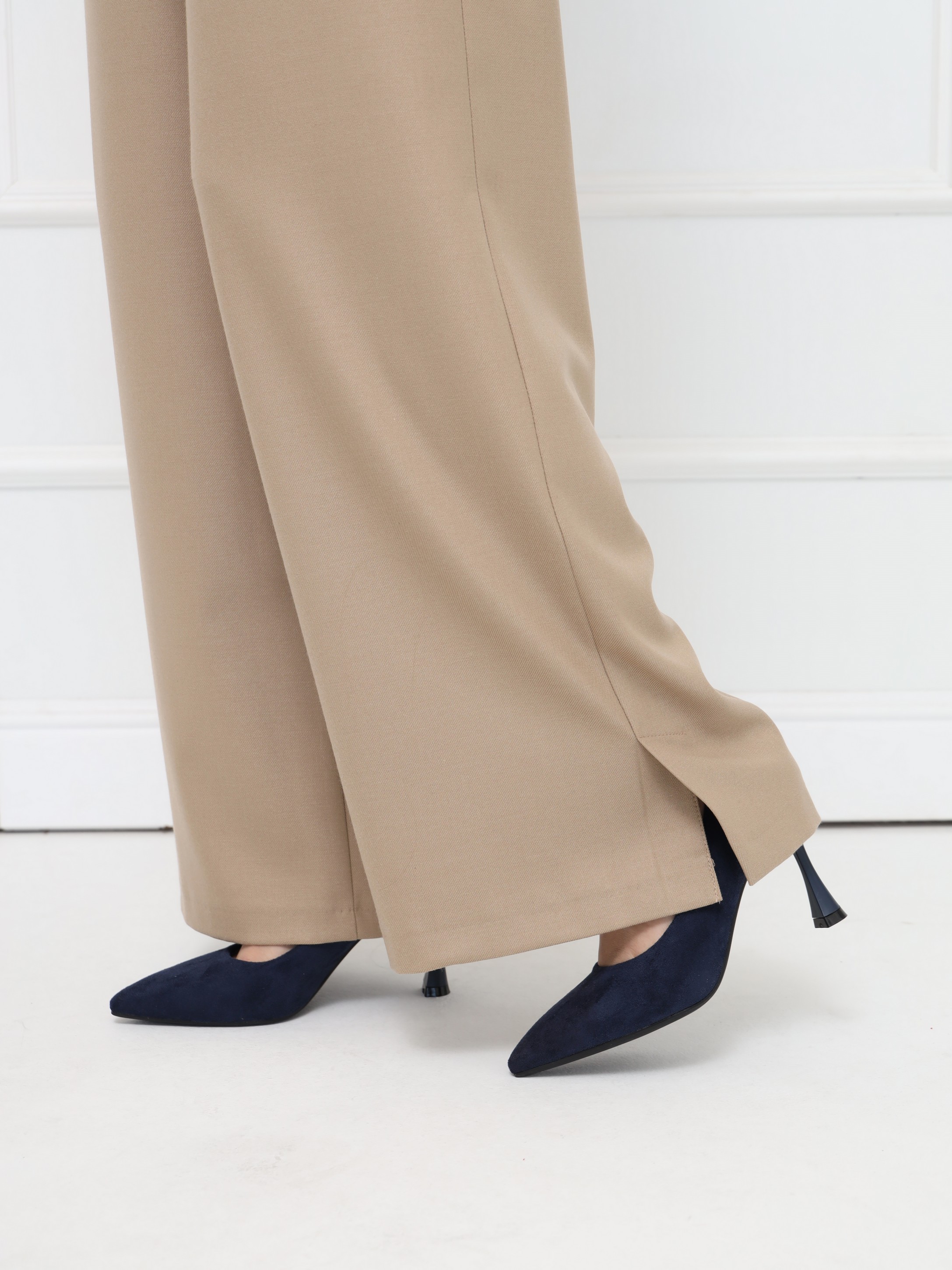 Брюки прямого кроя в актуальном песочном оттенке — must-have для современного гардероба. Плотная костюмная ткань держит форму и выглядит безупречно в течение всего дня. Боковые карманы делают модель практичной, а широкий пояс с резинкой обеспечивает комфортную посадку без лишних застёжек. Аккуратные шлицы по бокам придают образу лёгкость и динамику, создавая идеальную пару к блузам и джемперам.