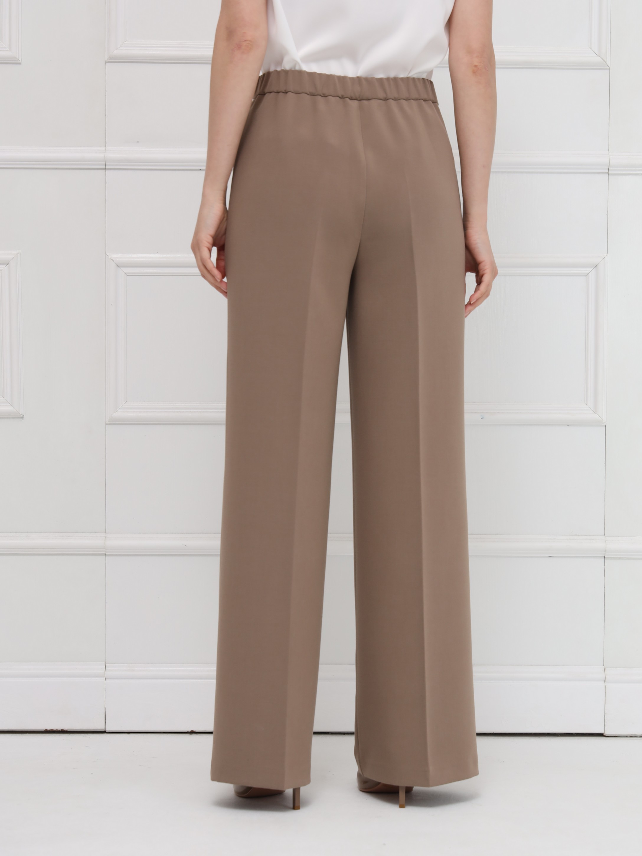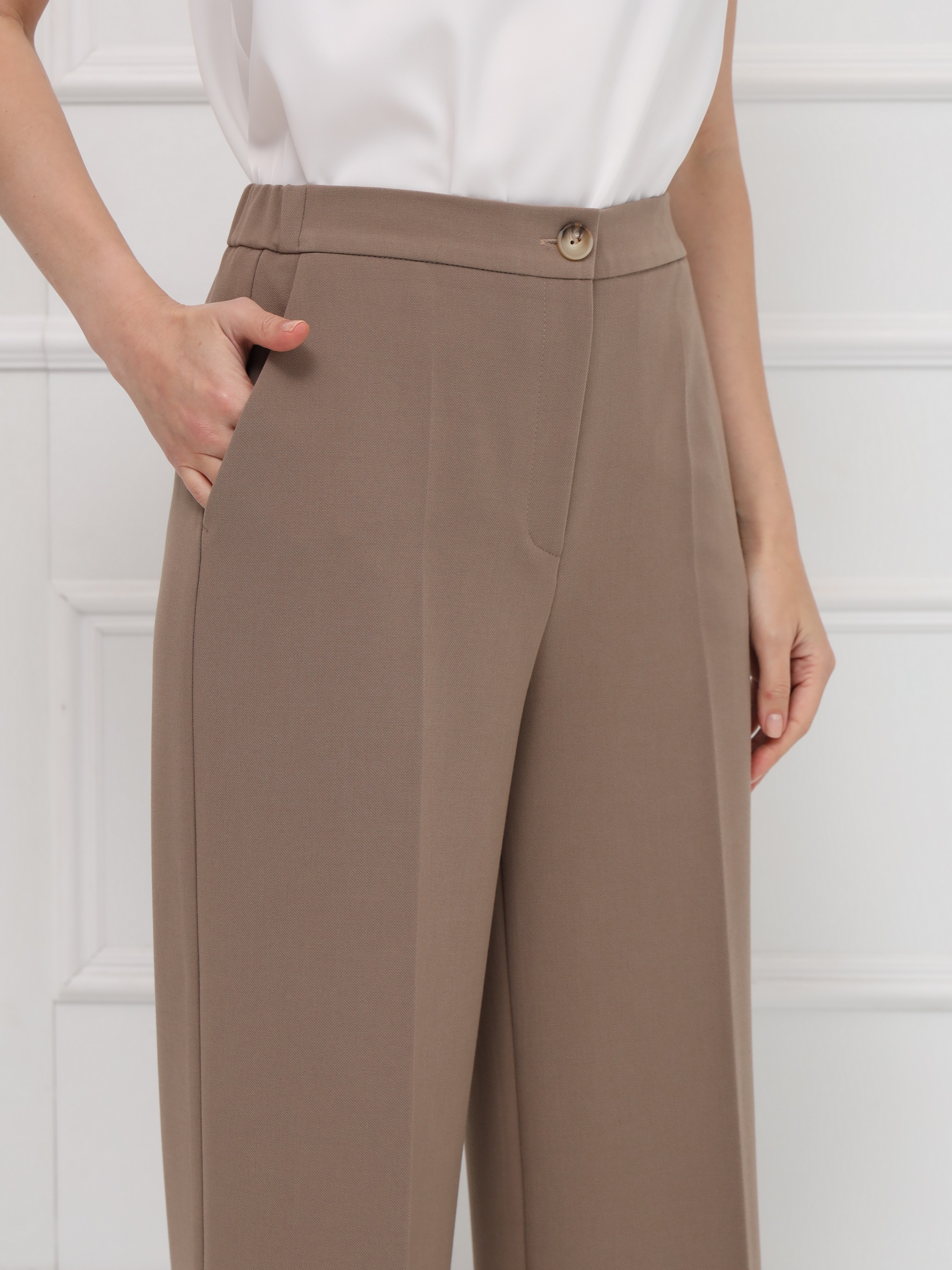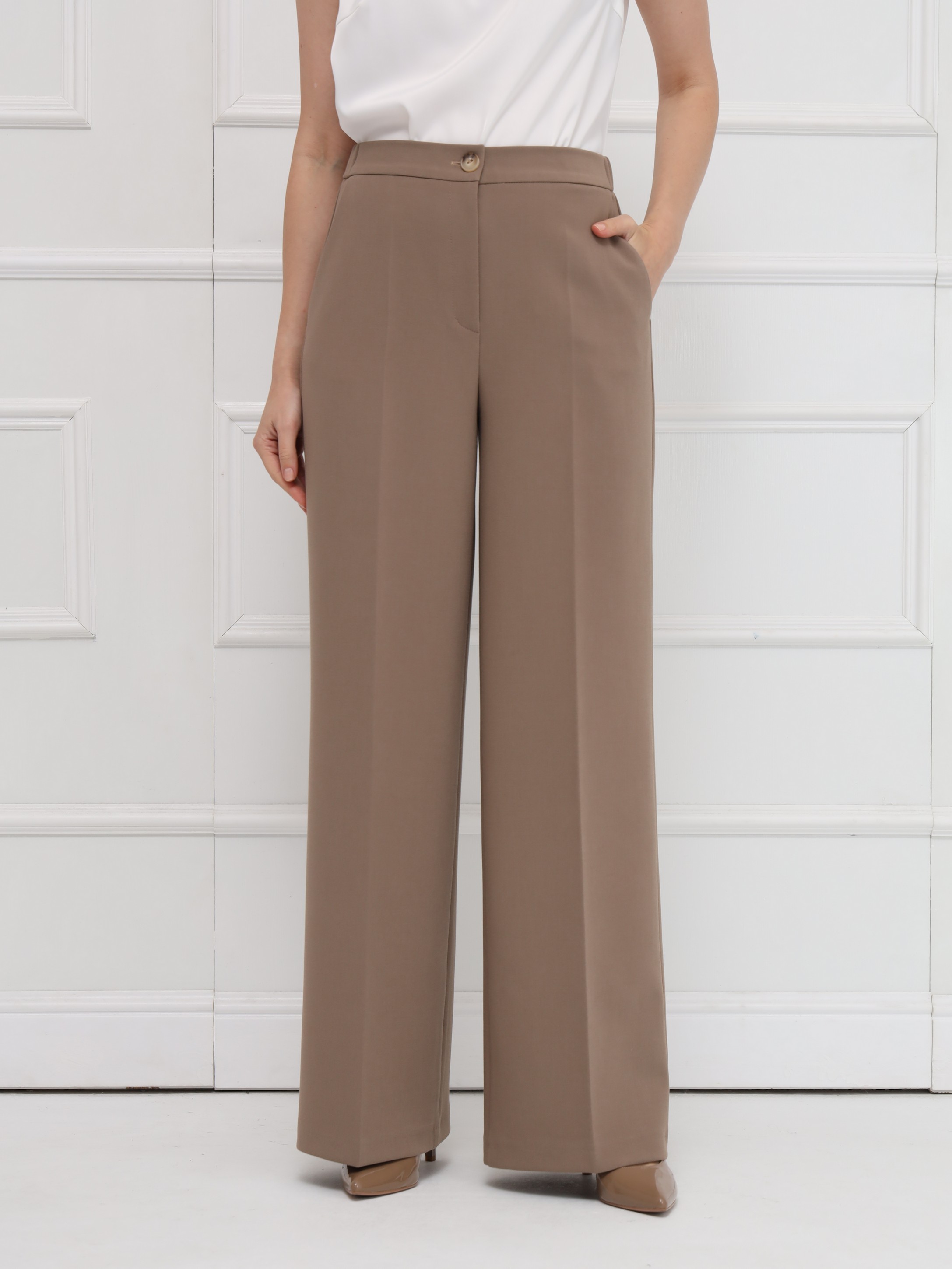 Брюки выполнены из мягкой костюмной ткани с эластаном, которая хорошо драпируется. Высокая посадка подчёркивает талию, а широкие от бедра штанины создают ровный, структурный силуэт. Боковые карманы добавляют практичности, а аккуратный гульфик поддерживает классическую конструкцию модели. В задней части пояса расположена резинка, обеспечивающая комфортную посадку без изменения внешнего вида. Эти брюки выглядят строго и лаконично,