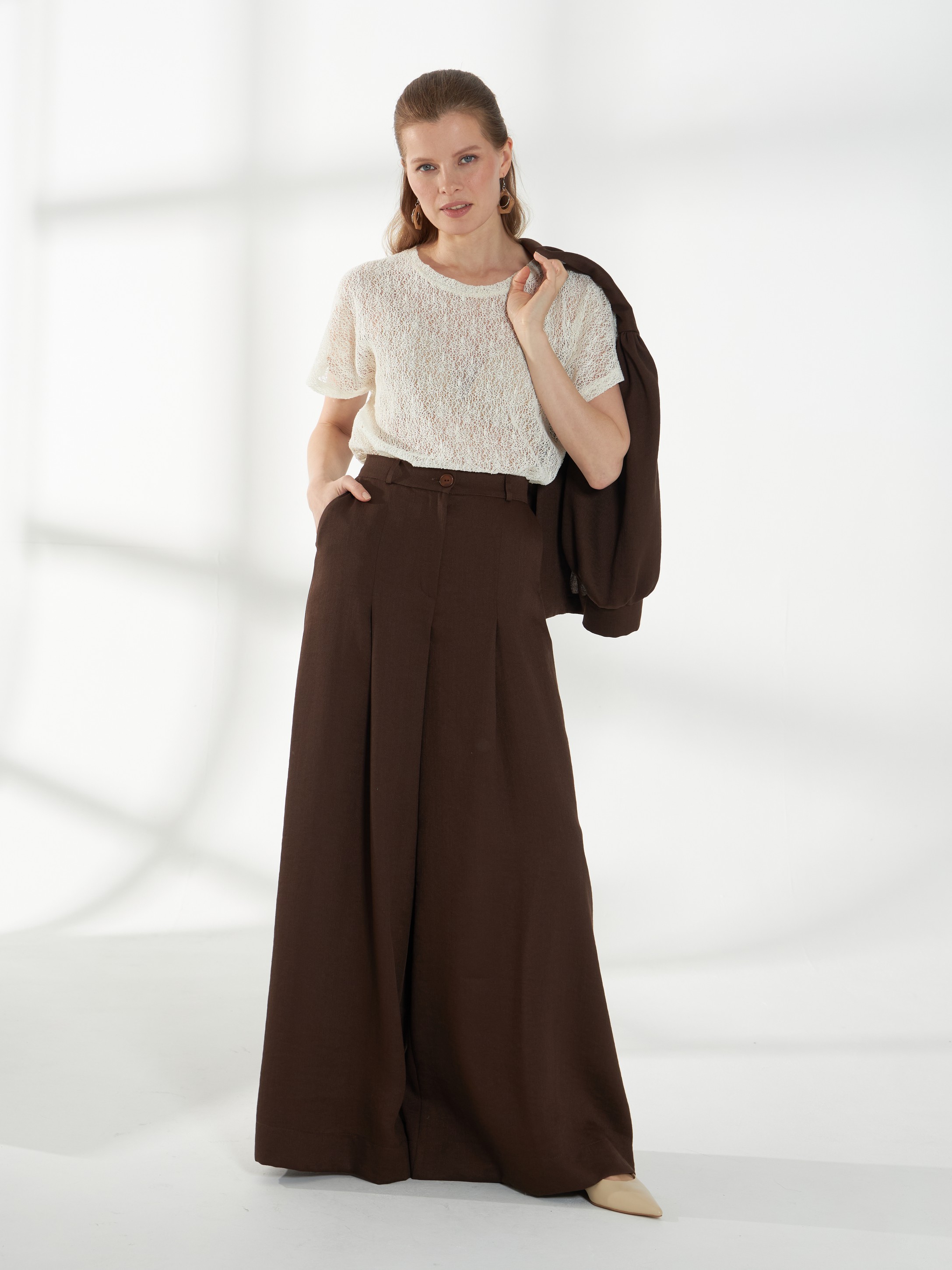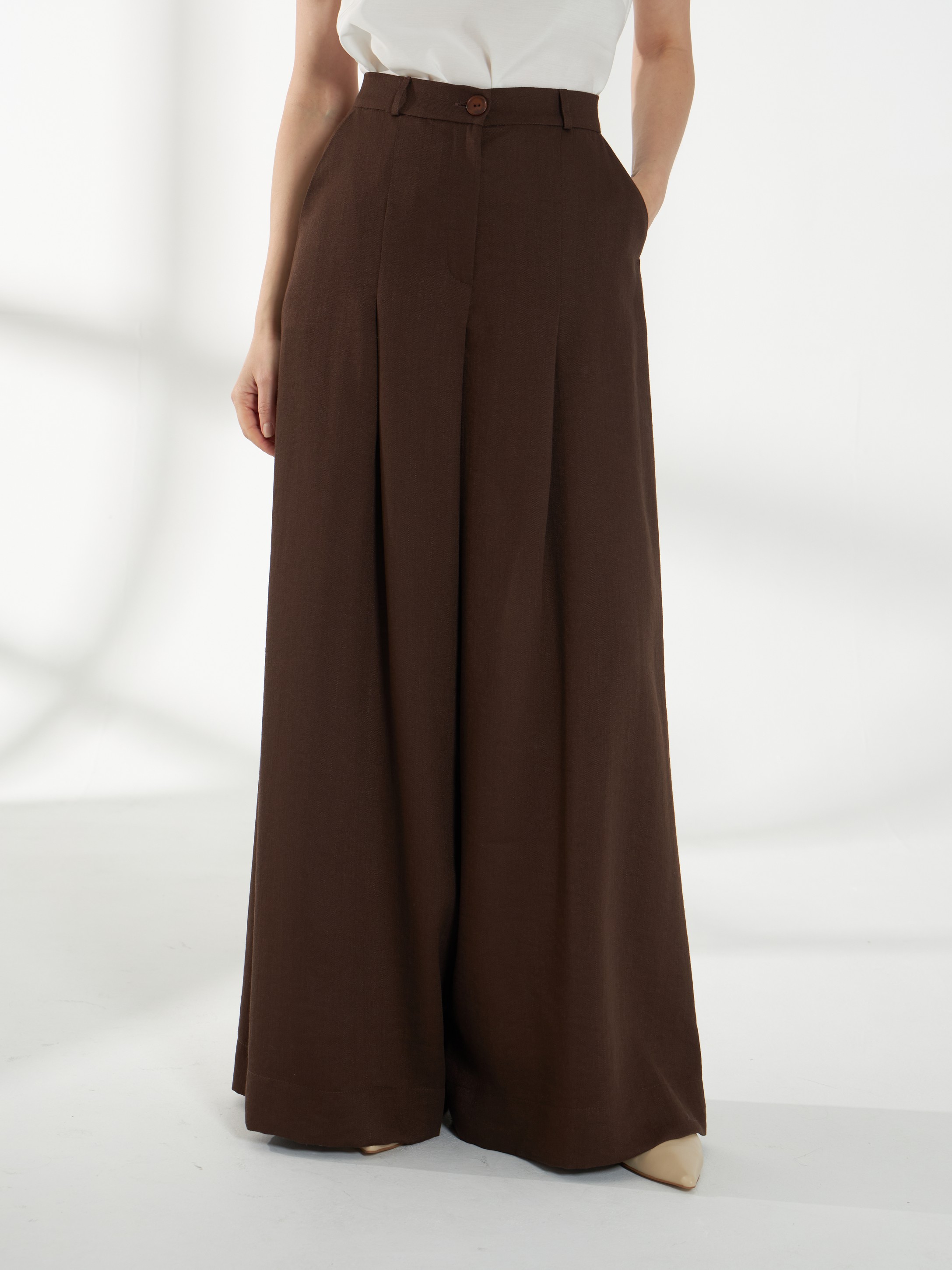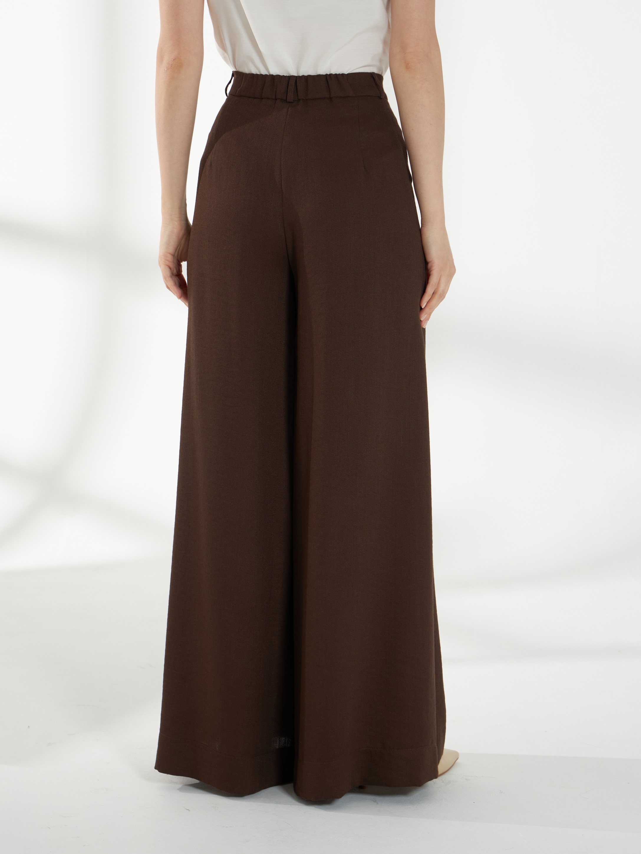 Брюки из смесового материала со льном, в коричневом оттенке, с высокой посадкой и плавно расширяющимся книзу силуэтом, создающим свободный и элегантный образ. Спереди — глубокие застроченные складки, по бокам — удобные карманы. Застежка — гульфик, сзади в поясе встроена резинка для комфортной посадки.