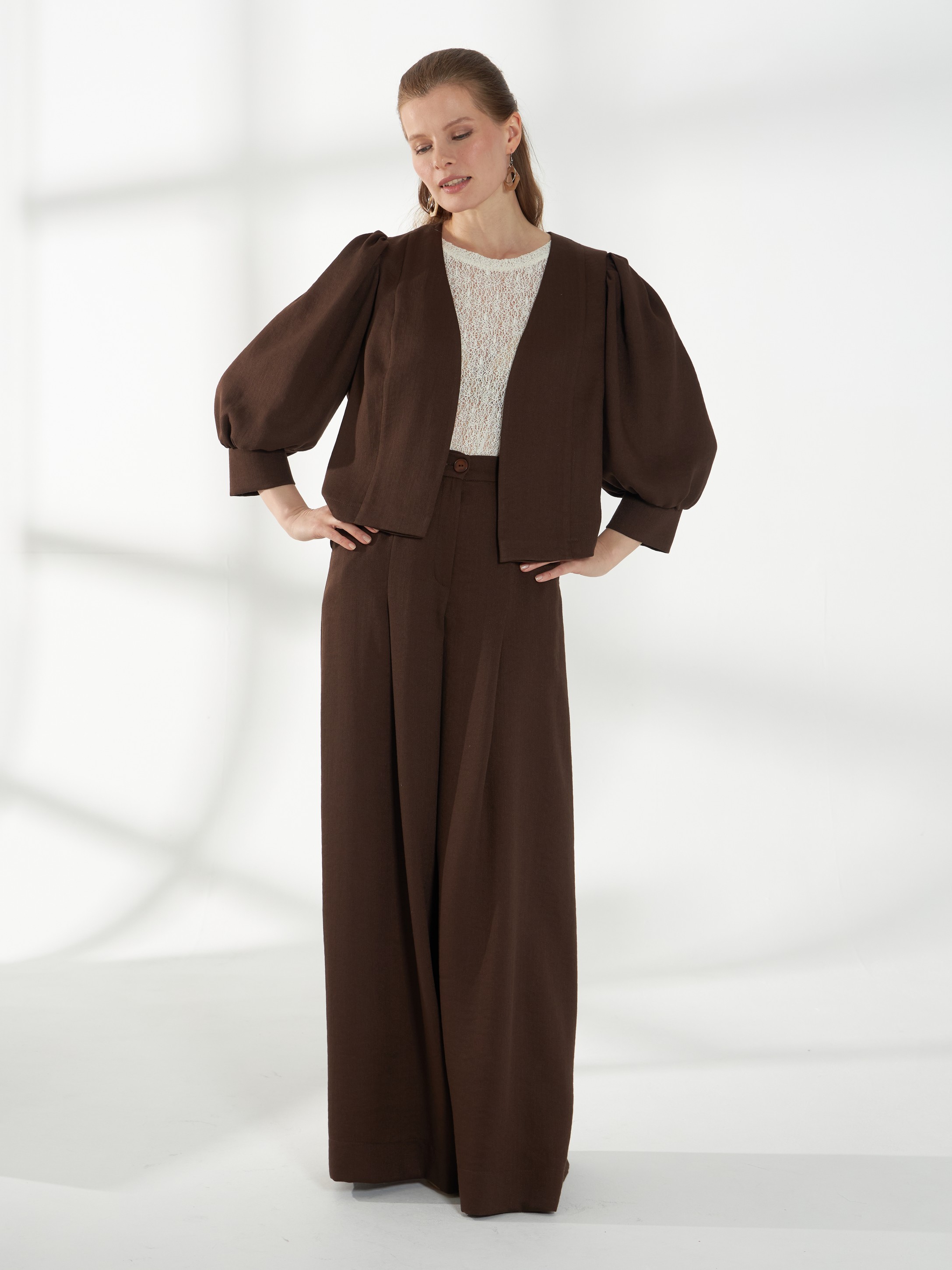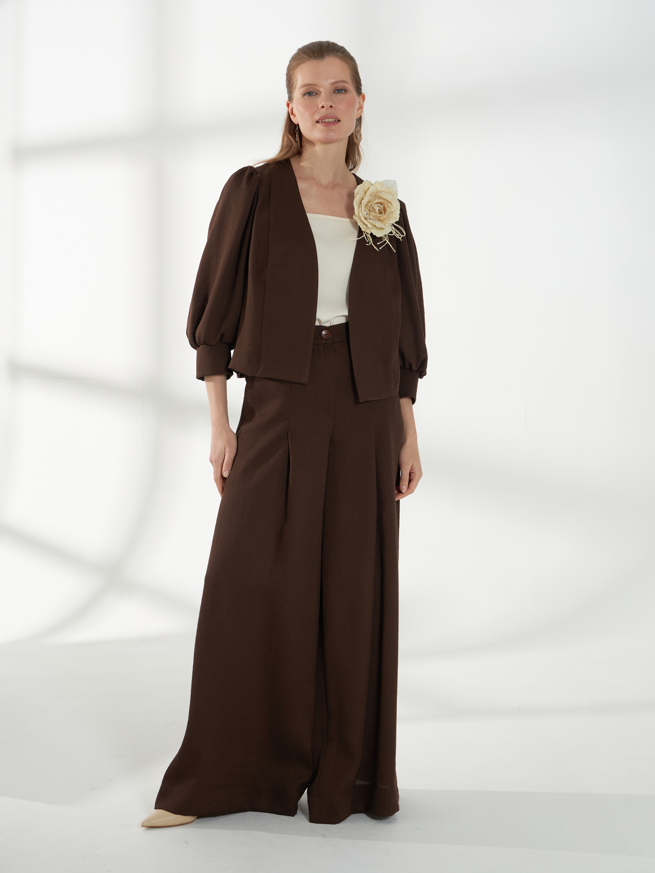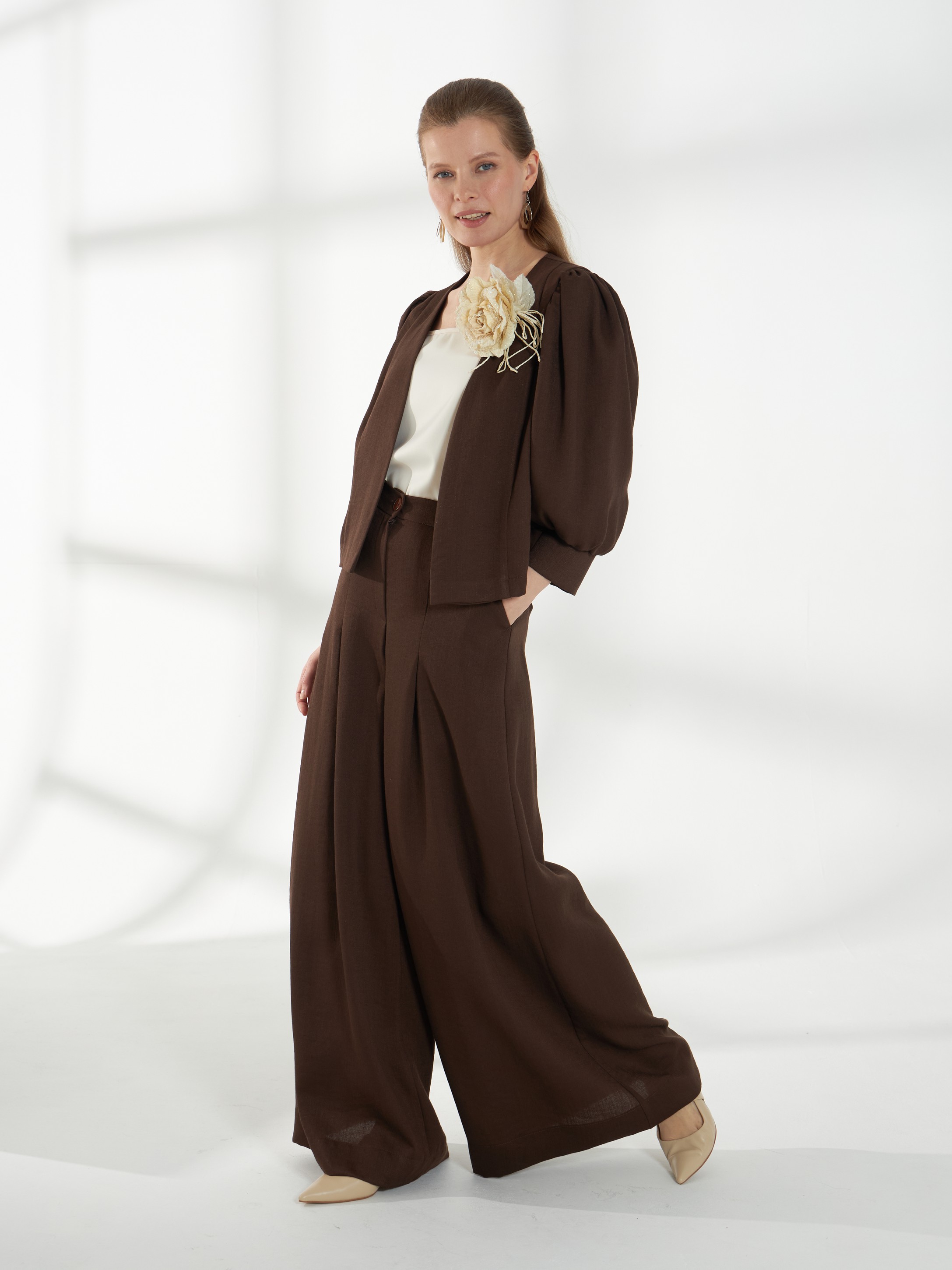 Брюки из смесового материала со льном, в коричневом оттенке, с высокой посадкой и плавно расширяющимся книзу силуэтом, создающим свободный и элегантный образ. Спереди — глубокие застроченные складки, по бокам — удобные карманы. Застежка — гульфик, сзади в поясе встроена резинка для комфортной посадки.