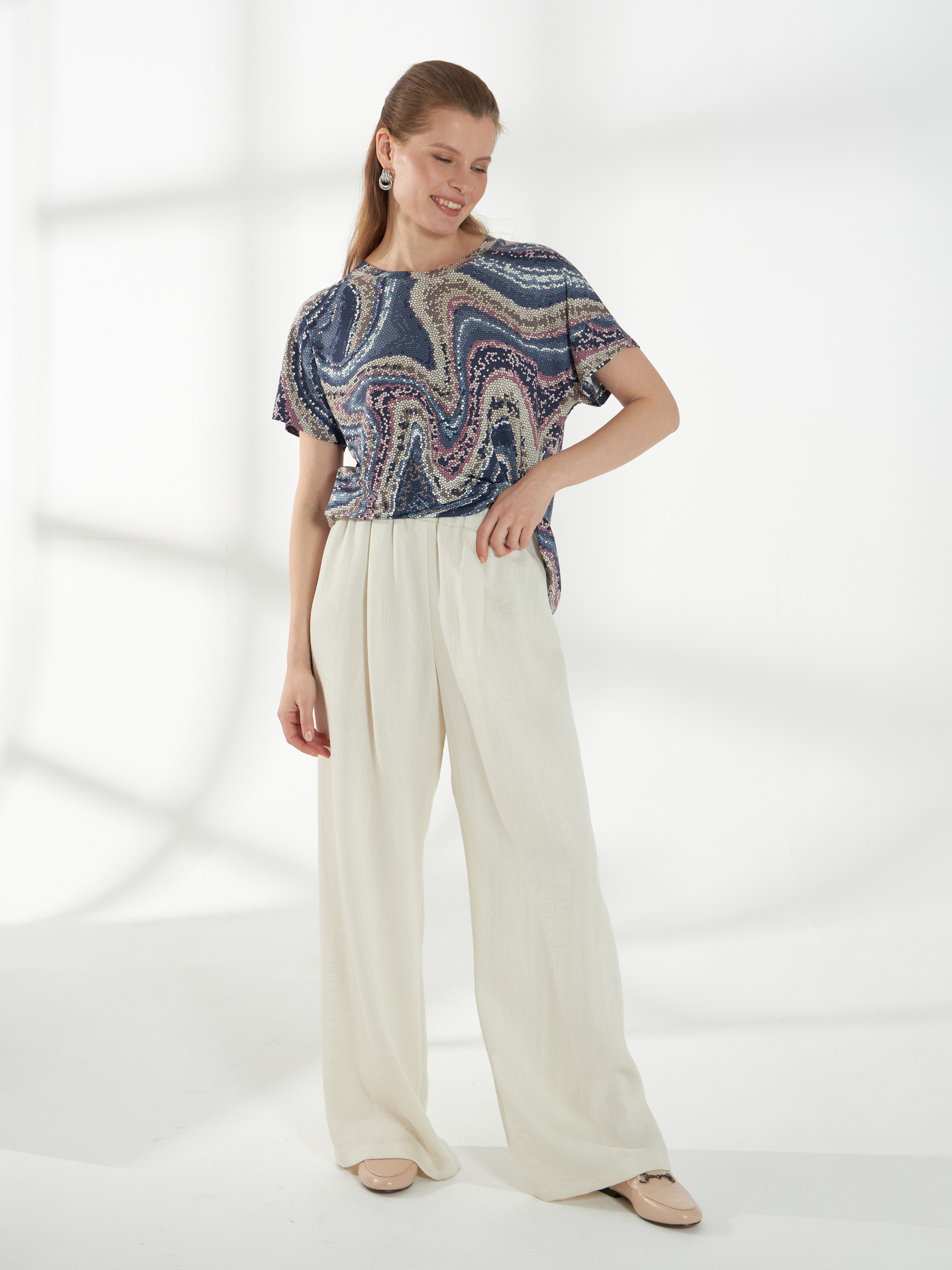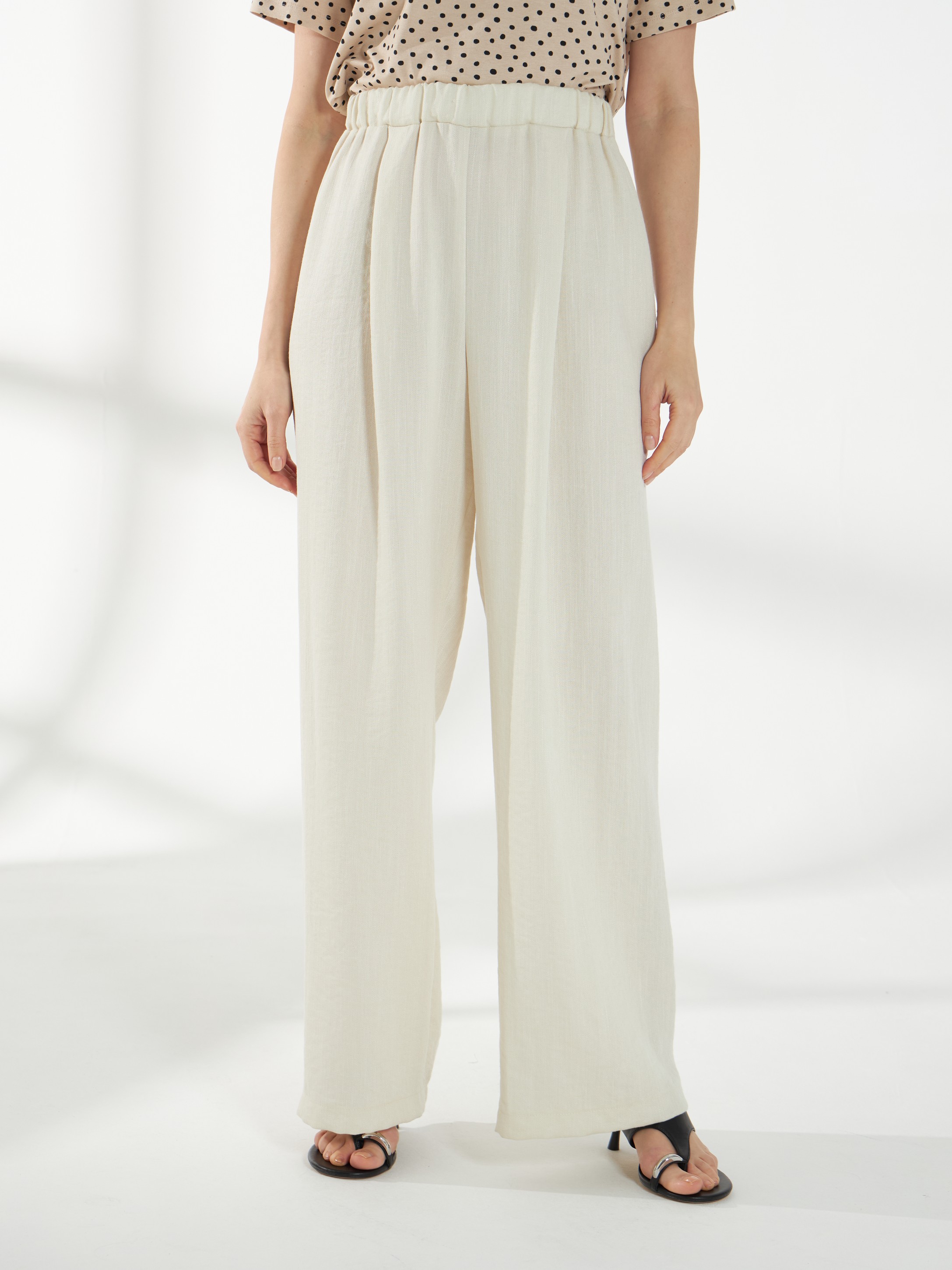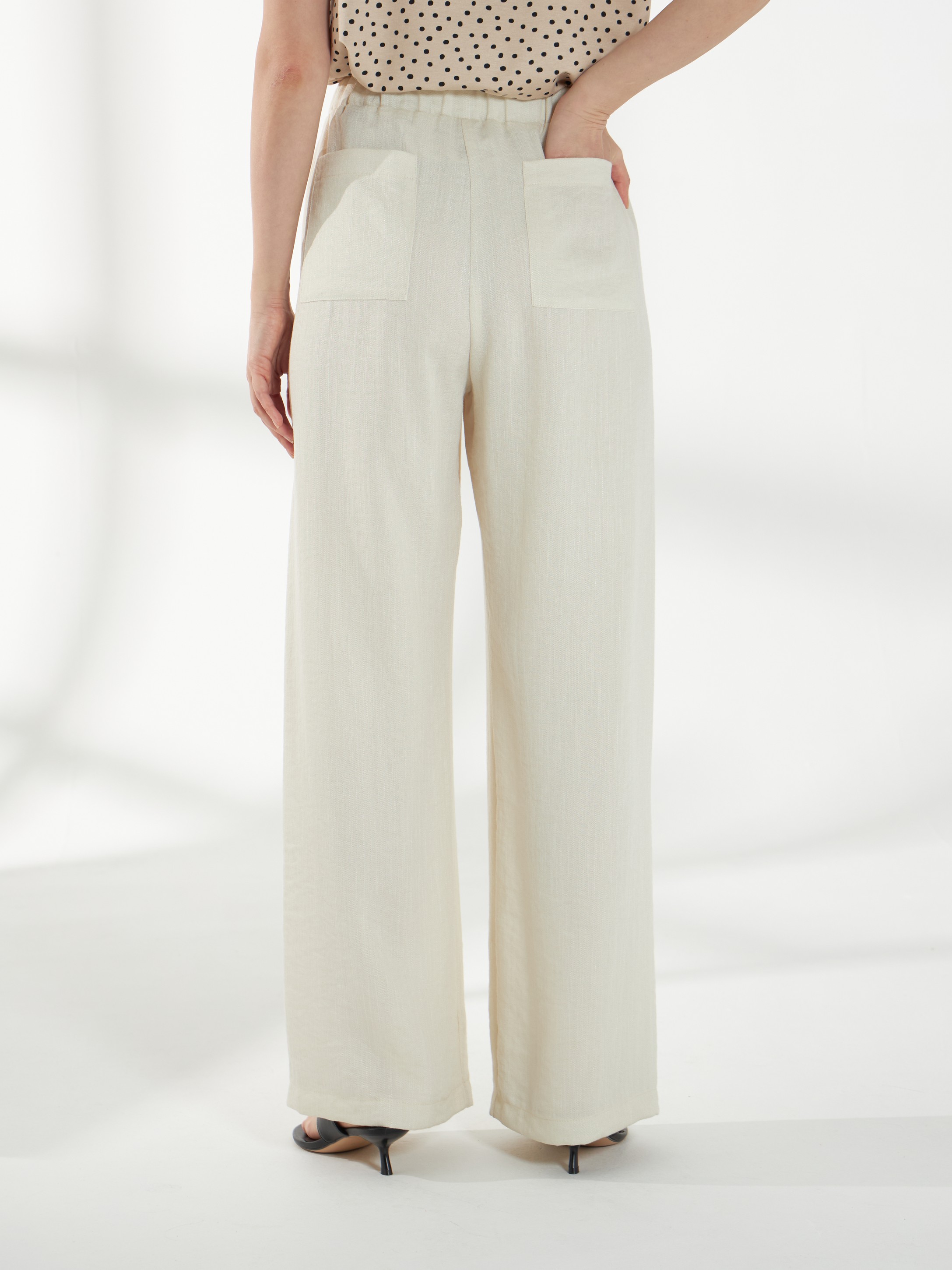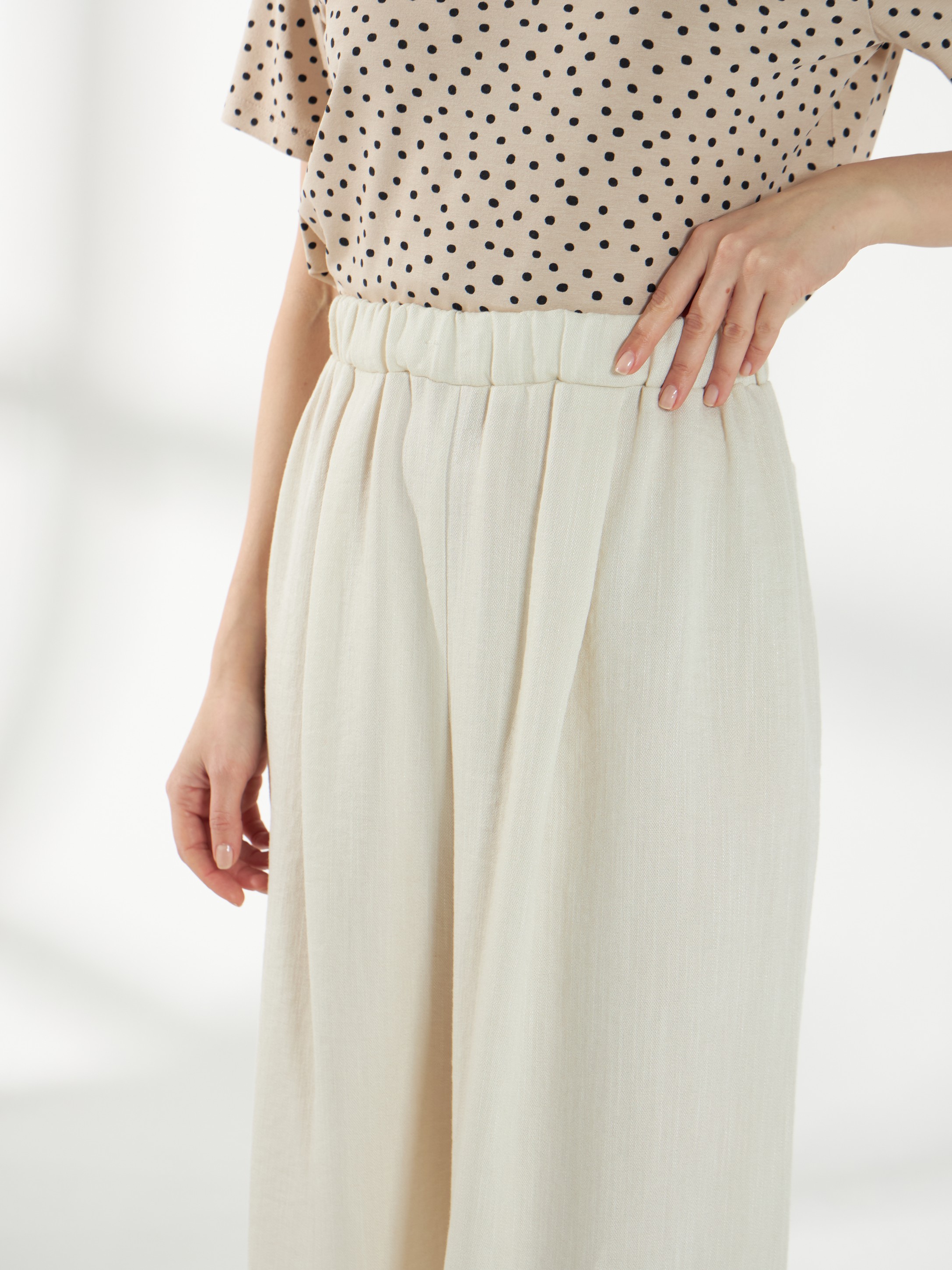 Широкие брюки, из смесовой ткани со льном в молочном оттенке, без бокового шва, с аккуратными складками спереди, создающими мягкий расслабленный силуэт. Широкий пояс с резинкой внутри обеспечивает комфортную посадку, а накладные карманы сзади добавляют практичности и завершённости модели. Универсальные брюки ко многим летним образам.