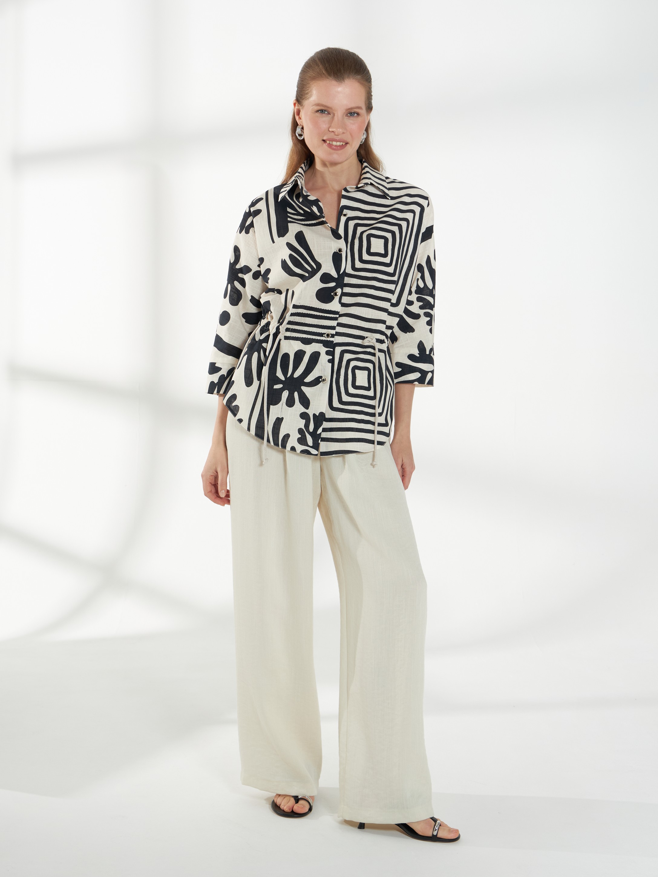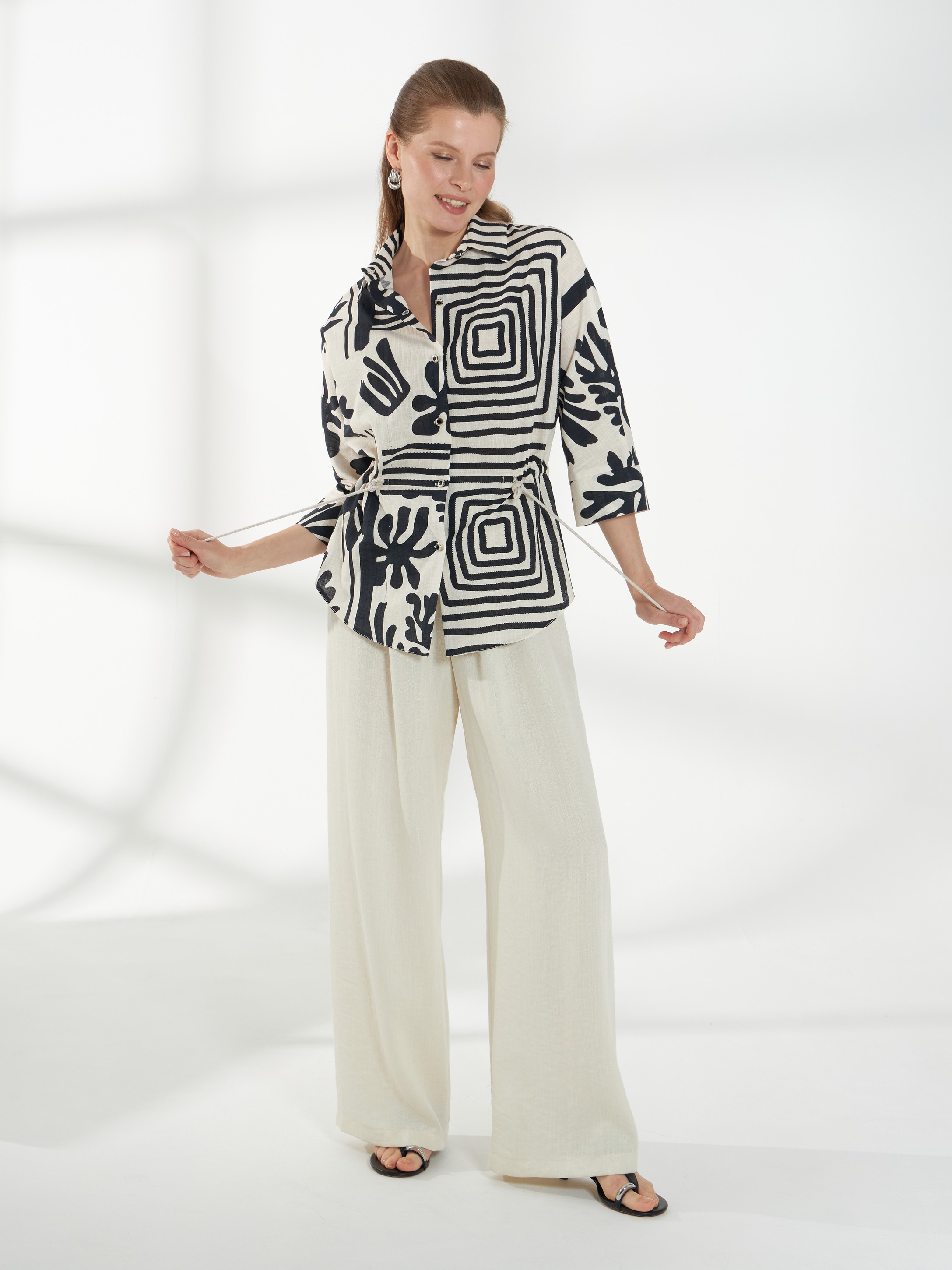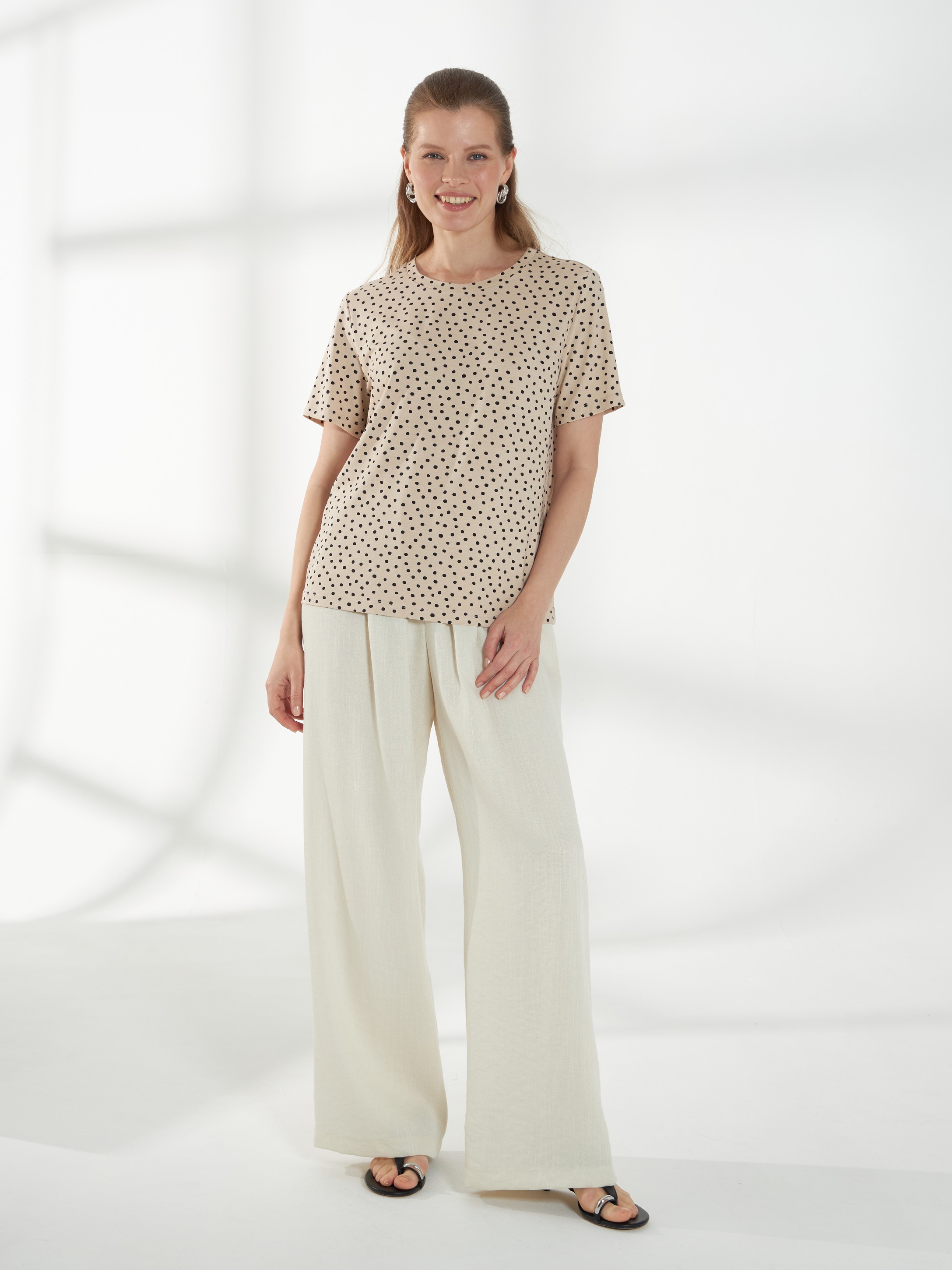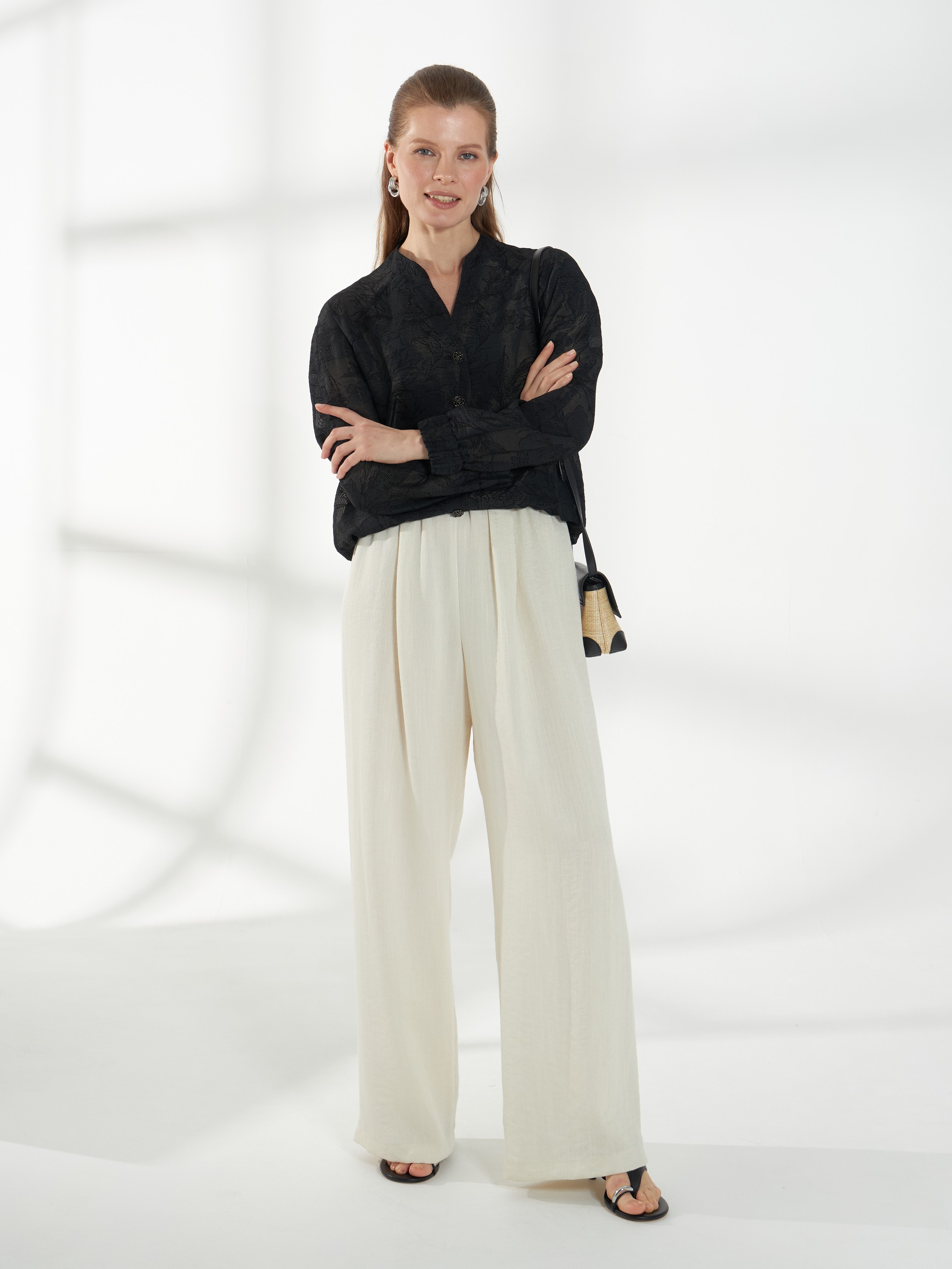 Широкие брюки, из смесовой ткани со льном в молочном оттенке, без бокового шва, с аккуратными складками спереди, создающими мягкий расслабленный силуэт. Широкий пояс с резинкой внутри обеспечивает комфортную посадку, а накладные карманы сзади добавляют практичности и завершённости модели. Универсальные брюки ко многим летним образам.