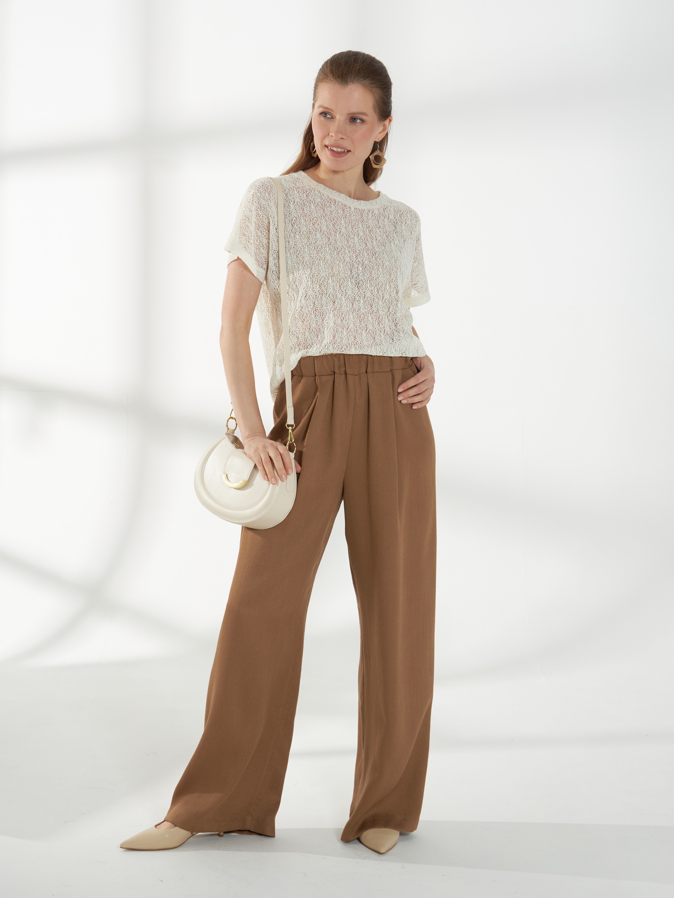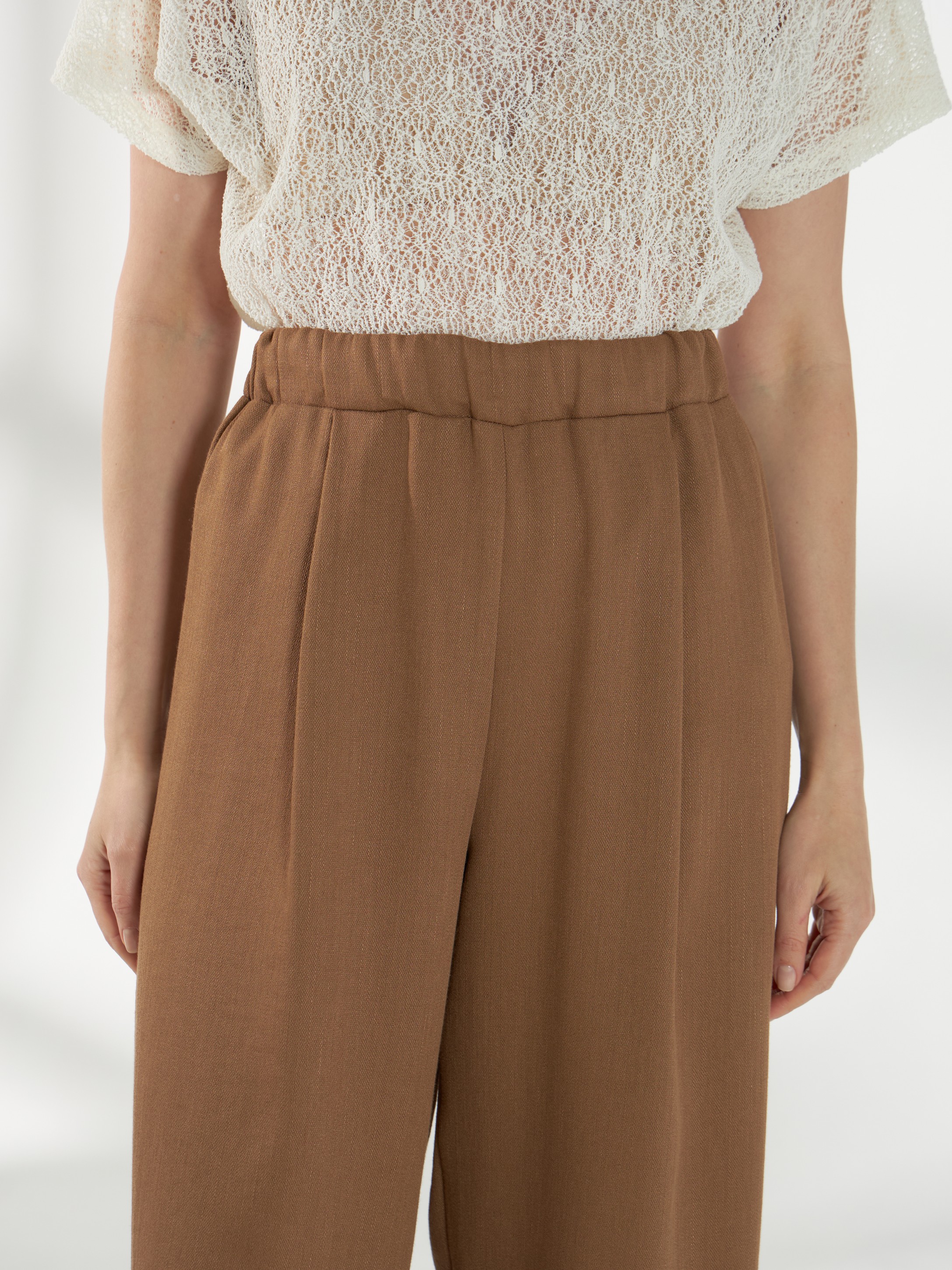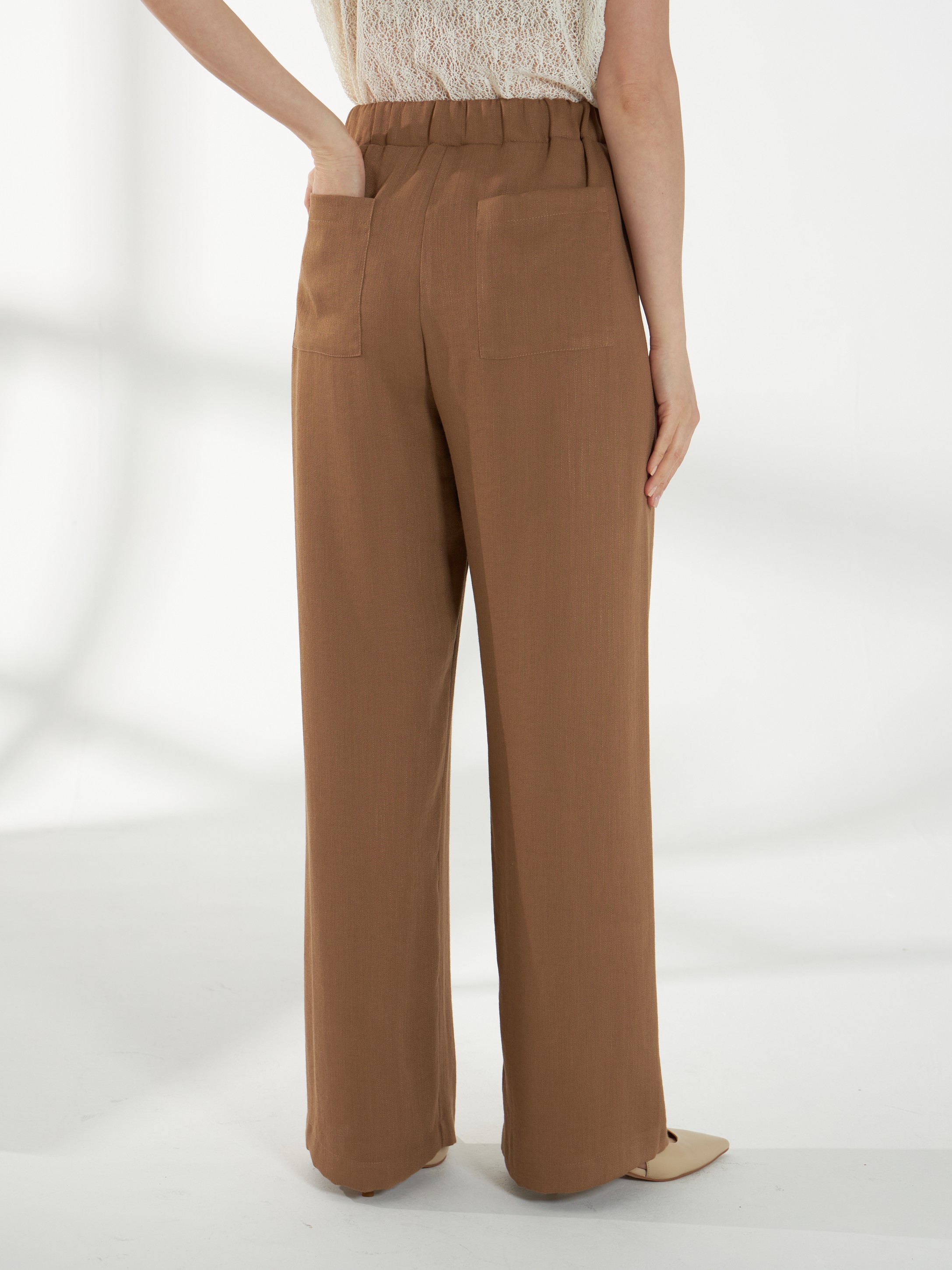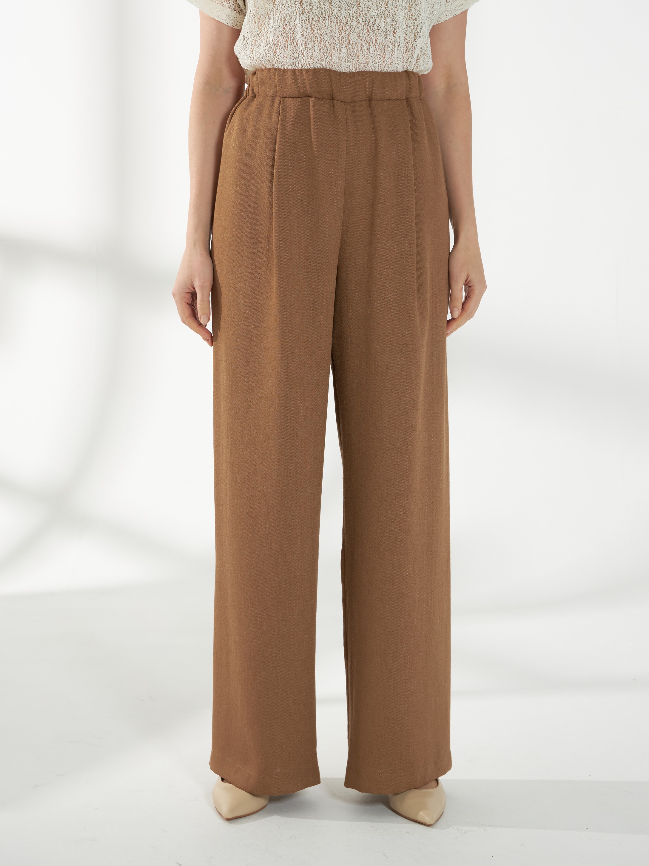 Широкие брюки, из смесовой ткани со льном в песочном оттенке, без бокового шва, с аккуратными складками спереди, создающими мягкий расслабленный силуэт. Широкий пояс с резинкой внутри обеспечивает комфортную посадку, а накладные карманы сзади добавляют практичности и завершённости модели.