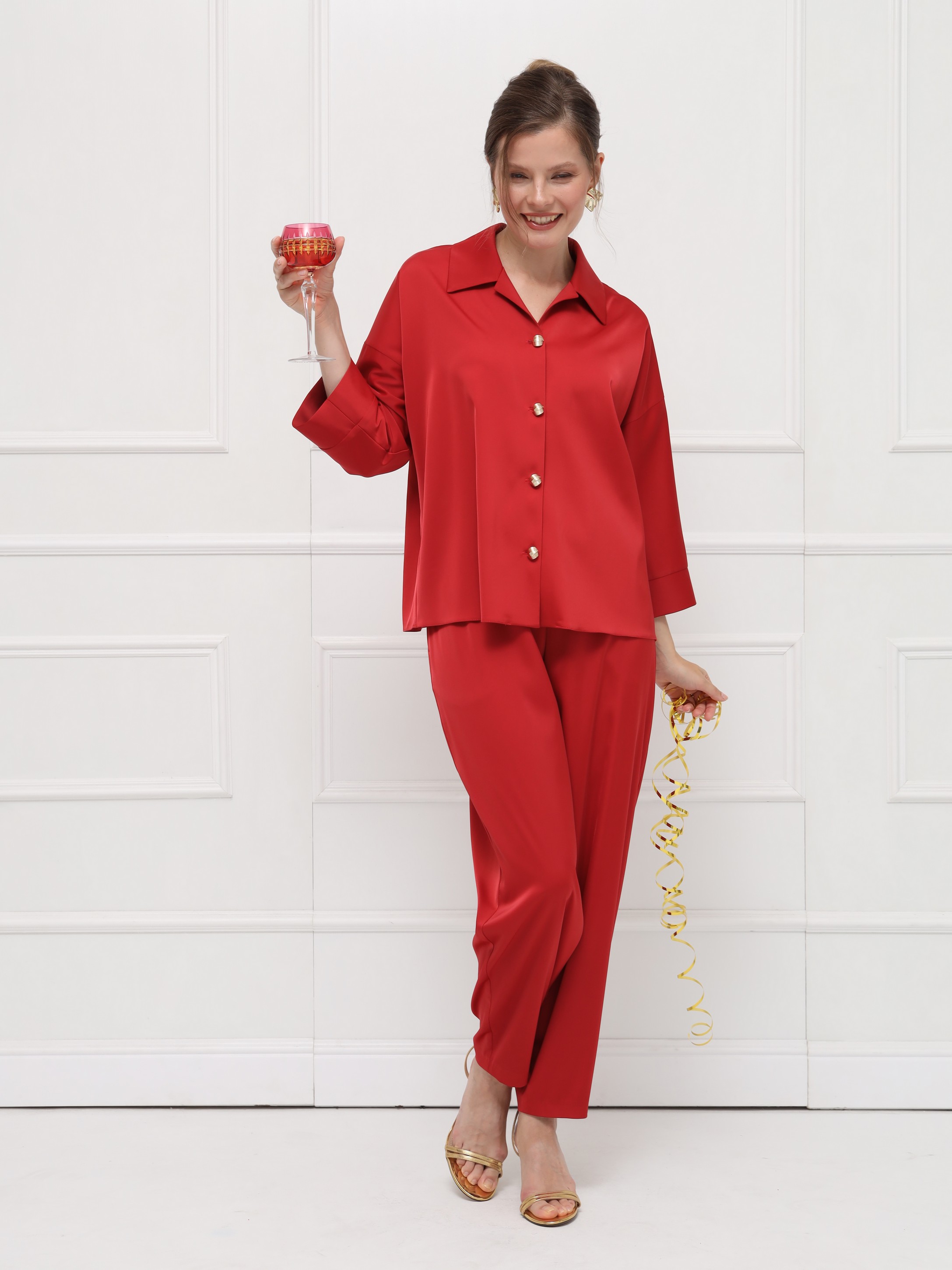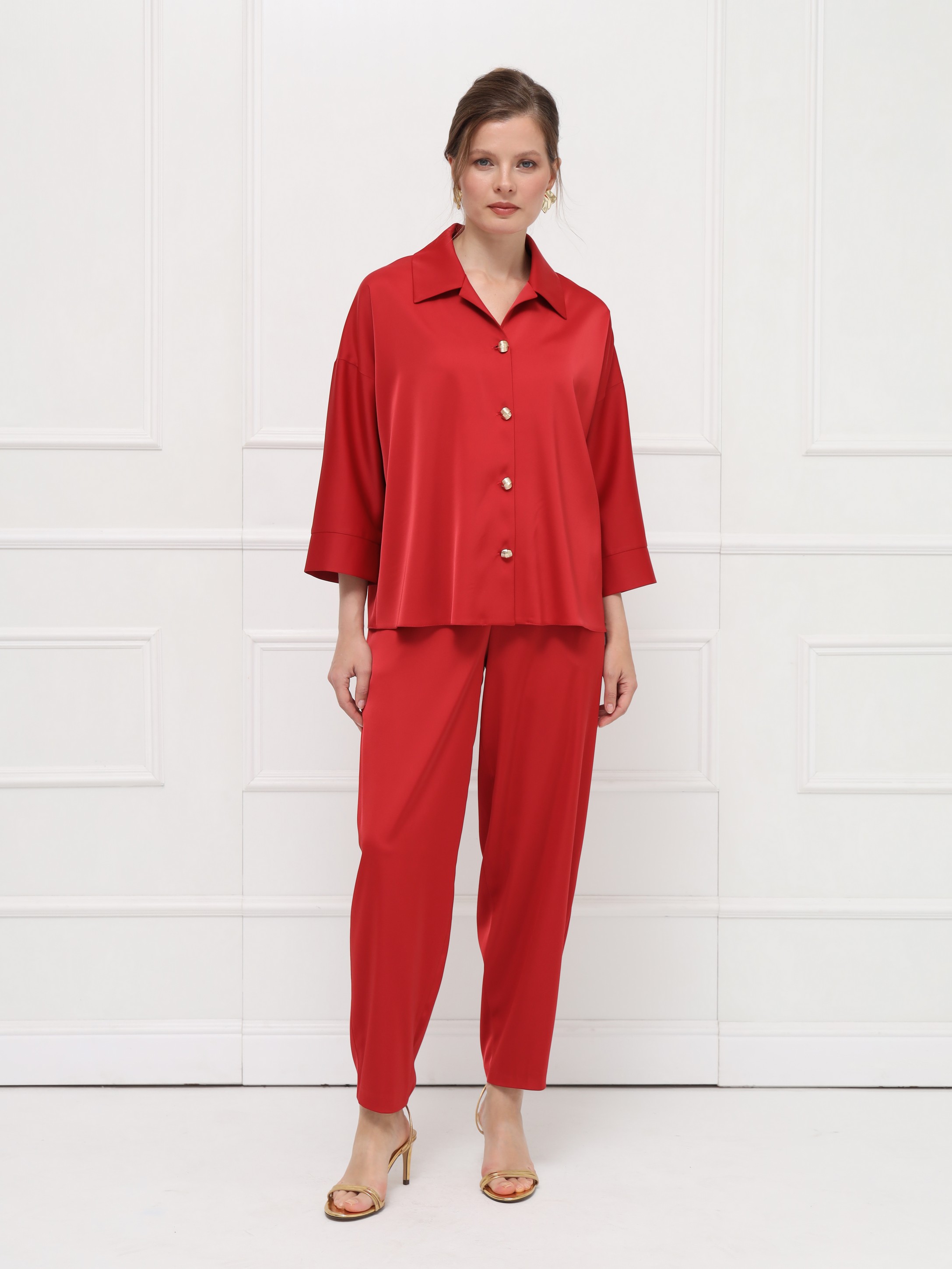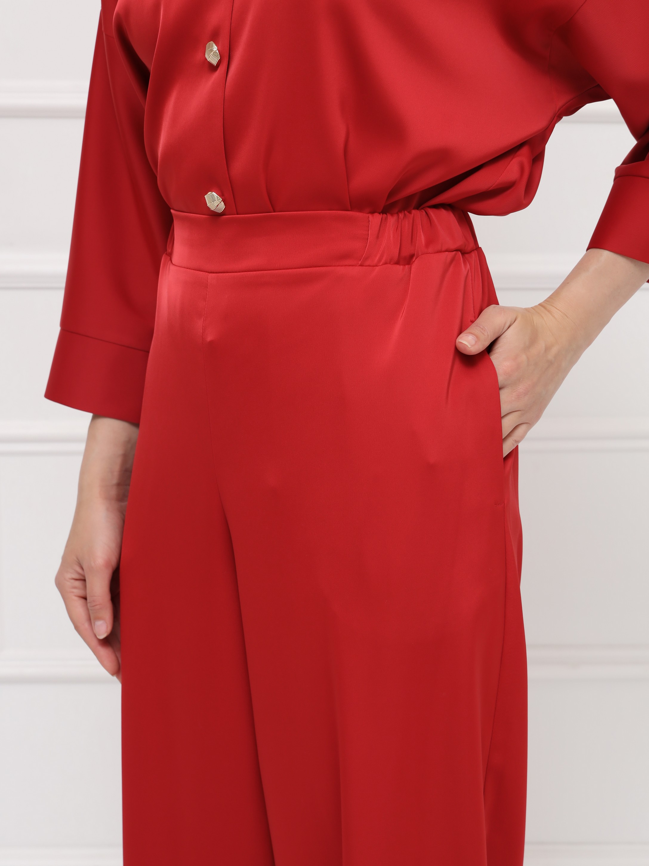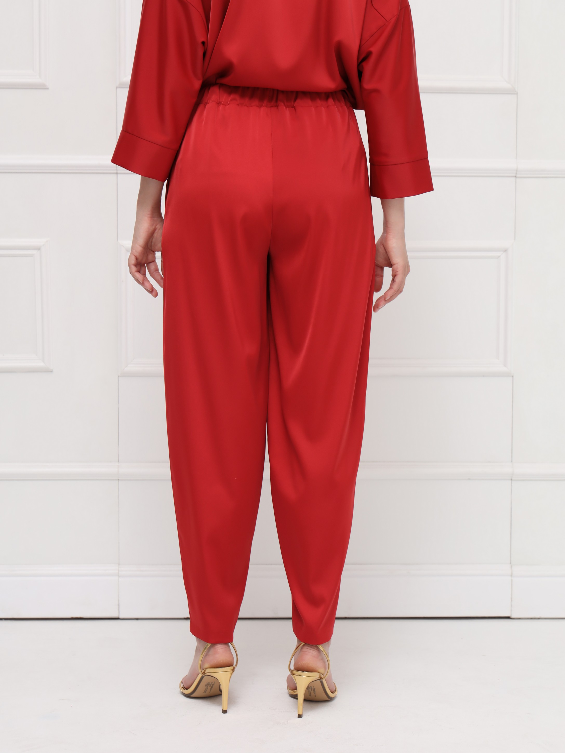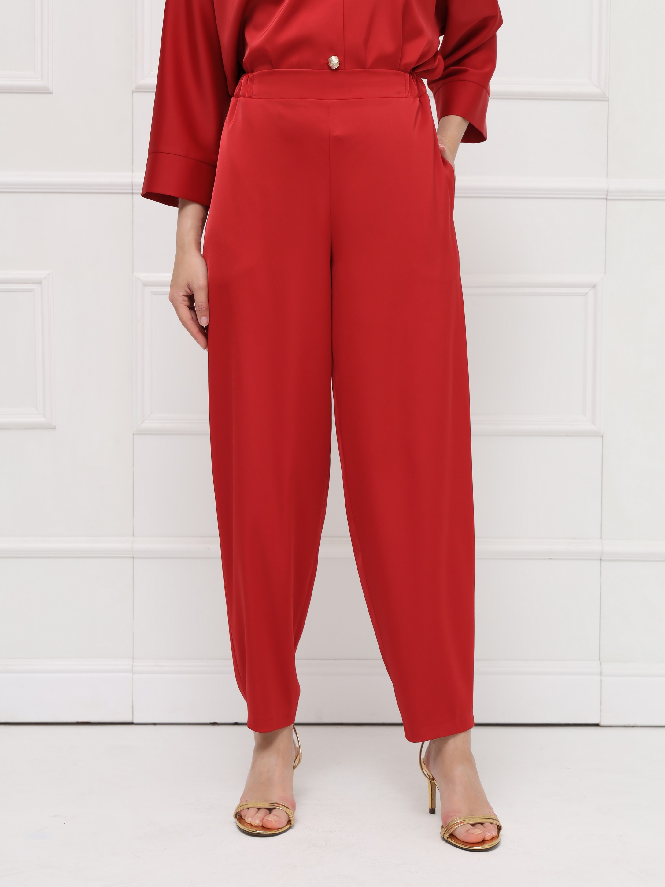 Элегантные брюки - карроты из гладкого атласа в оттенке «ретро красный». Модель с боковыми карманами и широким поясом, с вставленной резинкой по спинке — для комфорта и идеальной посадки. Свободный крой в бедрах и мягкое зауженные к щиколотке создают изысканный силуэт, подходящий как для повседневных, так и для вечерних образов.