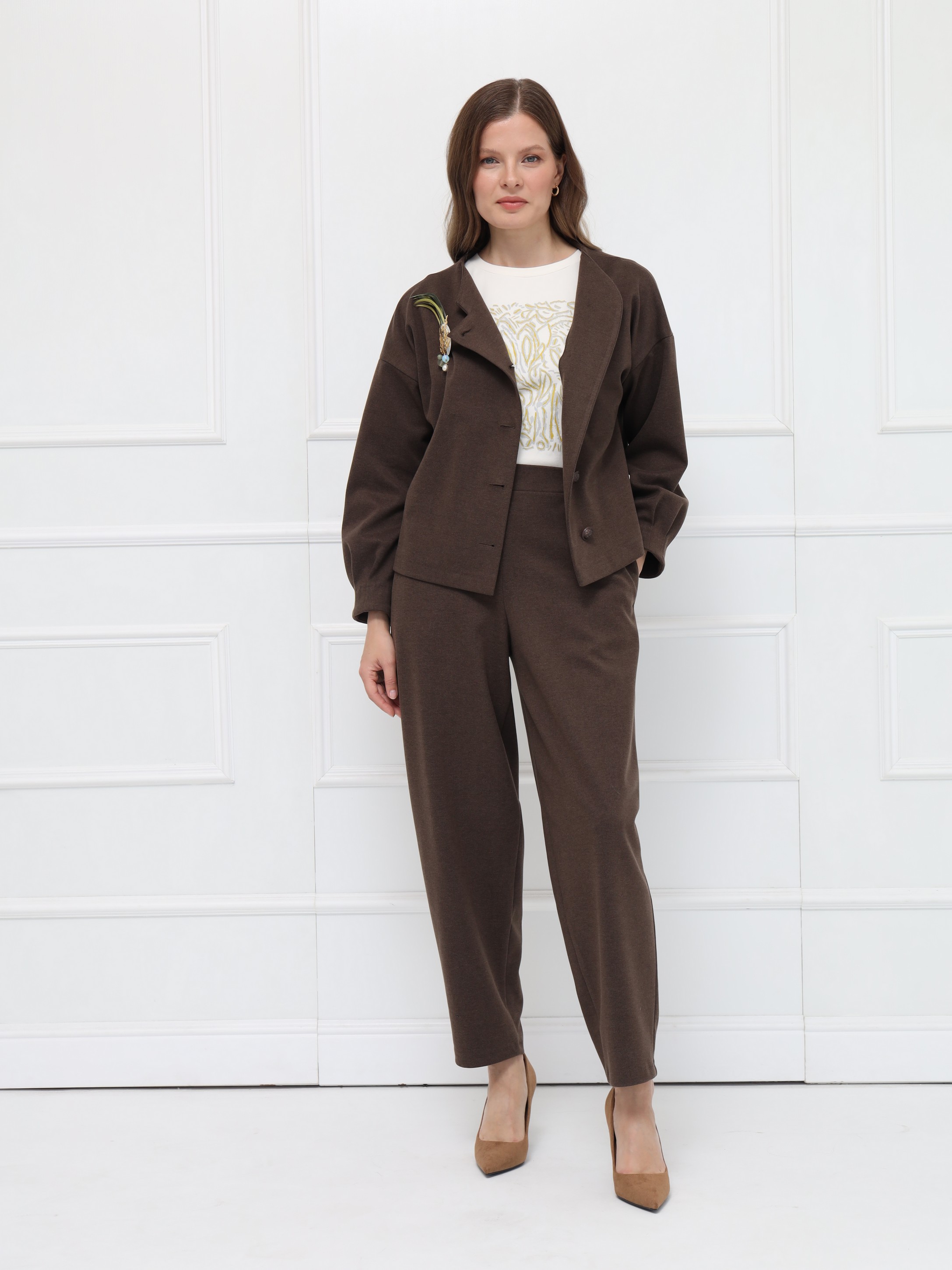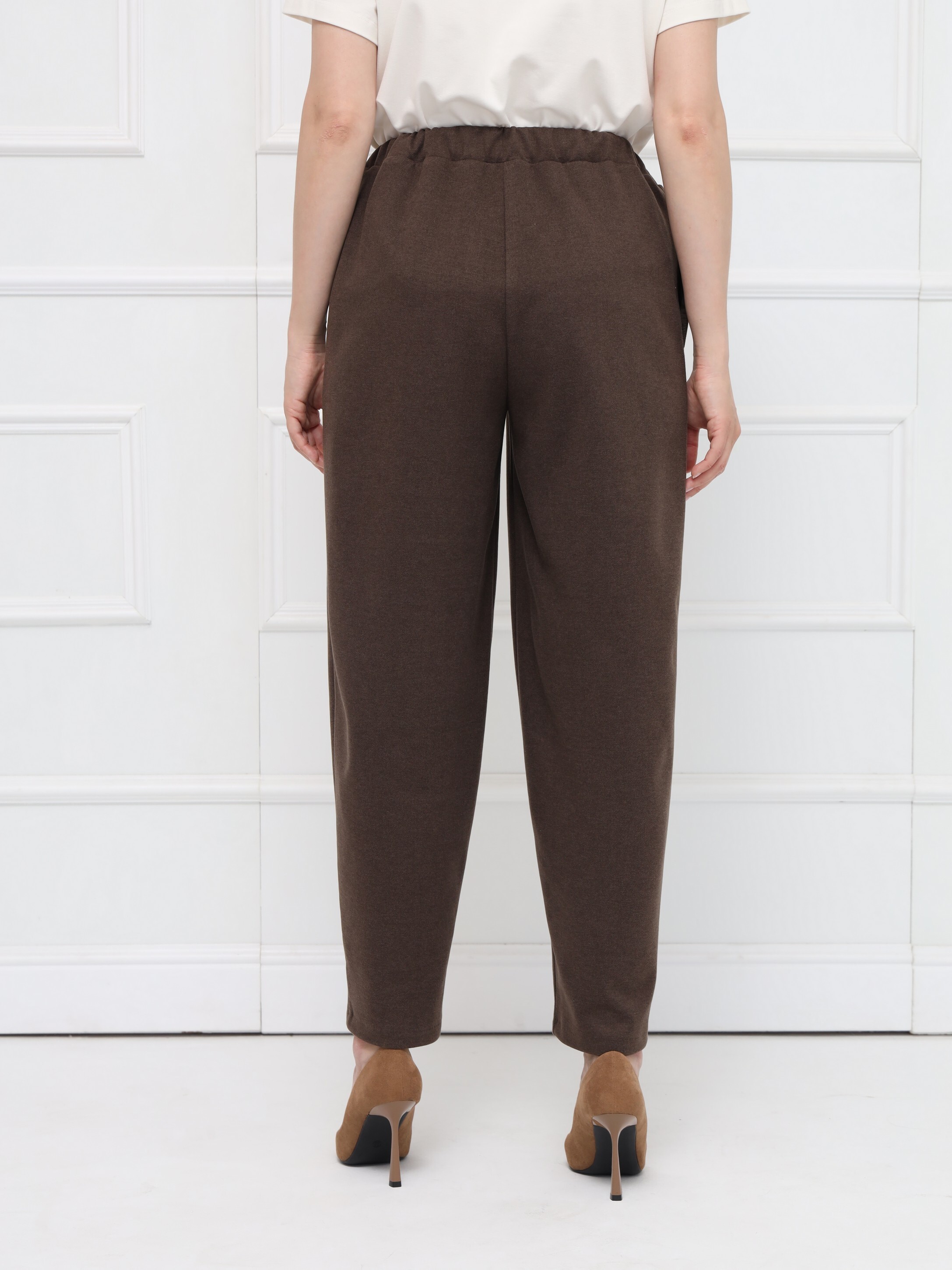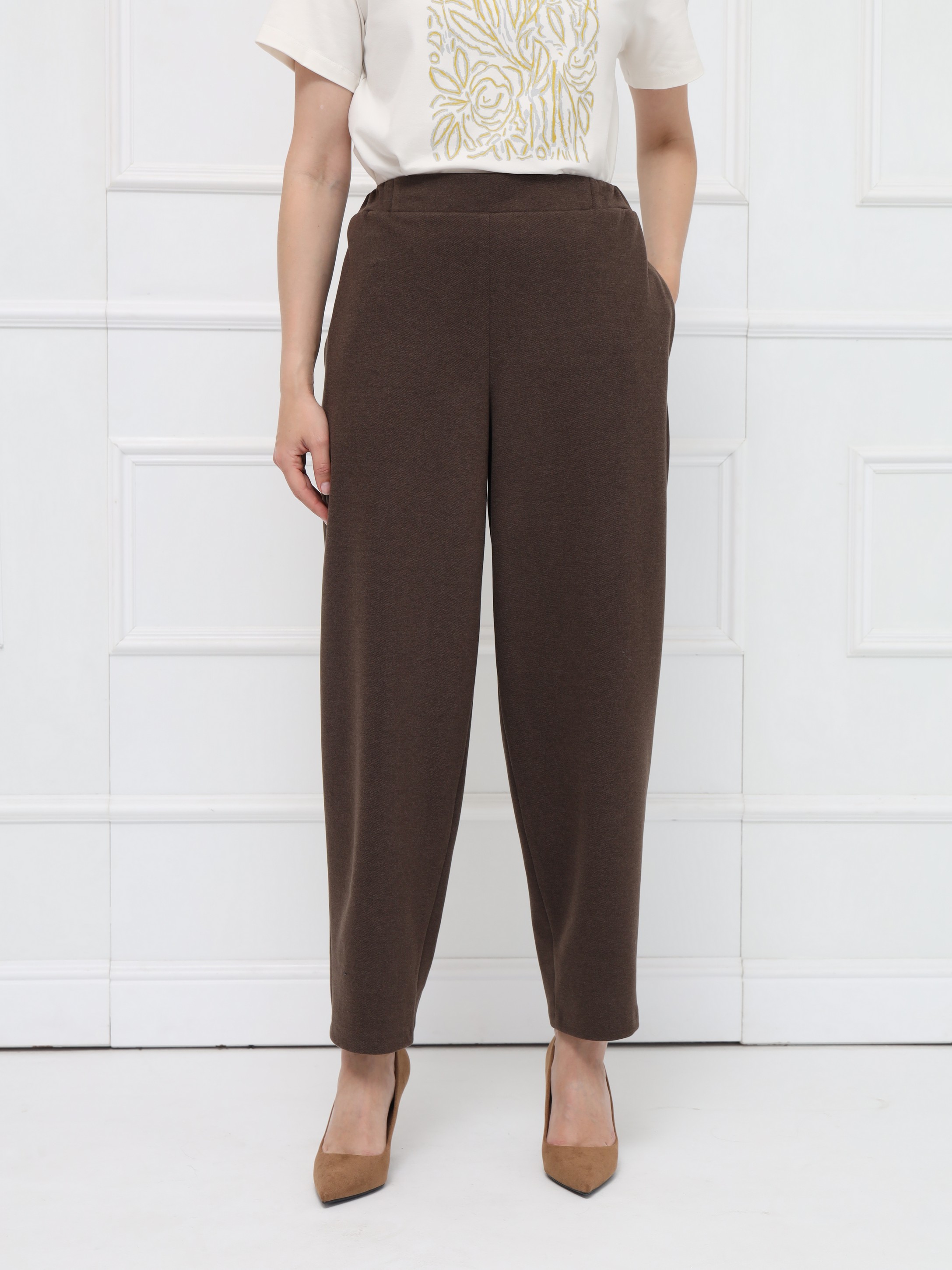 Брюки-карроты из плотного коричневого трикотажа — мягкие, тёплые и немнущиеся. Силуэт с объёмом в верхней части и заужением книзу, визуально вытягивает ноги и подчёркивает талию. Свободная посадка и широкий пояс с эластичной резинкой по спинке обеспечивают комфорт в течение дня. Скрытые карманы в боковых швах — лаконичное и практичное решение.