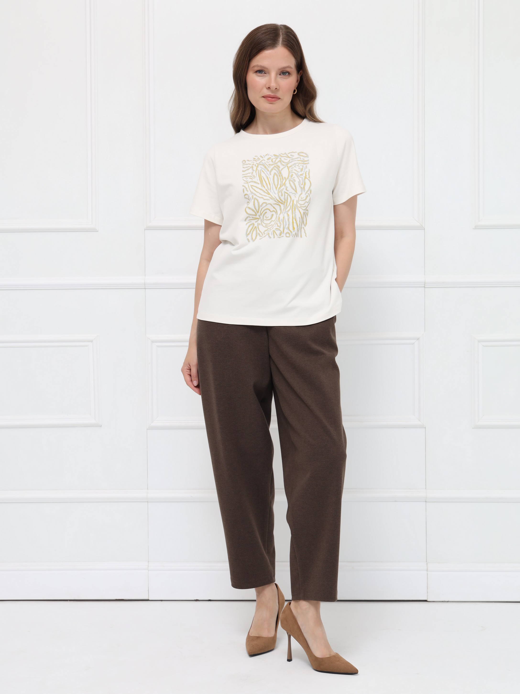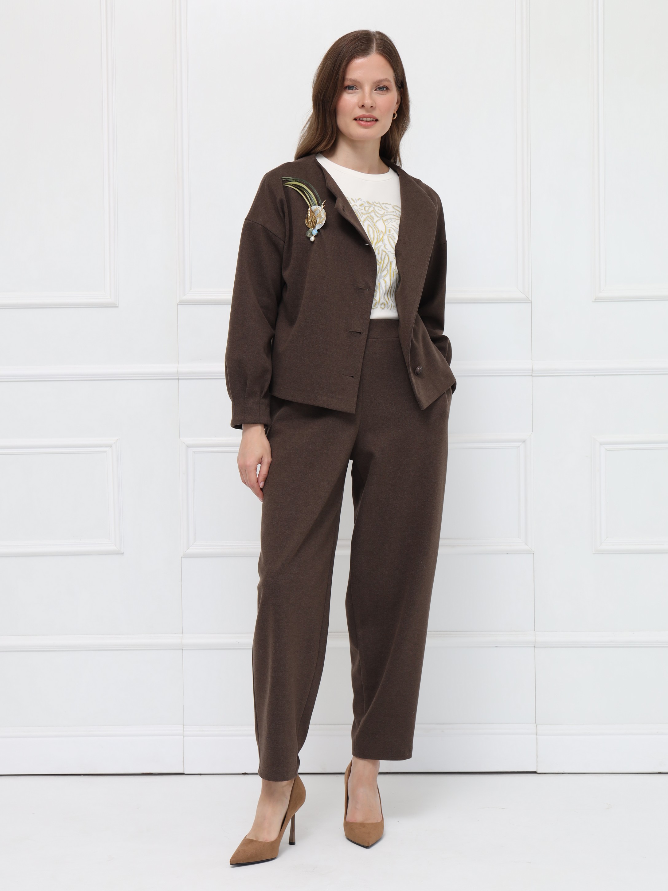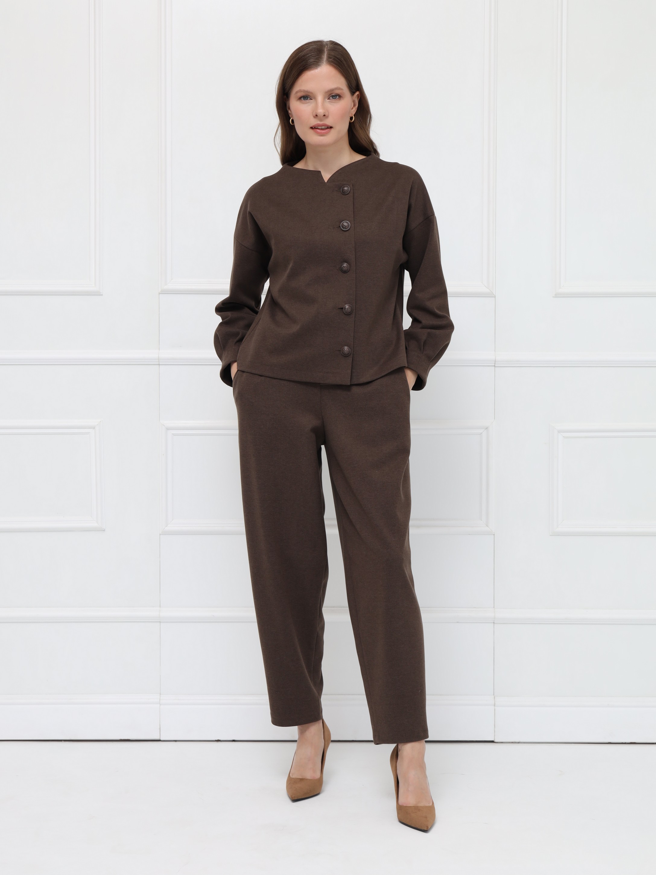 Брюки-карроты из плотного коричневого трикотажа — мягкие, тёплые и немнущиеся. Силуэт с объёмом в верхней части и заужением книзу, визуально вытягивает ноги и подчёркивает талию. Свободная посадка и широкий пояс с эластичной резинкой по спинке обеспечивают комфорт в течение дня. Скрытые карманы в боковых швах — лаконичное и практичное решение.