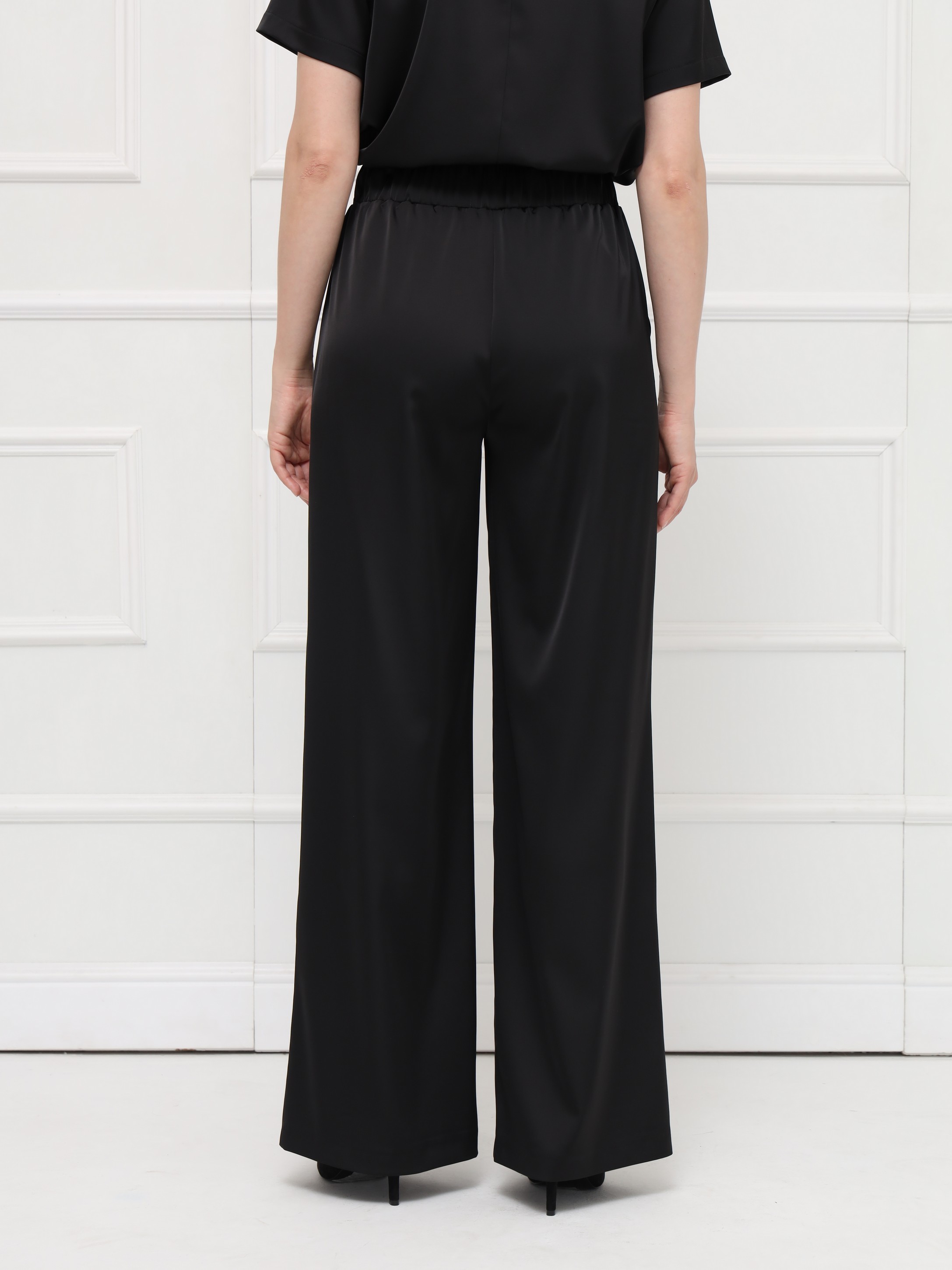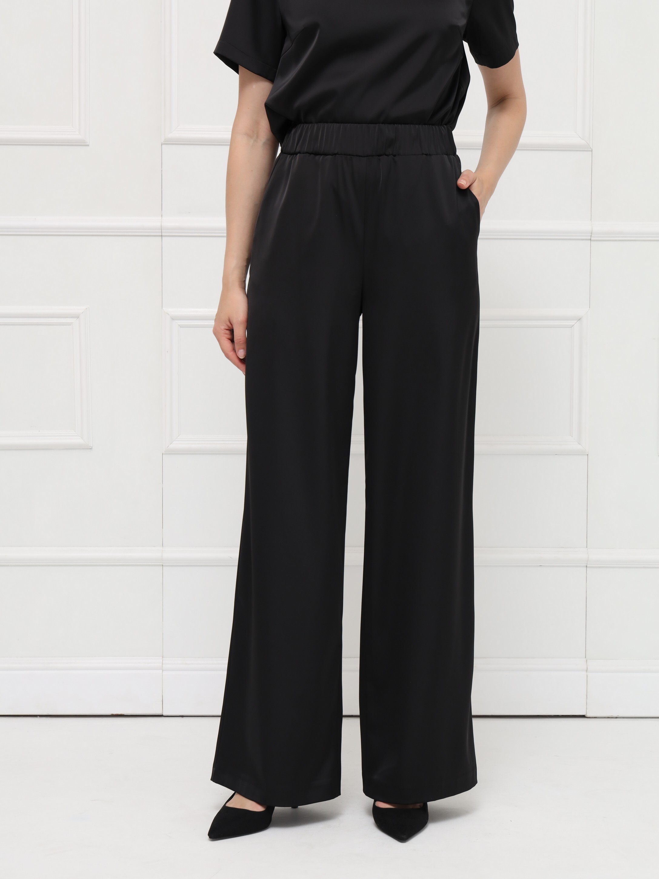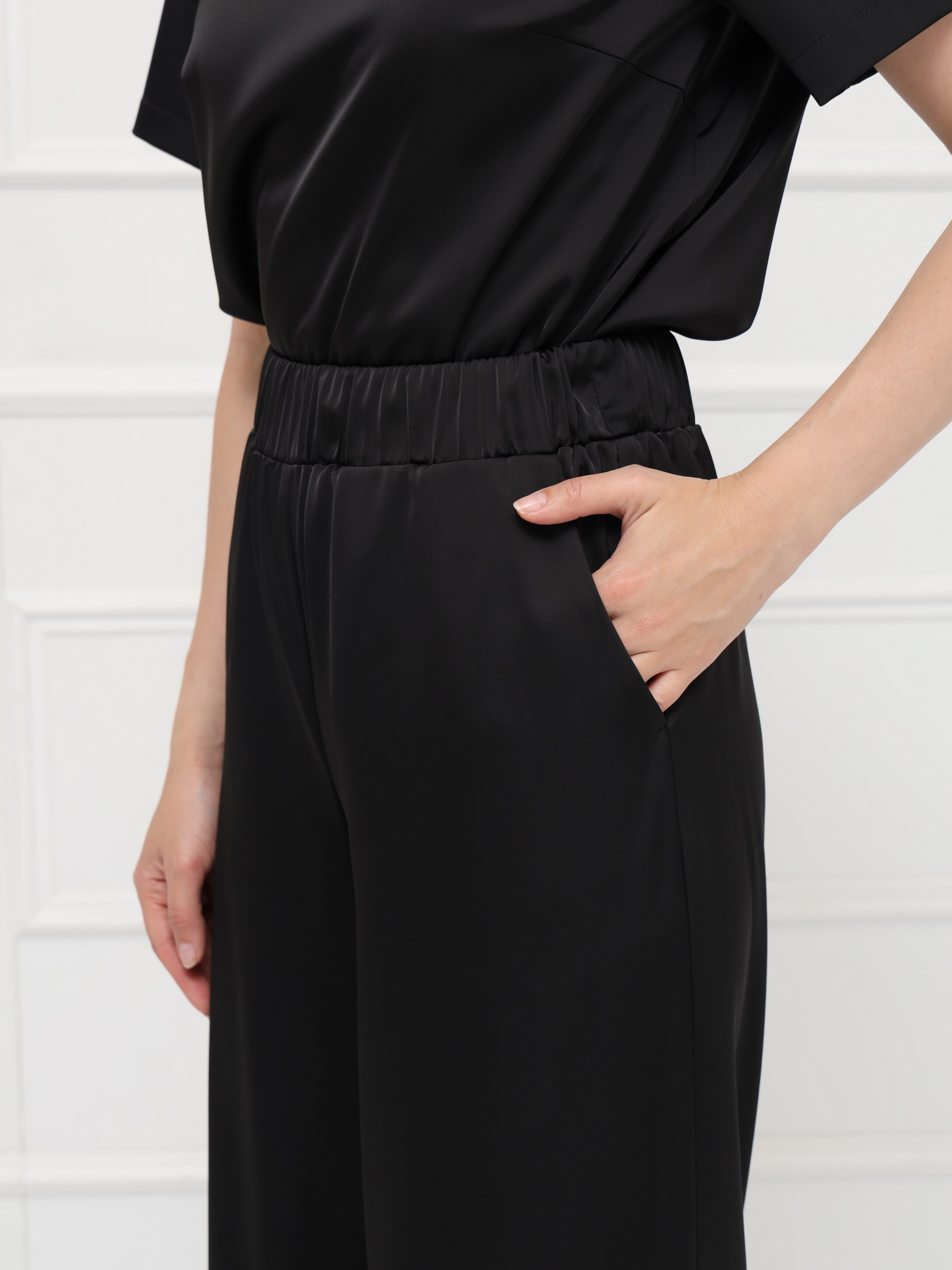 Элегантные брюки, выполненные из гладкого черного атласа, красиво струятся при движении, создавая эффектный силуэт. Прямой крой визуально вытягивает ноги, а широкий пояс с резинкой внутри обеспечивает комфортную посадку. Удобные боковые карманы добавляют практичности. Идеальный выбор для стильных вечерних образов.