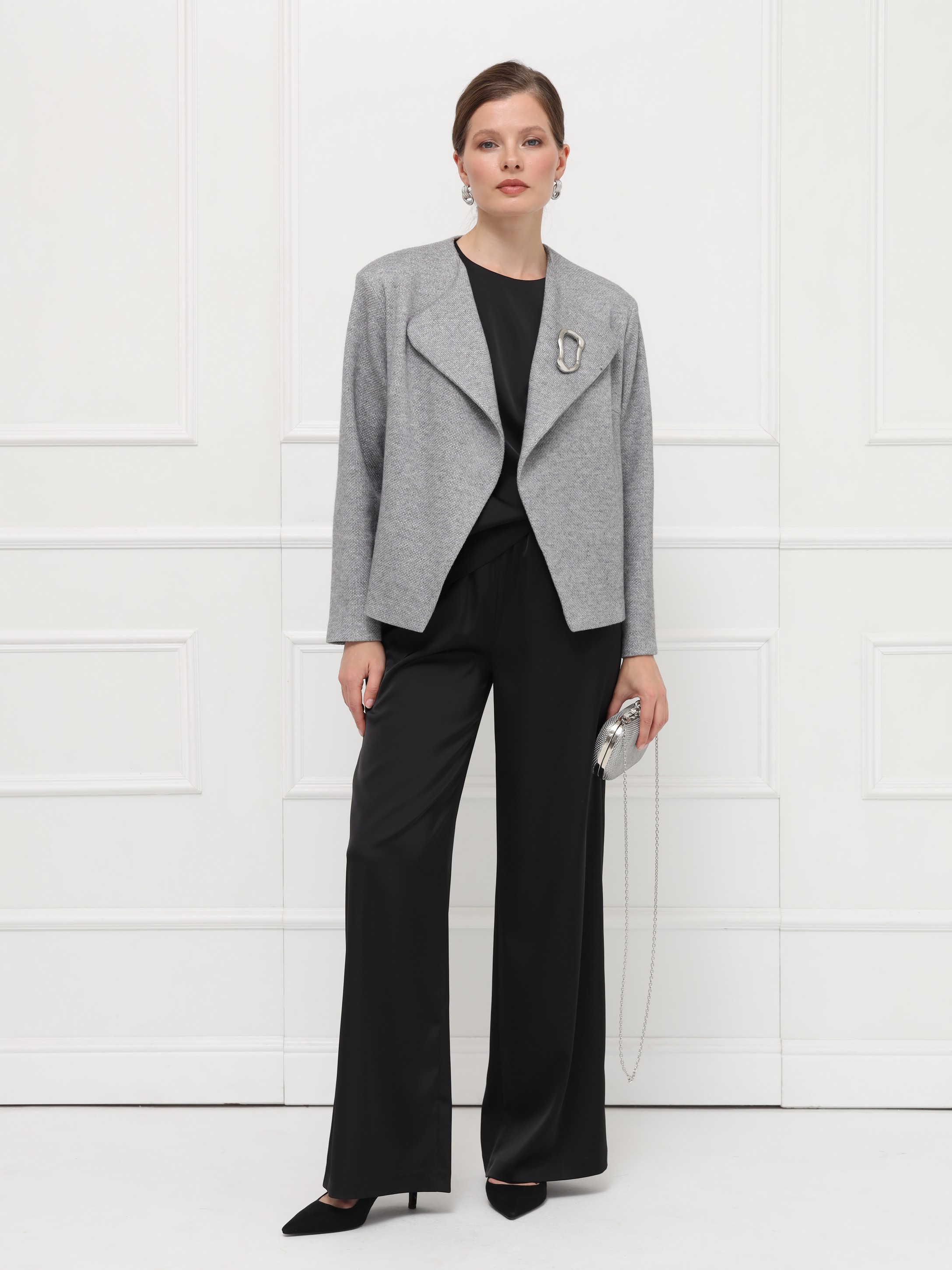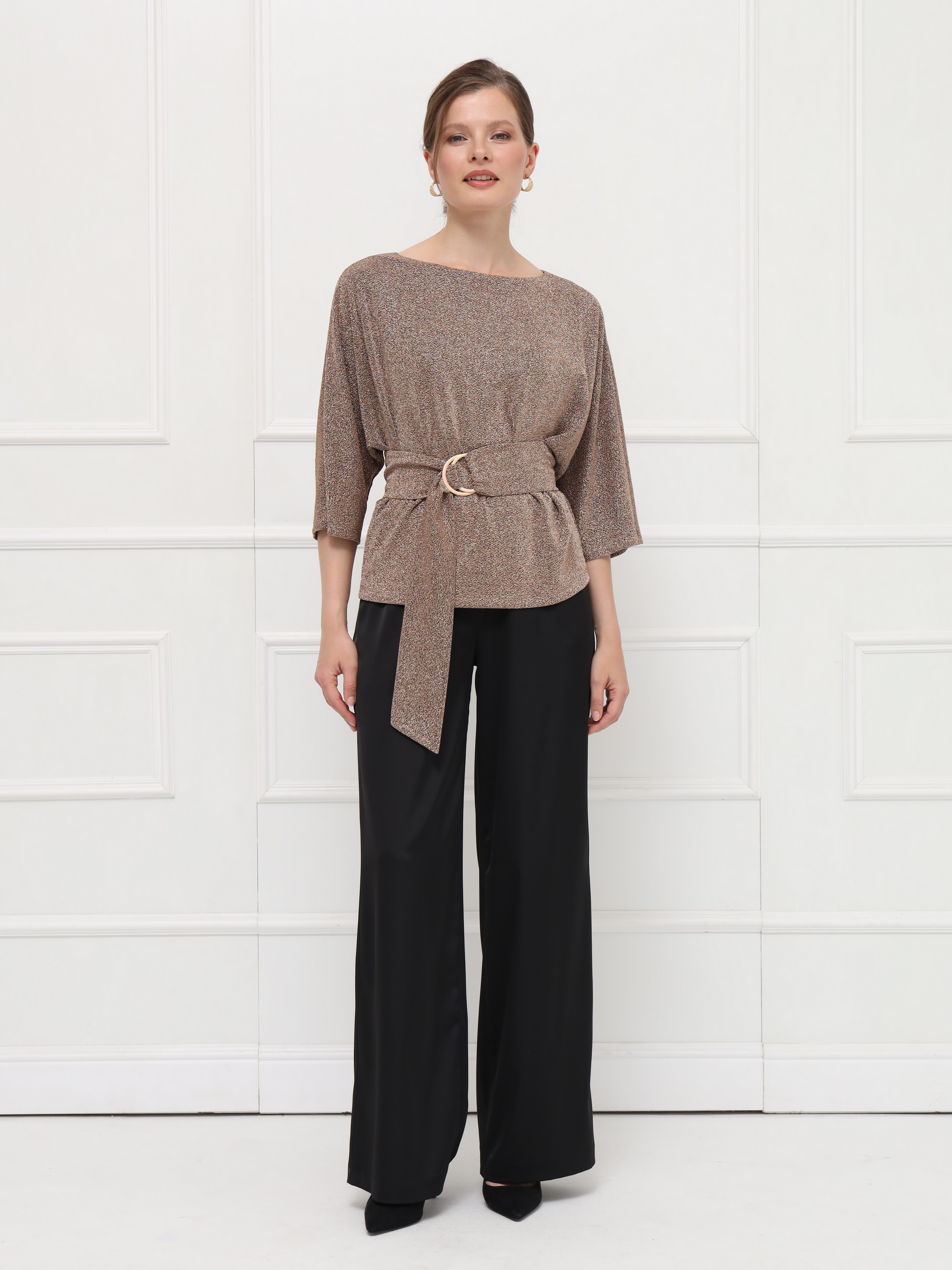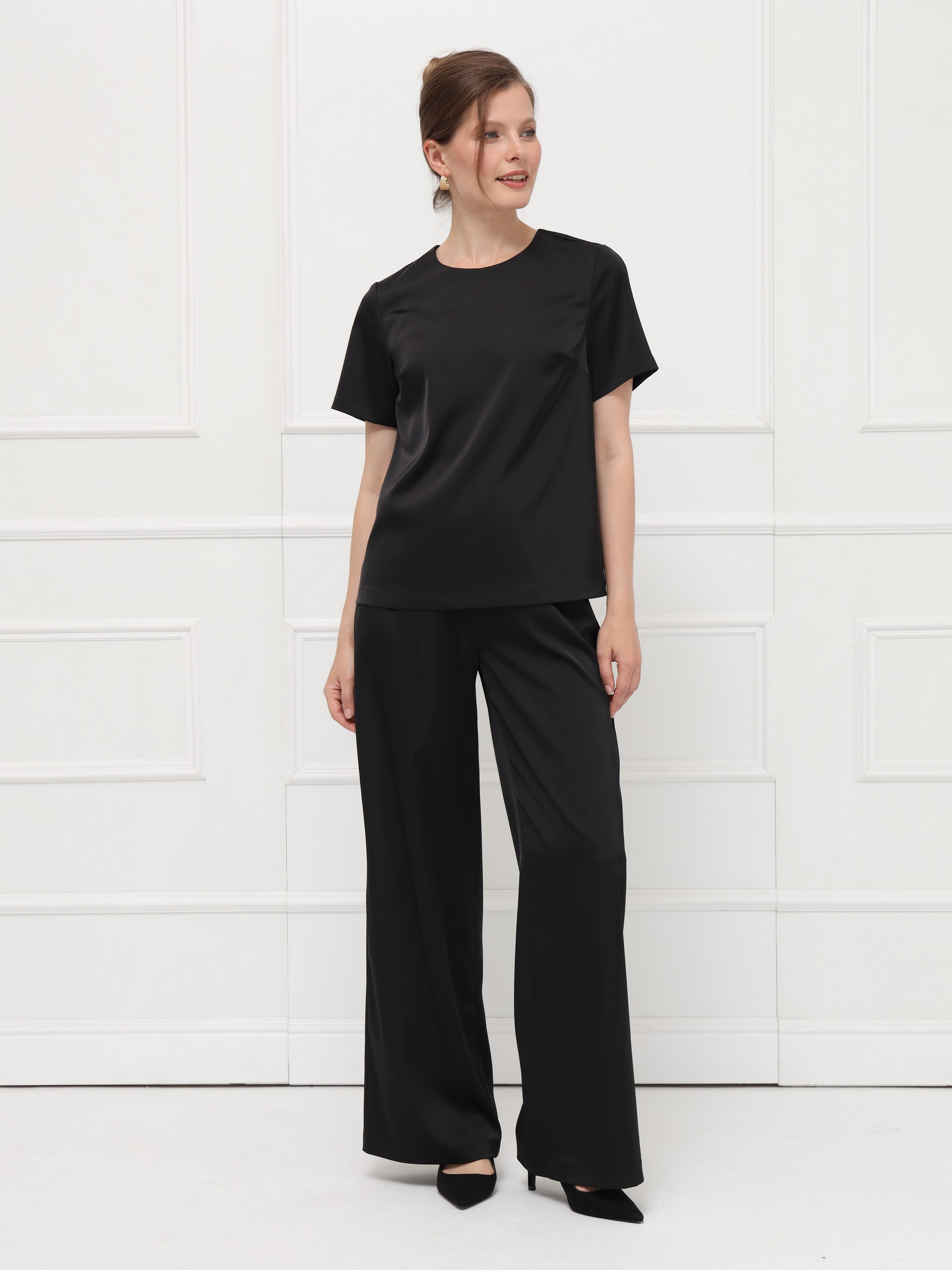 Элегантные брюки, выполненные из гладкого черного атласа, красиво струятся при движении, создавая эффектный силуэт. Прямой крой визуально вытягивает ноги, а широкий пояс с резинкой внутри обеспечивает комфортную посадку. Удобные боковые карманы добавляют практичности. Идеальный выбор для стильных вечерних образов.