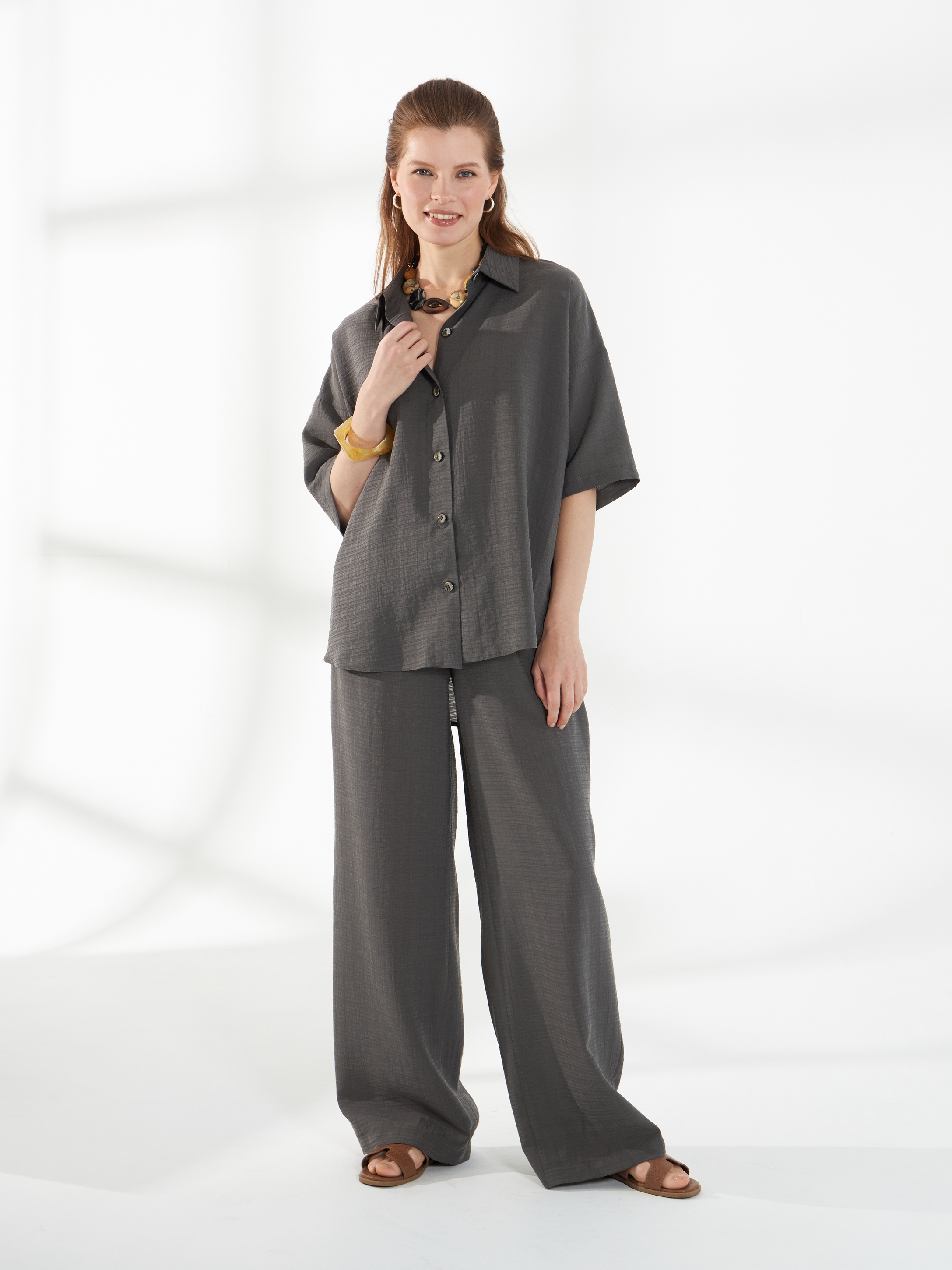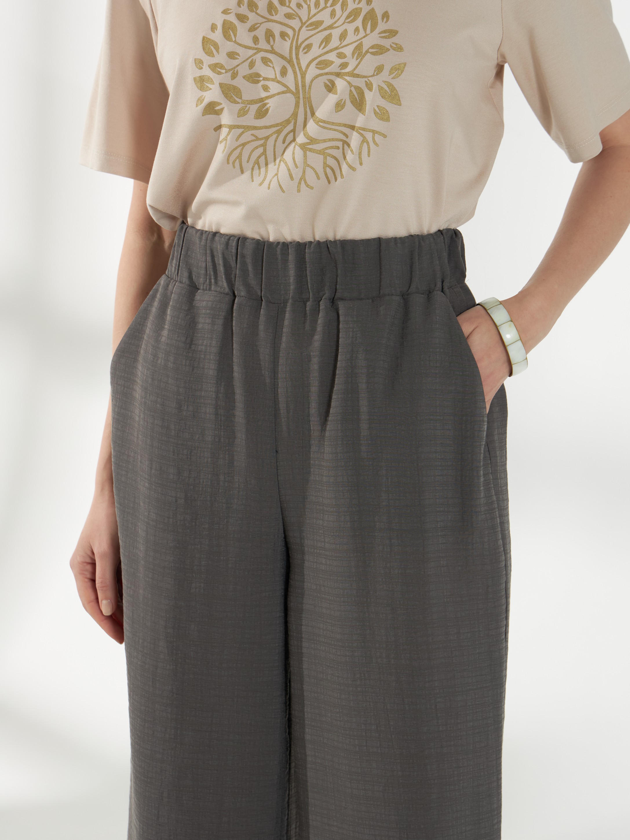 Свободные брюки из серо-зеленого тонкого вискозного полотна с комфортным поясом, в который встроена резинка. Модель без застежки, с удобными боковыми карманами, обеспечивает легкость движения и свободный силуэт.
