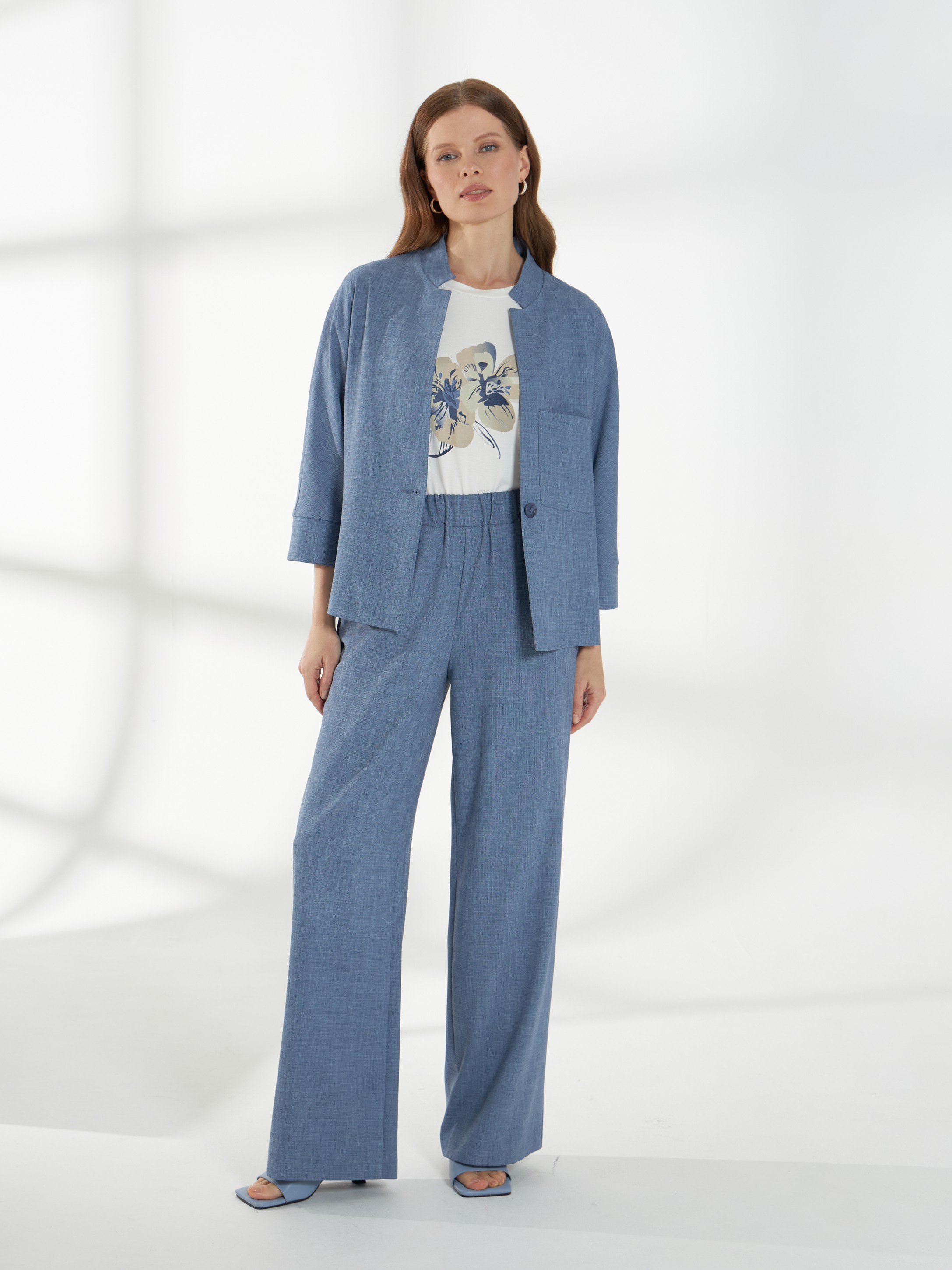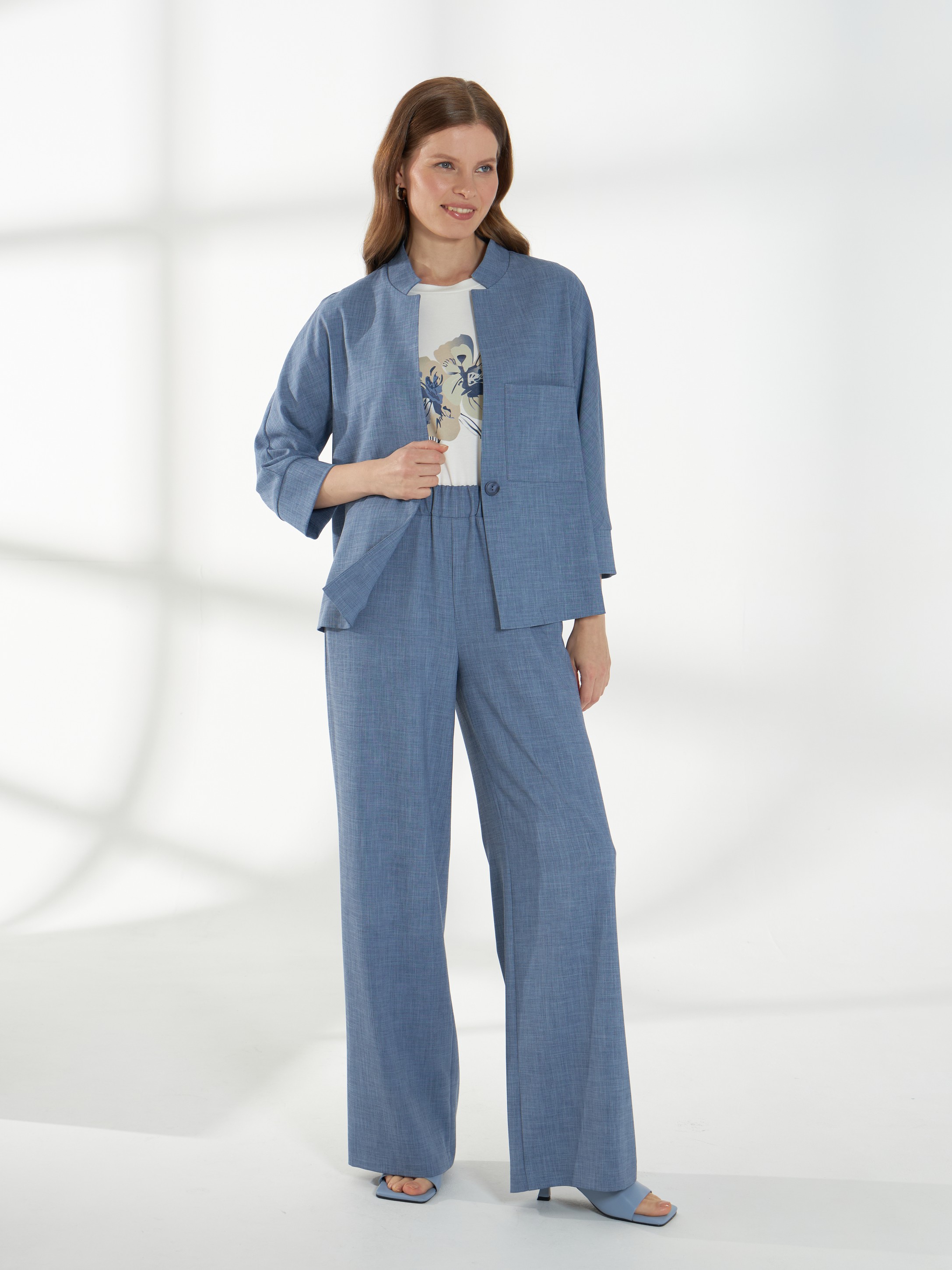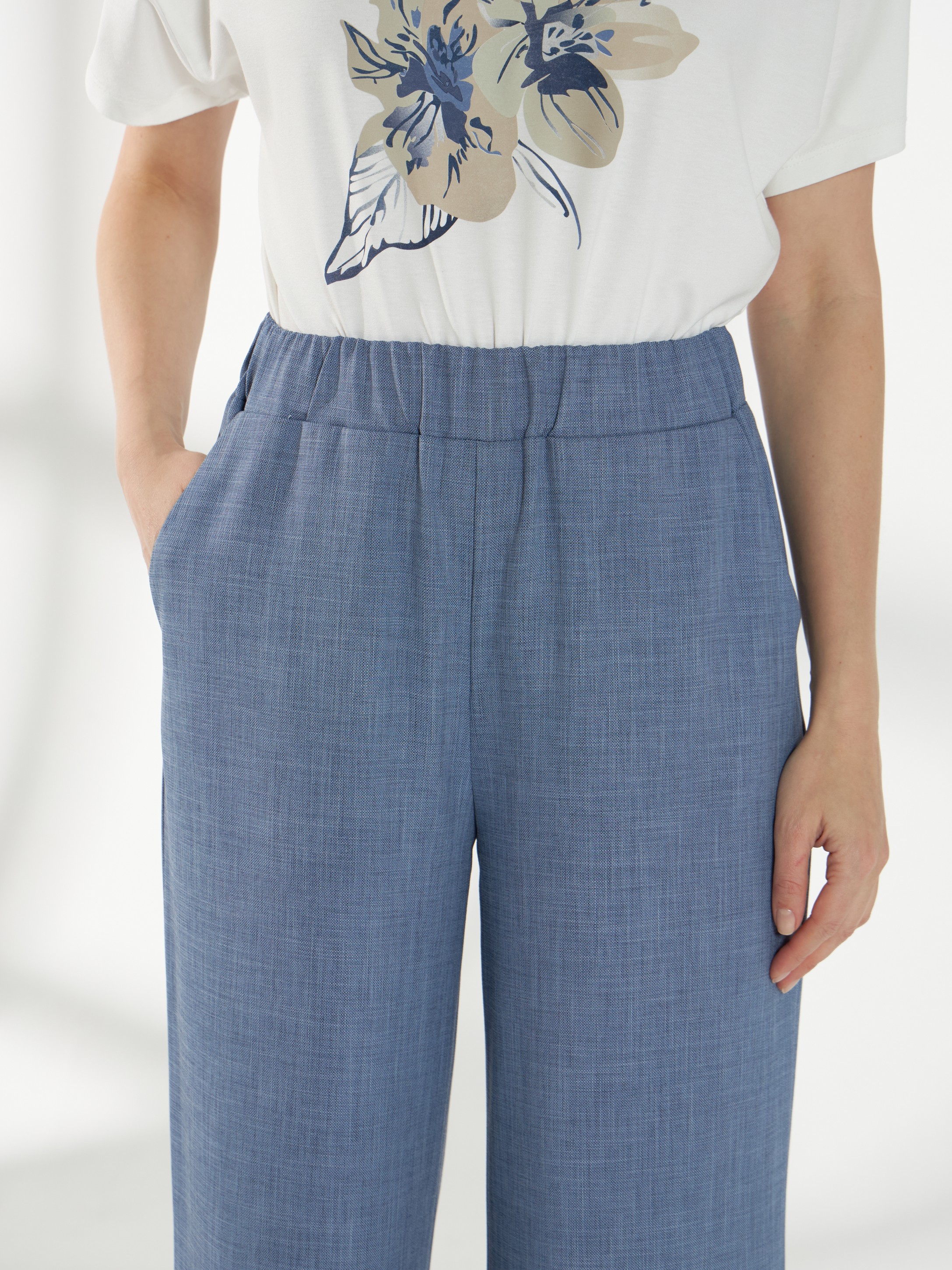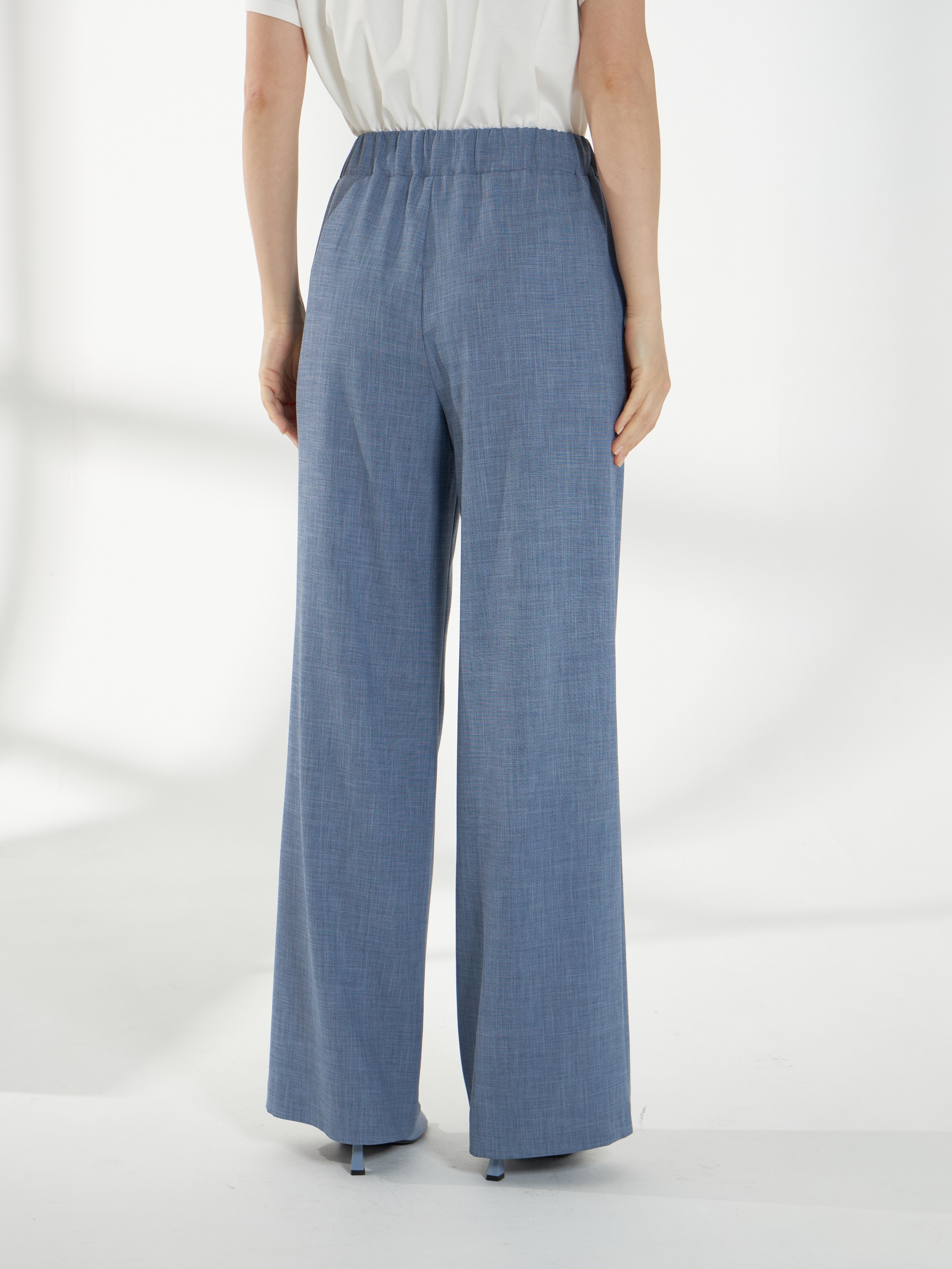 Широкие брюки из тонкой костюмной ткани в голубом оттенке-комфортная модель на каждый день. Свободный силуэт обеспечивает легкость движения и создает мягкую, современную линию. Модель без застежки, с эластичным поясом для удобной посадки. По бокам предусмотрены функциональные карманы.