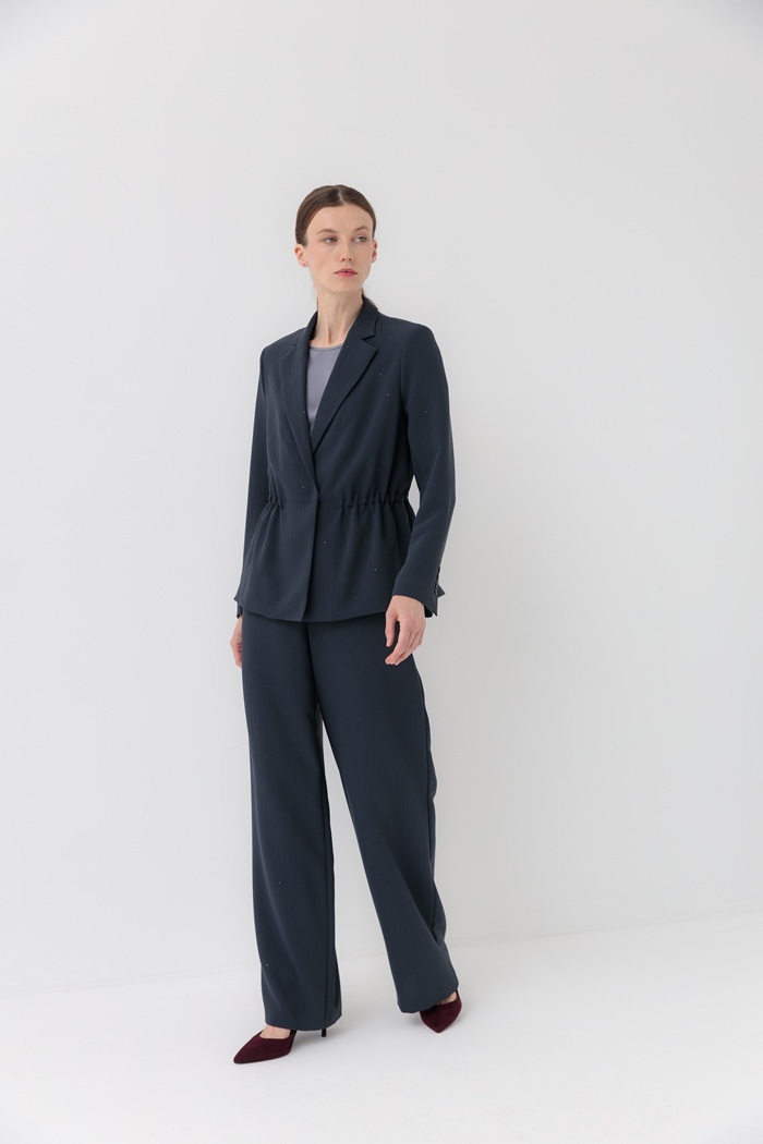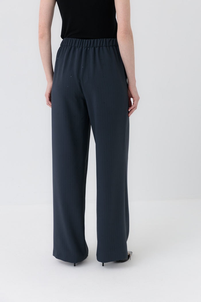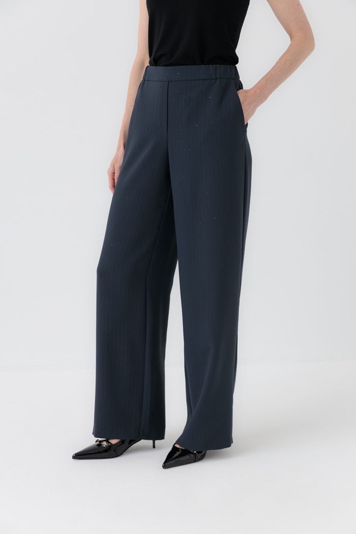 Брюки «ЛЕККО» — воплощение сдержанной элегантности. Глубокий тёмно-синий оттенок с тонкой полоской придаёт модели особый шарм, а свободный крой создаёт ощущение лёгкости и комфорта. Высокая посадка подчёркивает талию, визуально вытягивая силуэт, а плавные линии штанин добавляют образу утончённости. Эти брюки идеально сочетаются с лаконичными топами и классическими лодочками — безупречный выбор для делового стиля или стильных повседневных образов. Совершенство в деталях, стиль в простоте!
